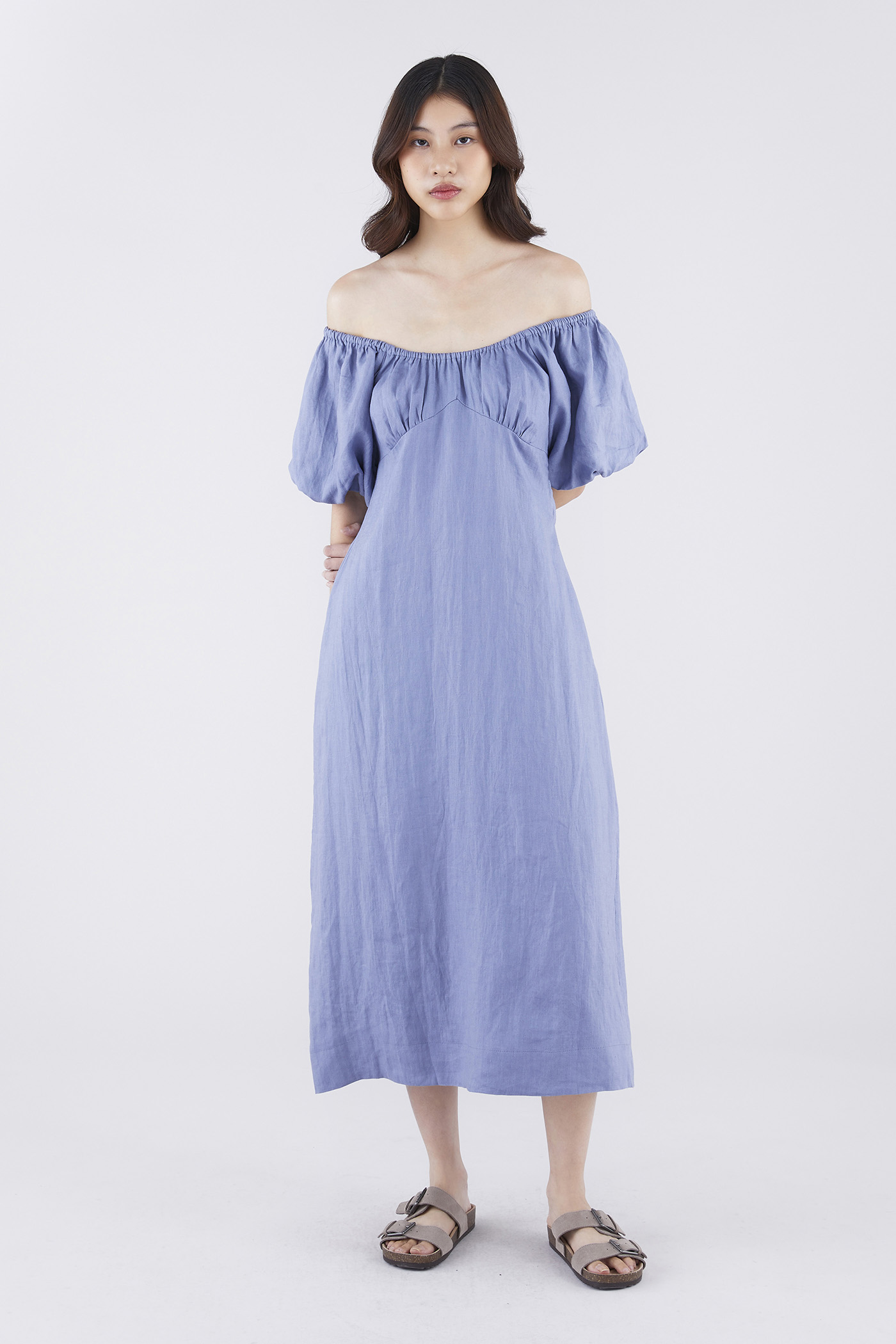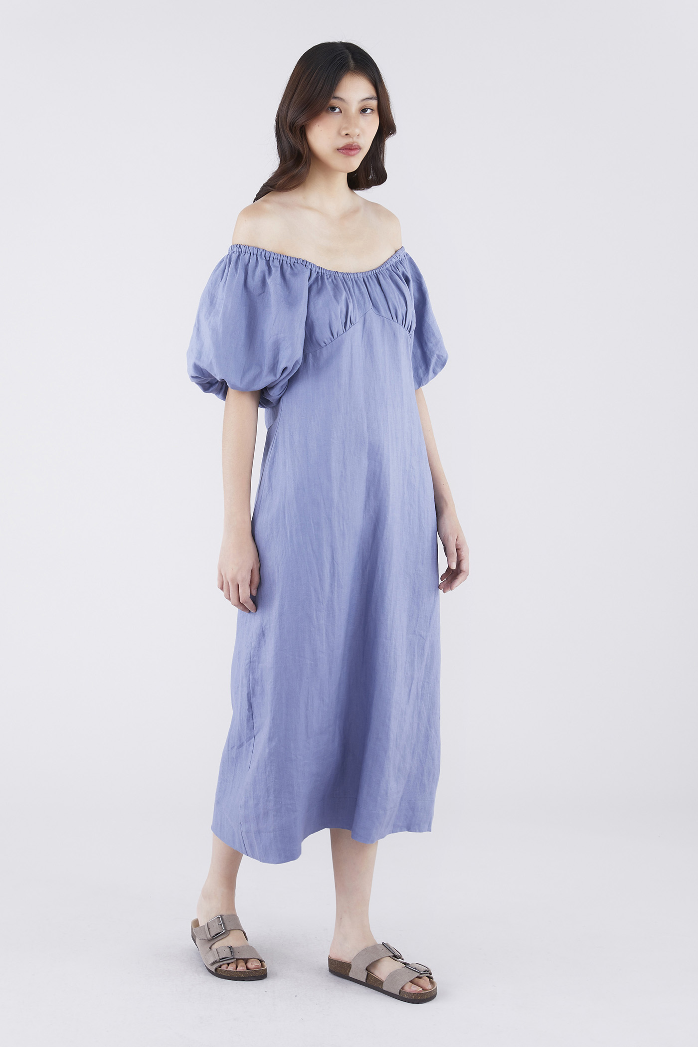 Big sleeve energy. Made from airy and softly structured linen, this midi-to-maxi dress features a ruched bust, a side zip closure and short puffed sleeves that may be styled on or off the shoulders. Fits relaxed in a waistless tent silhouette.