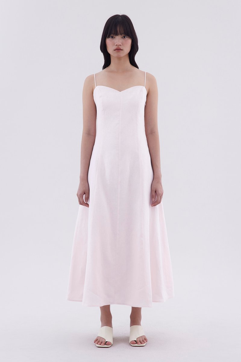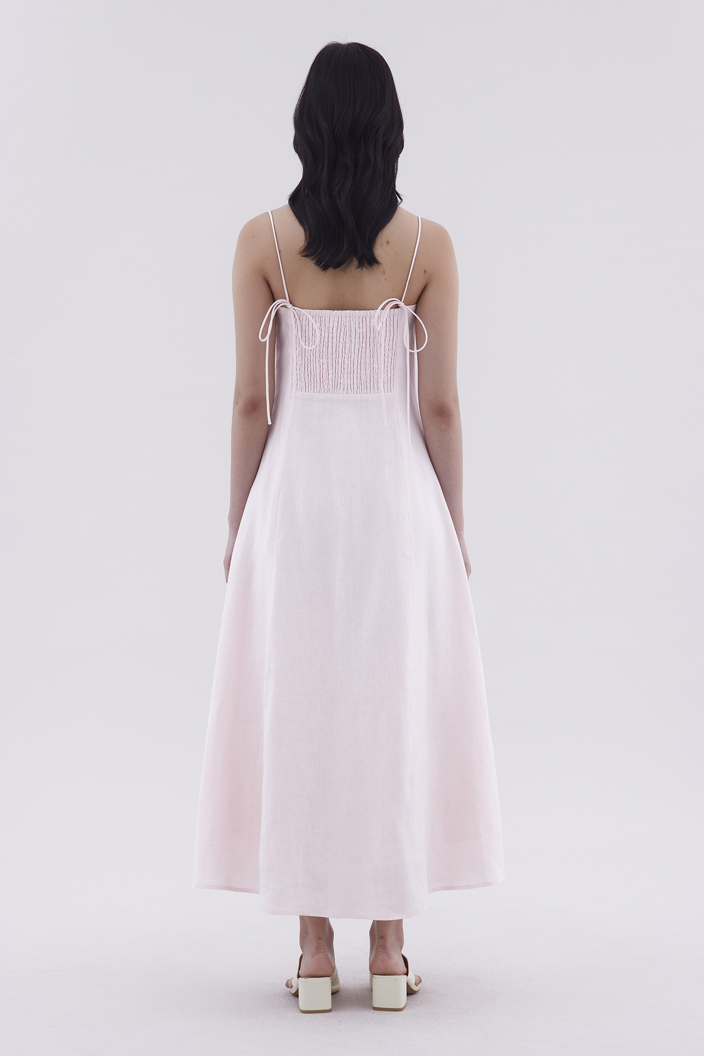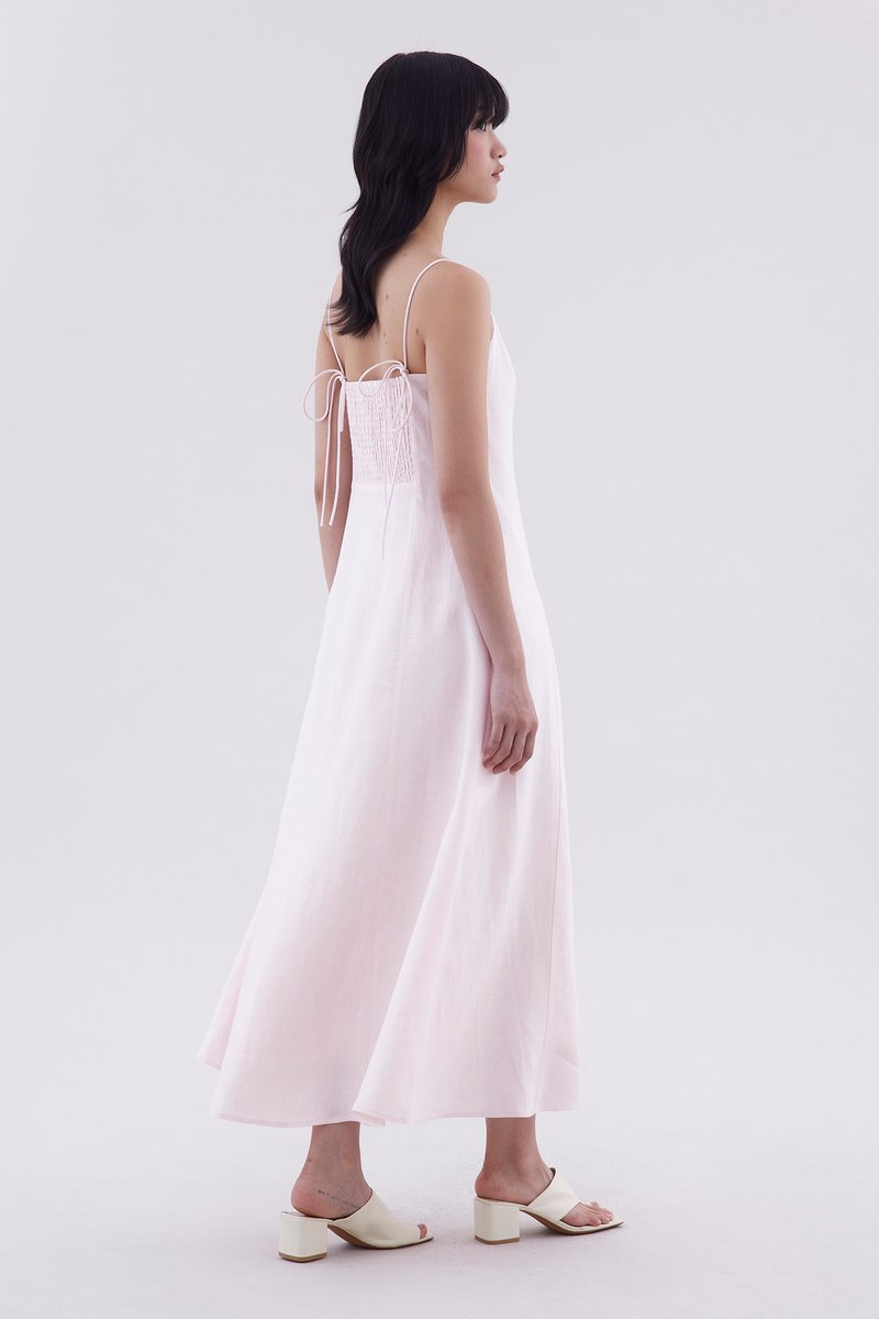 For sunny days. Cut from airy and gently tailored 100% linen, this sleeveless slip dress features a panelled construction, a bustier neckline, slim shoulder straps with a back-tie, a stretchy smocked back and a side zip closure. Worn in a slim fit and maxi length.