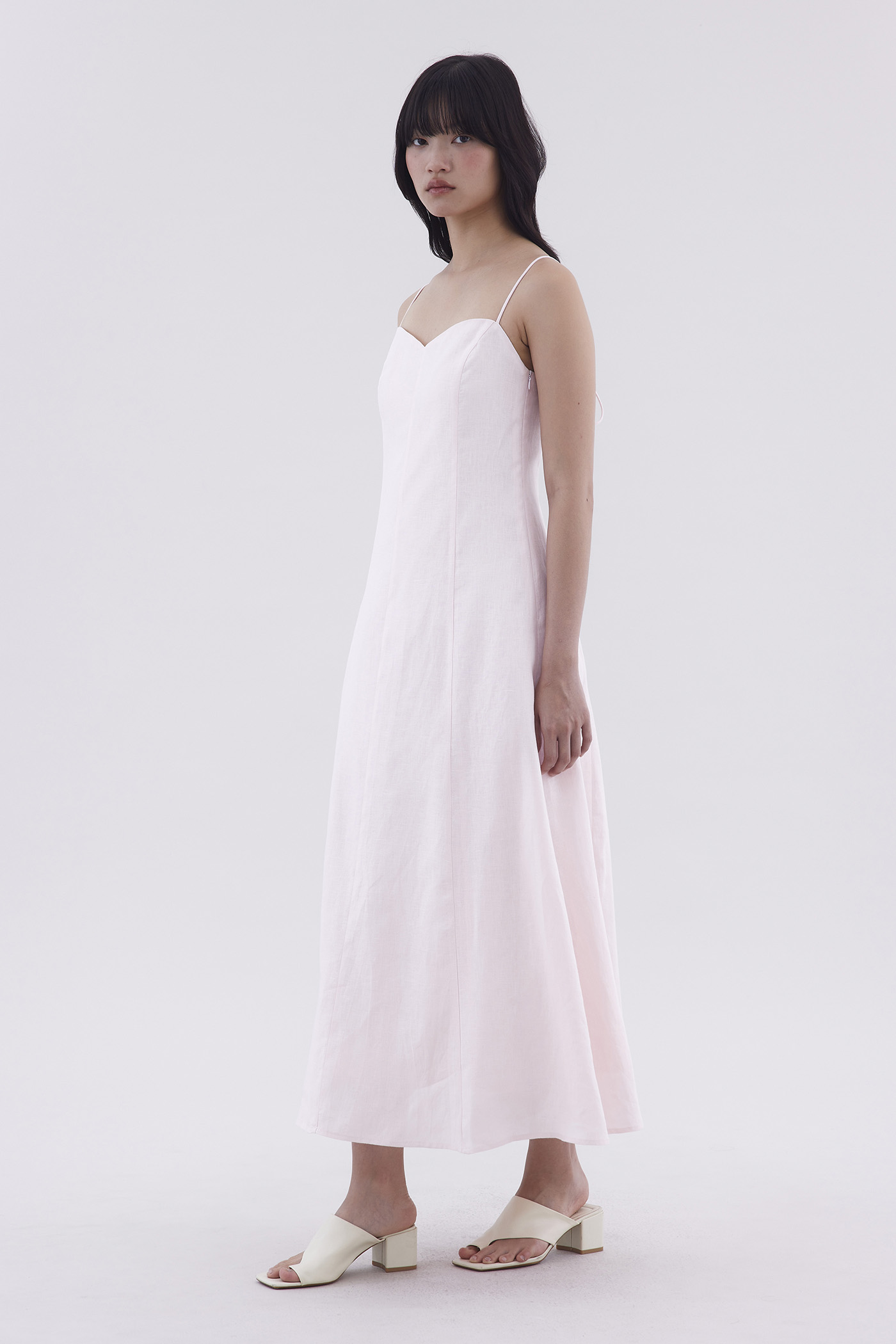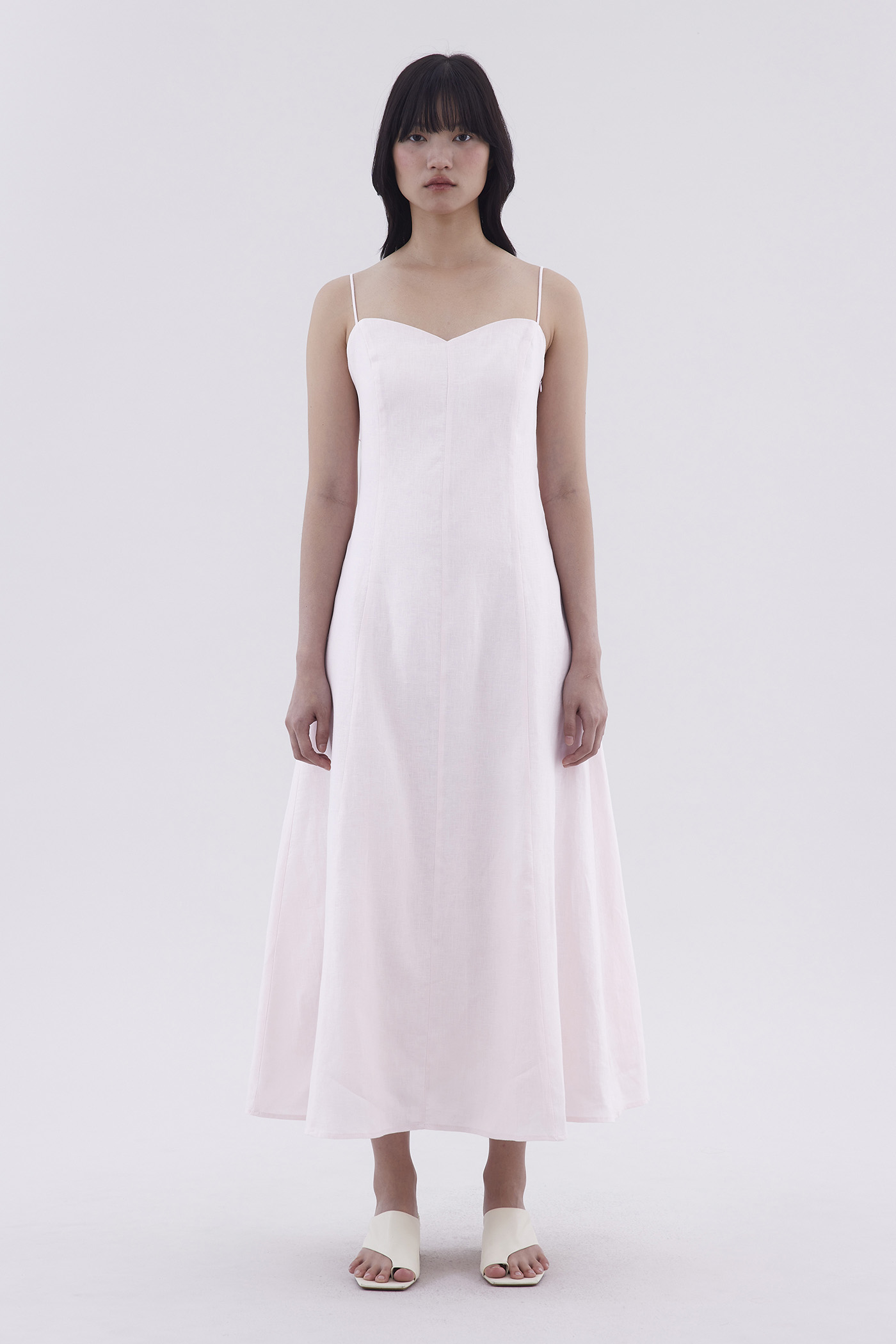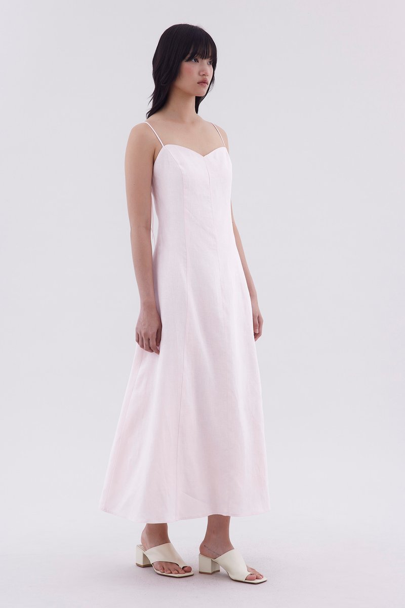For sunny days. Cut from airy and gently tailored 100% linen, this sleeveless slip dress features a panelled construction, a bustier neckline, slim shoulder straps with a back-tie, a stretchy smocked back and a side zip closure. Worn in a slim fit and maxi length.