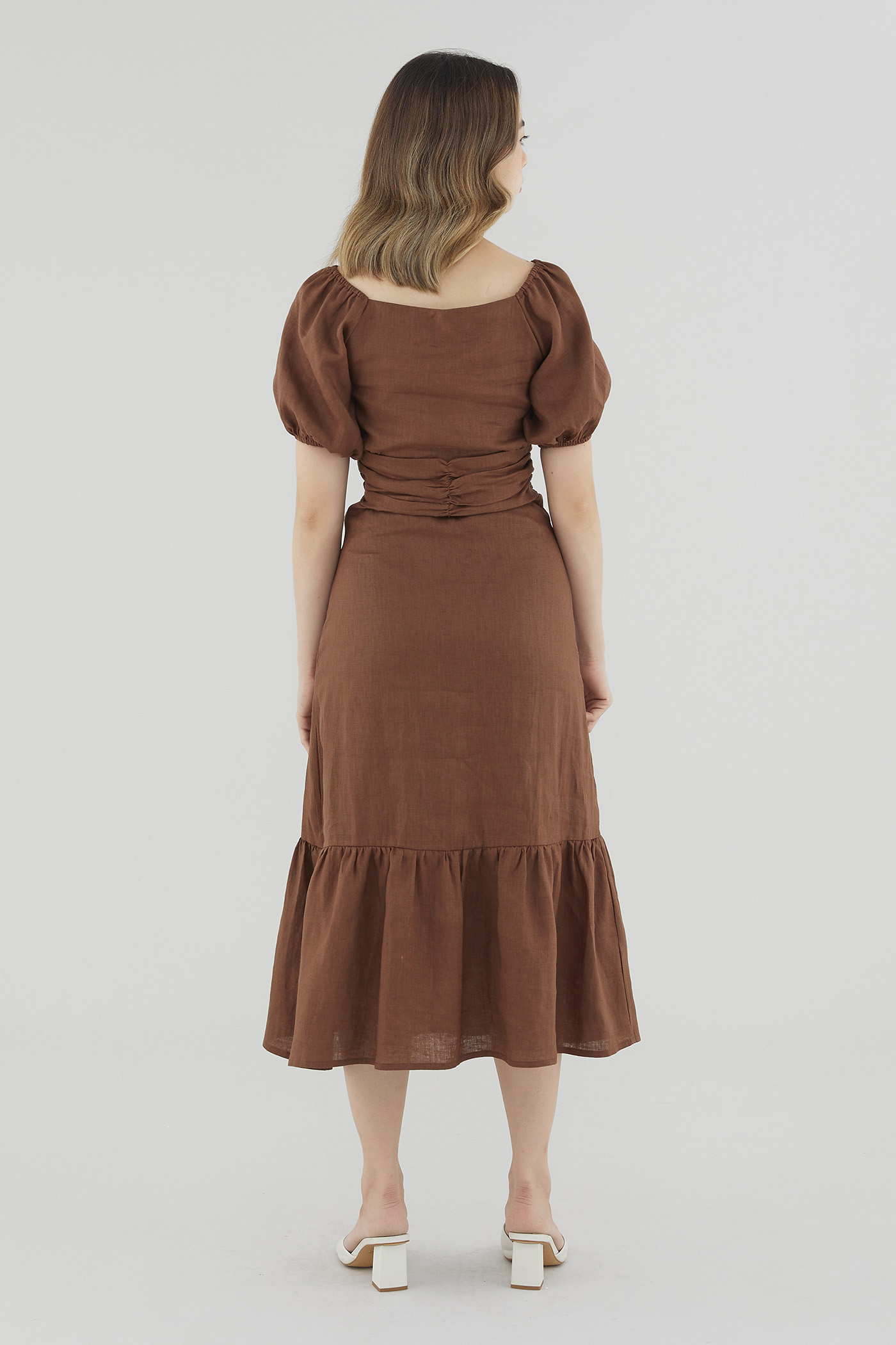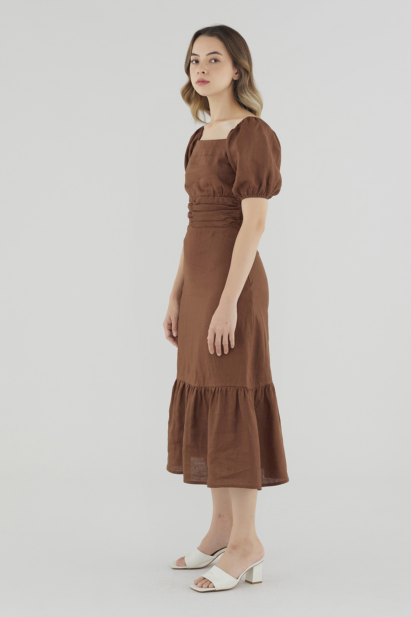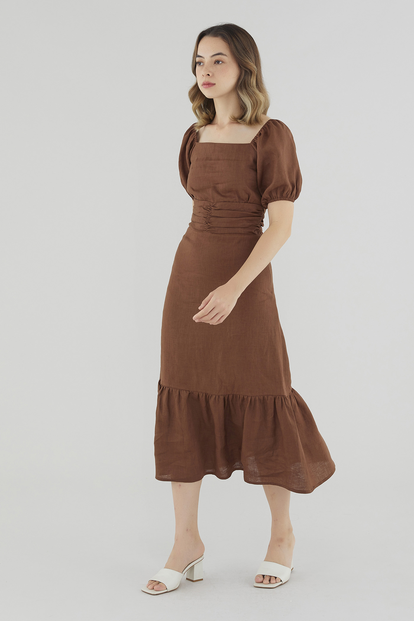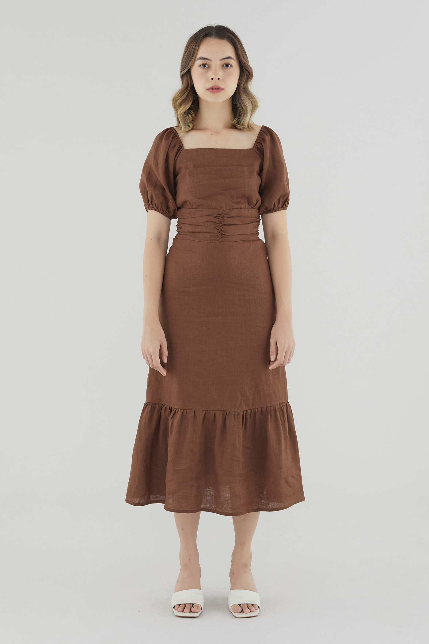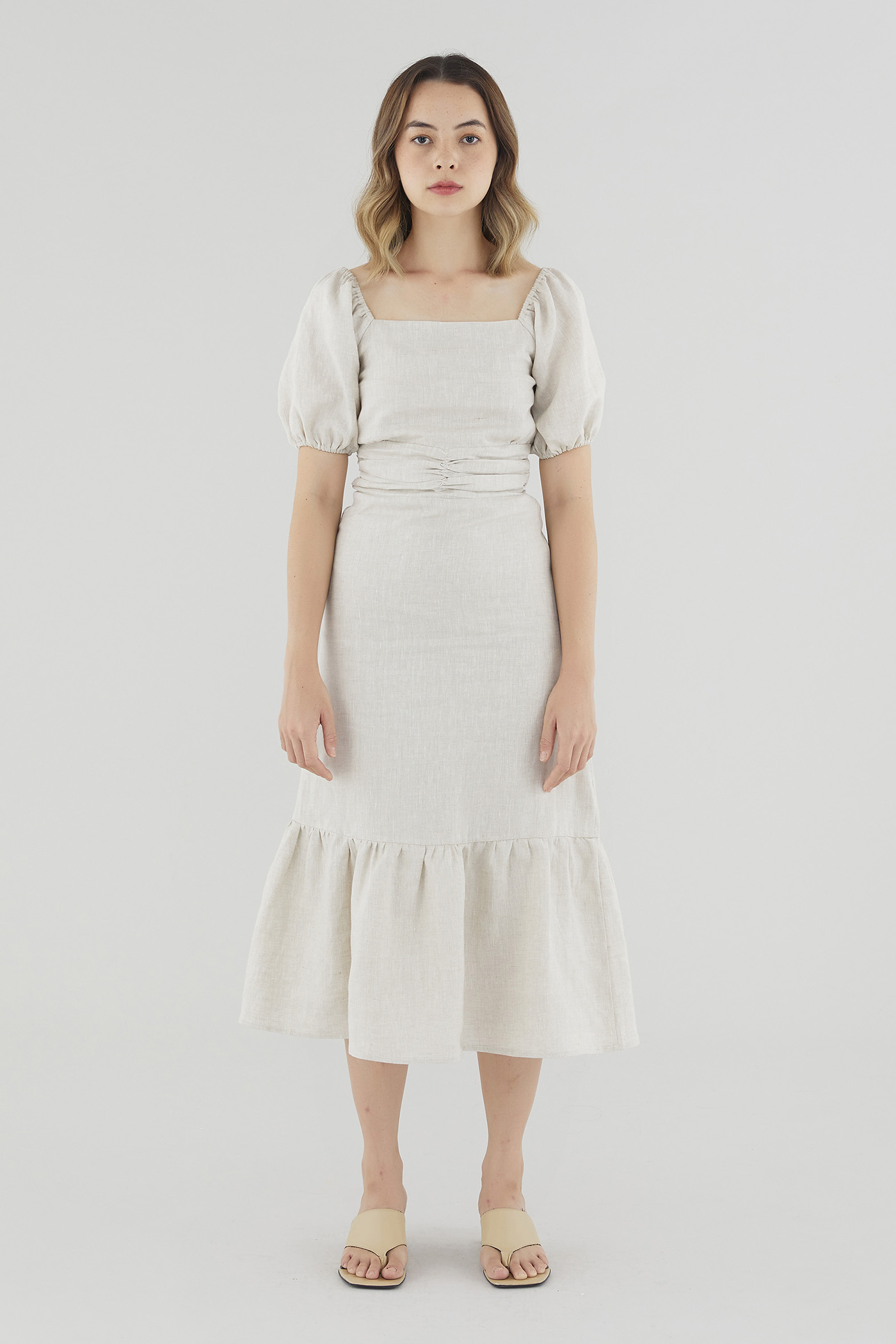 Gentle textures. Cut from airy and lightweight 100% linen, this drop-tier midi dress features a ruched waist, short puffed sleeves with a stretchy hem and a partially elasticated square neckline that may be worn on or off the shoulder. Fits slim with a zip closure on the side.