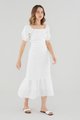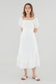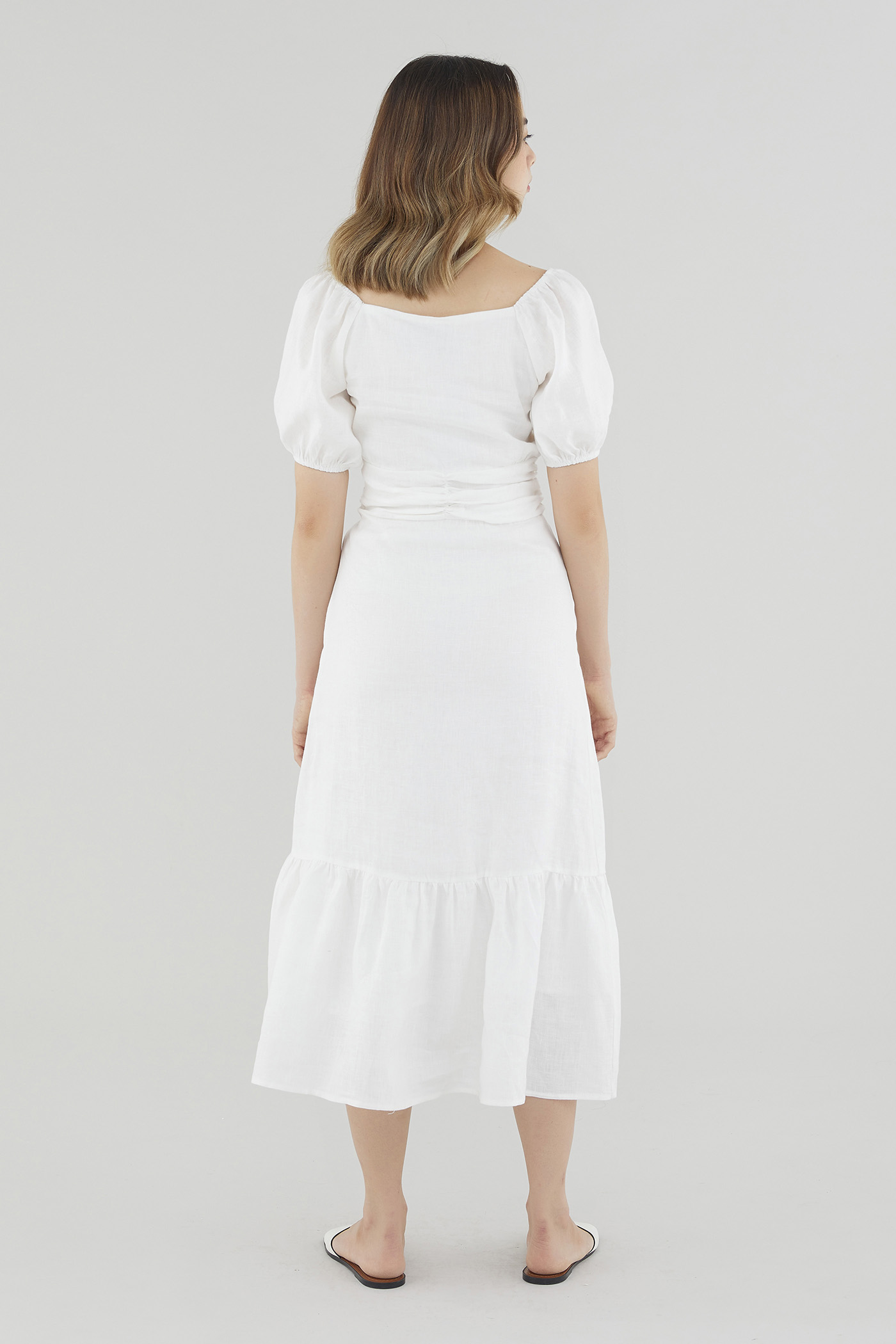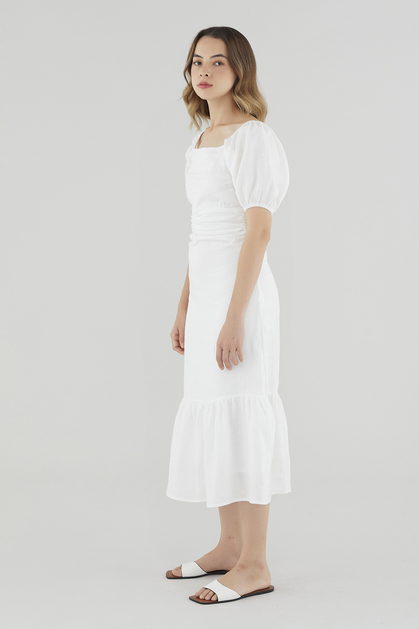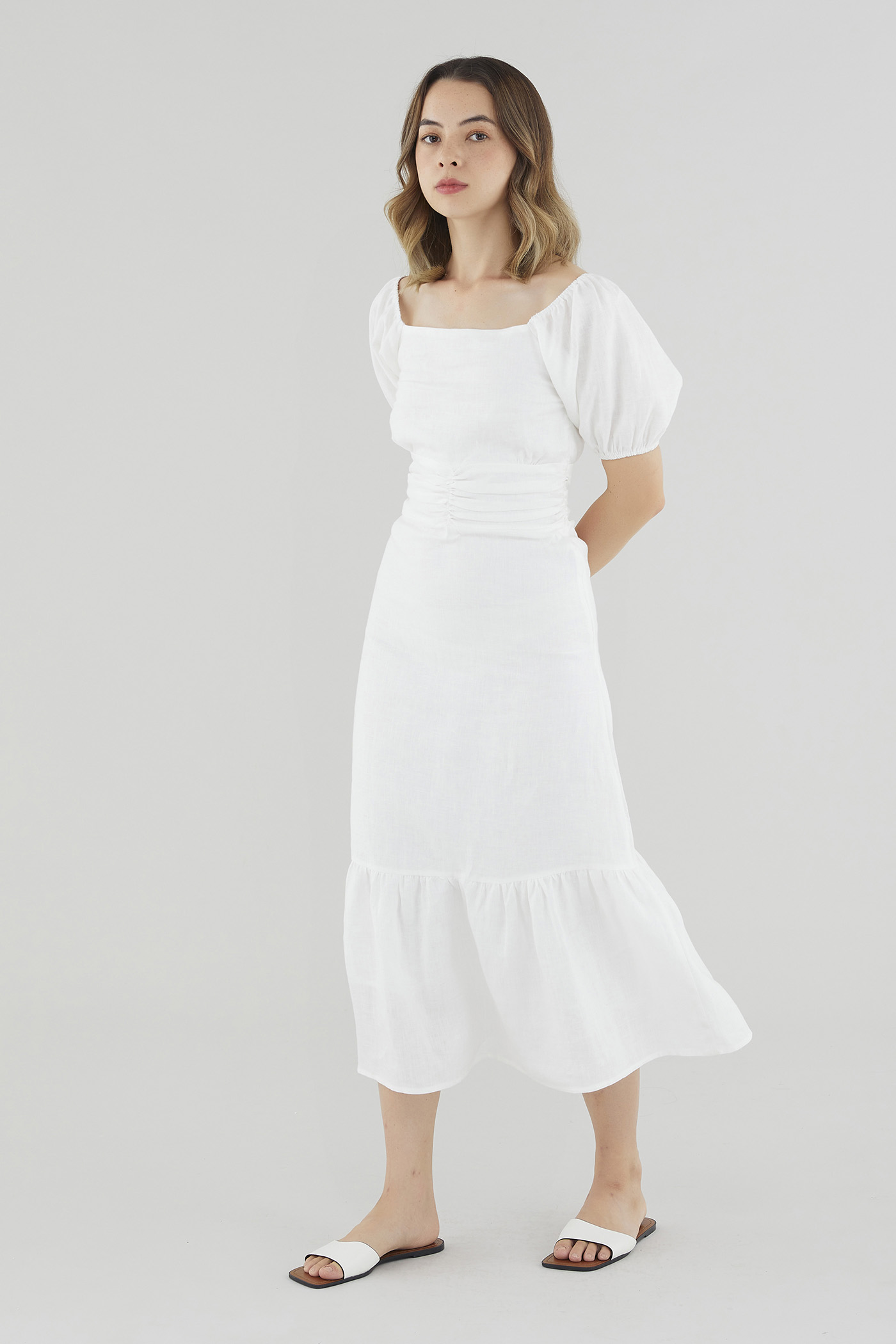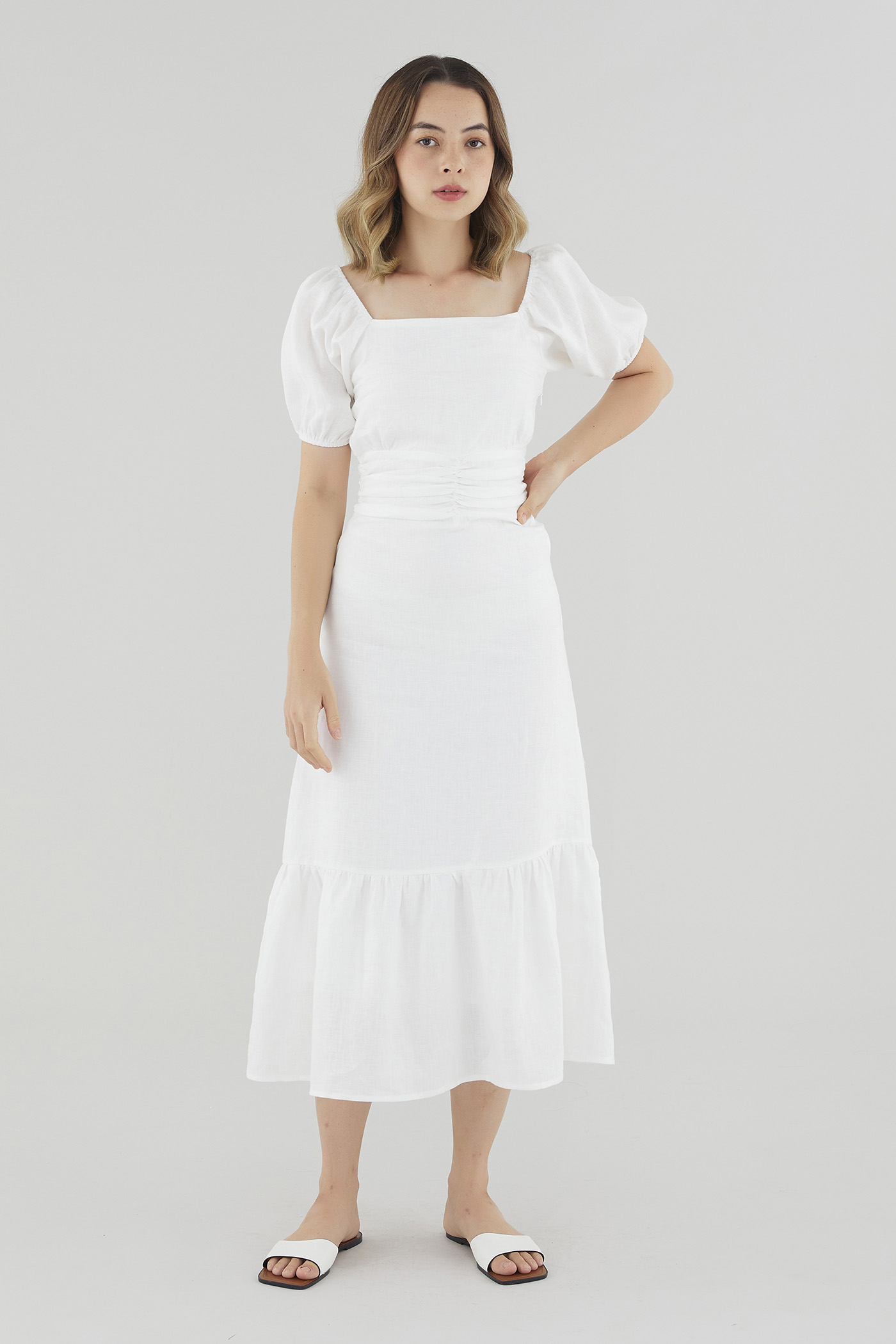 Gentle textures. Cut from airy and lightweight 100% linen, this drop-tier midi dress features a ruched waist, short puffed sleeves with a stretchy hem and a partially elasticated square neckline that may be worn on or off the shoulder. Fits slim with a zip closure on the side.