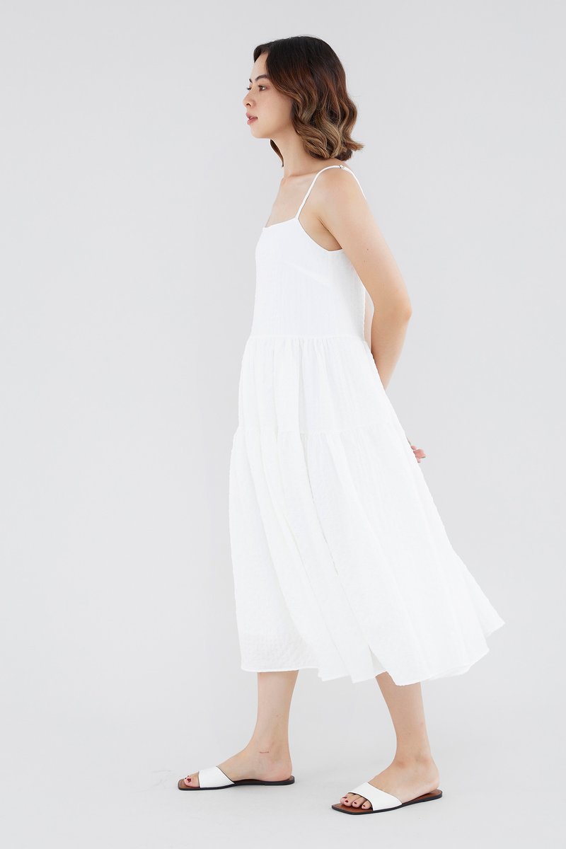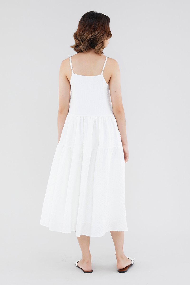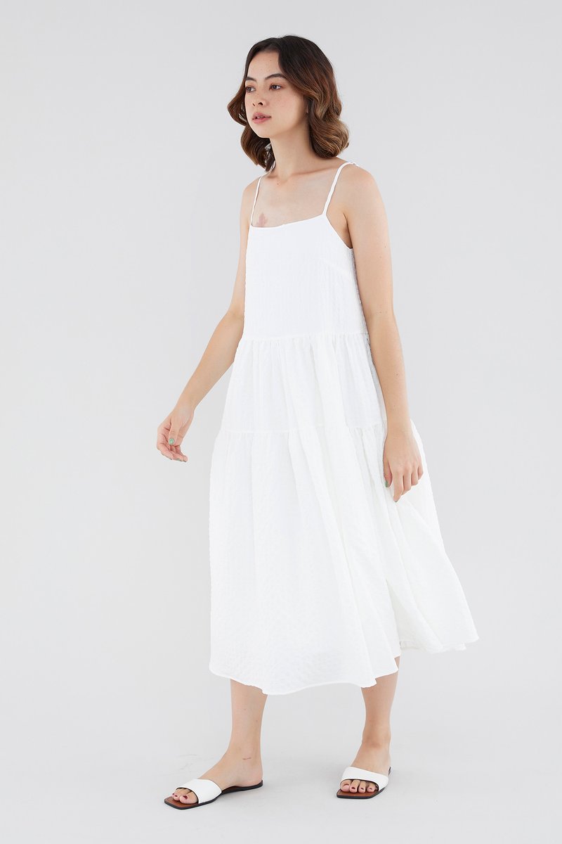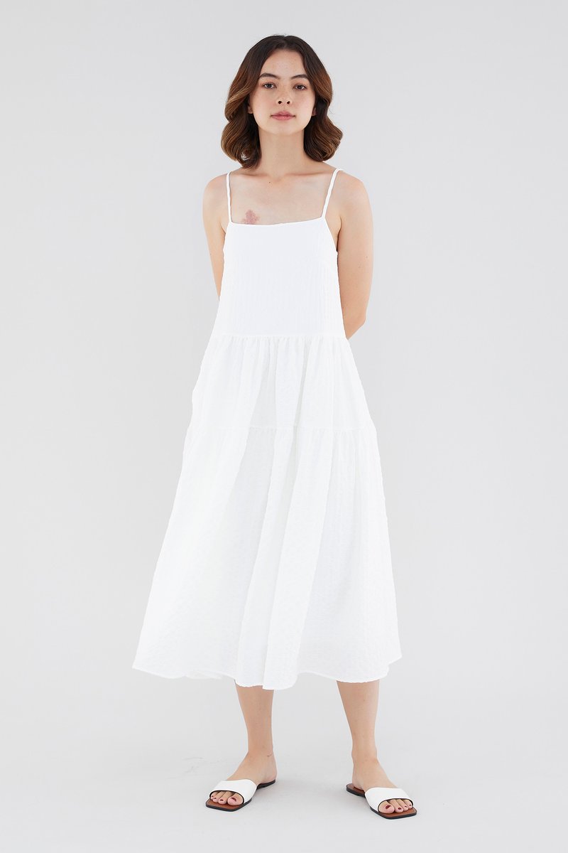 <p><span style="font-weight: 400;">Fabric Composition: 100% Polyester</span></p> <p><span style="font-weight: 400;">Lining: Full</span></p> <p><span style="font-weight: 400;">Sheerness: Opaque </span></p> <p><span style="font-weight: 400;">Pockets: None</span></p> <p><span style="font-weight: 400;">Tiered and textured. Cut from check-embossed and non-stretch fabric, this sleeveless midi dress features a straight neckline, slim adjustable straps and a flowy, tiered skirt. Worn in a relaxed, waistless fit with a zip closure on the side. </span></p> <p><span style="font-weight: 400;">Care Instructions: Do not soak / Do not bleach / Handwash or Machine wash on gentle mode / Do not machine dry / Iron using low heat</span></p>