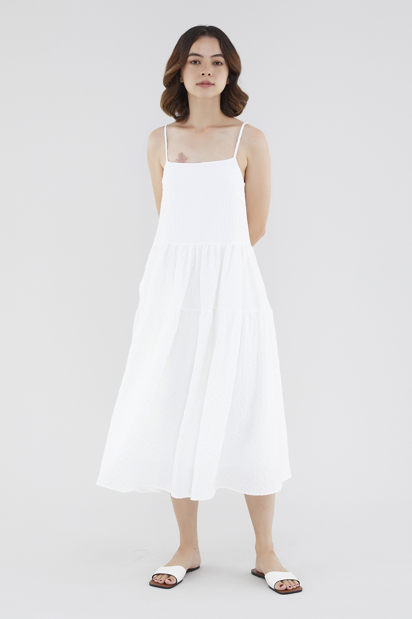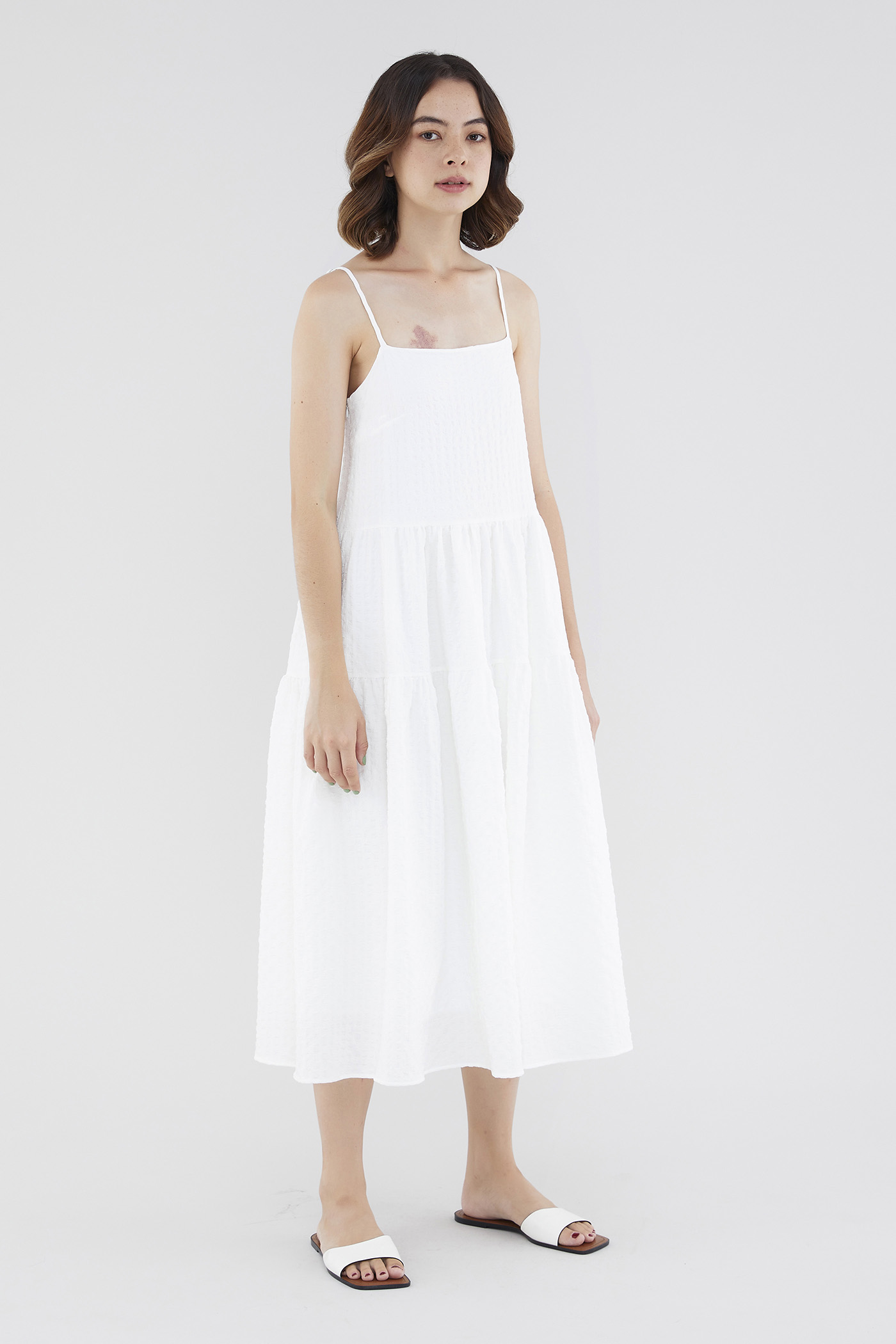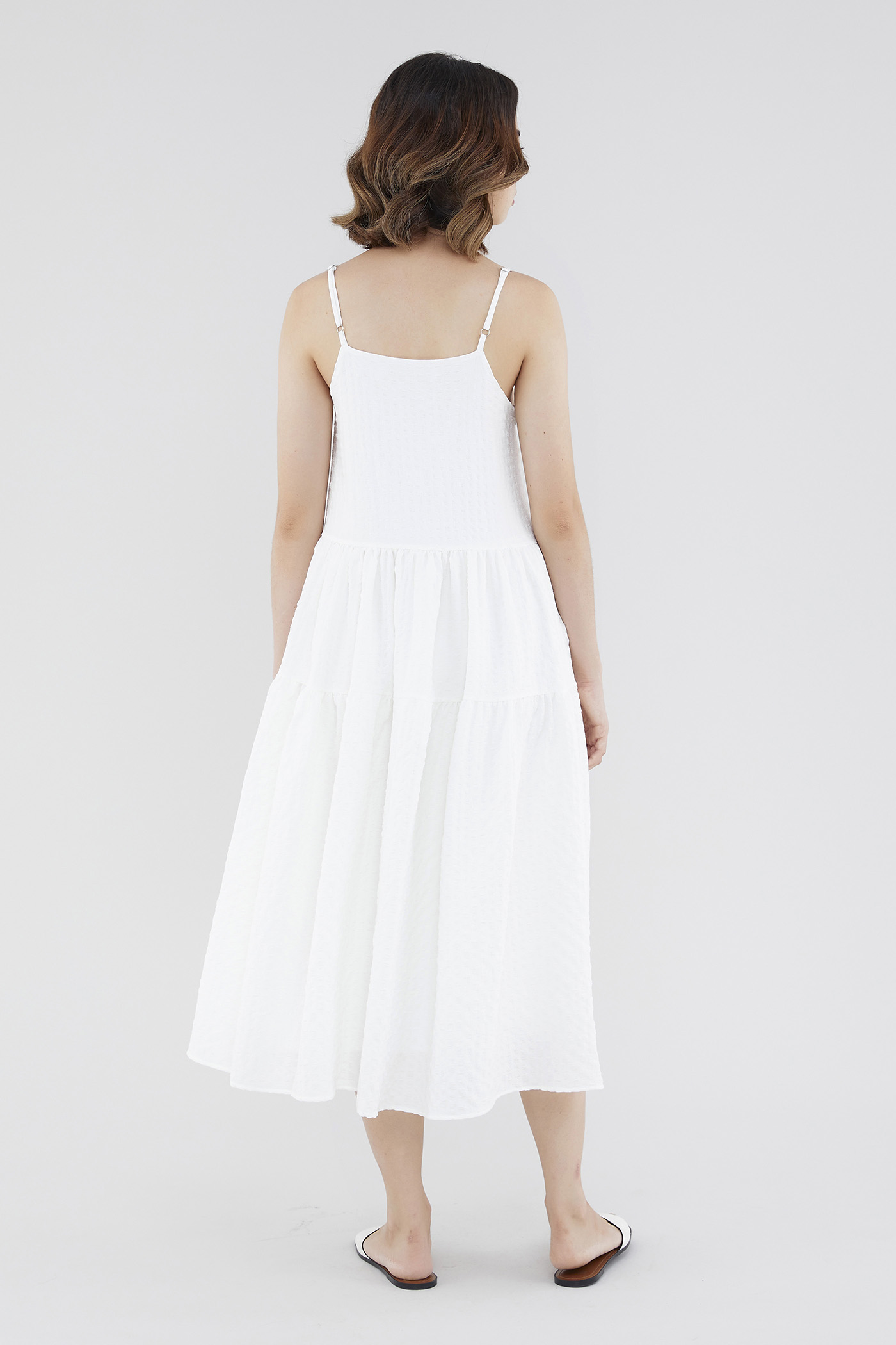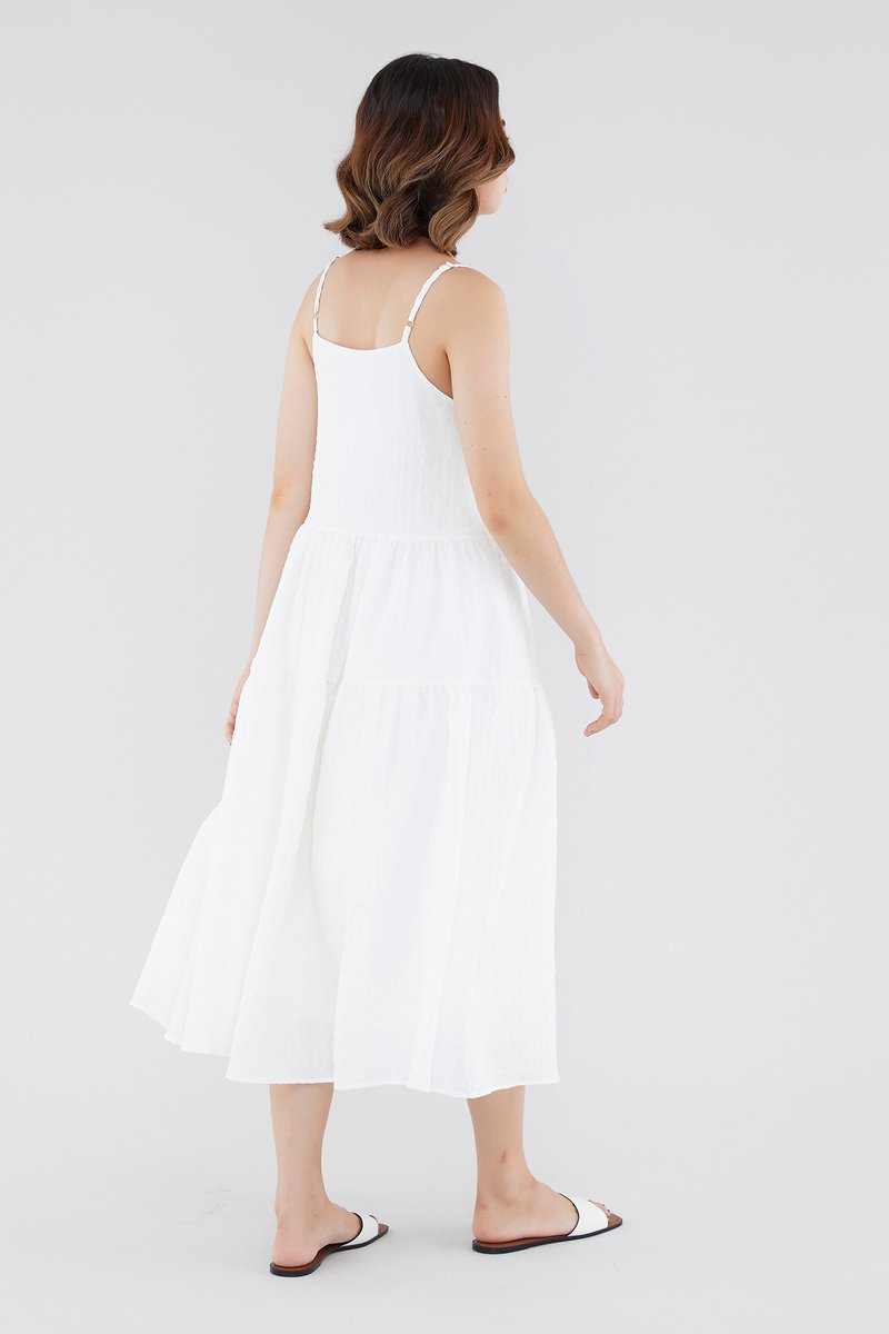 <p><span style="font-weight: 400;">Fabric Composition: 100% Polyester</span></p> <p><span style="font-weight: 400;">Lining: Full</span></p> <p><span style="font-weight: 400;">Sheerness: Opaque </span></p> <p><span style="font-weight: 400;">Pockets: None</span></p> <p><span style="font-weight: 400;">Tiered and textured. Cut from check-embossed and non-stretch fabric, this sleeveless midi dress features a straight neckline, slim adjustable straps and a flowy, tiered skirt. Worn in a relaxed, waistless fit with a zip closure on the side. </span></p> <p><span style="font-weight: 400;">Care Instructions: Do not soak / Do not bleach / Handwash or Machine wash on gentle mode / Do not machine dry / Iron using low heat</span></p>