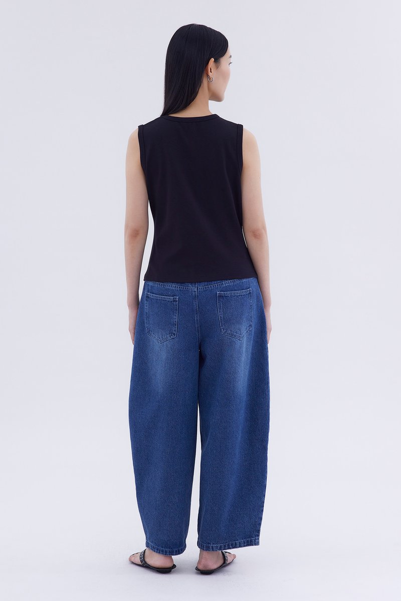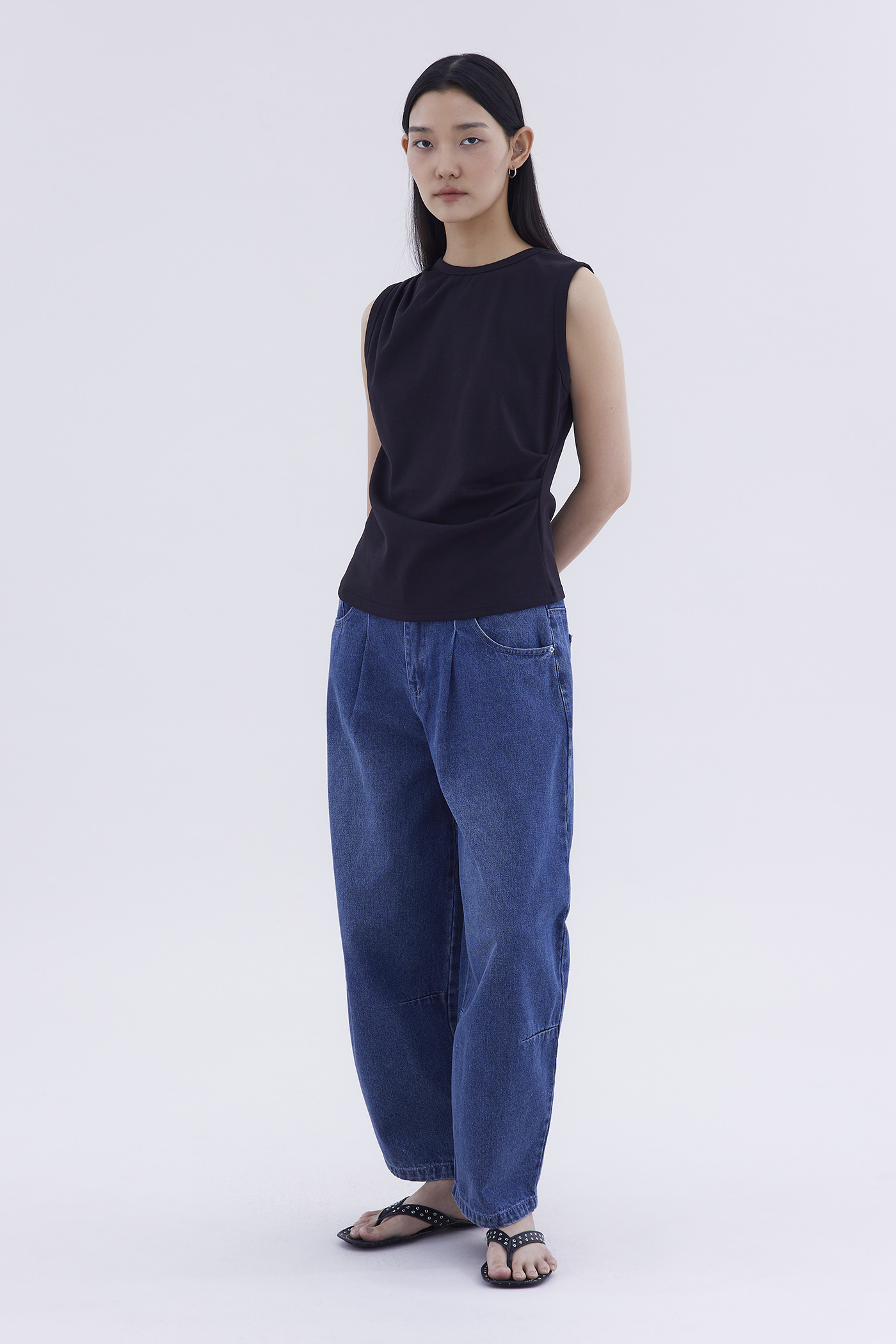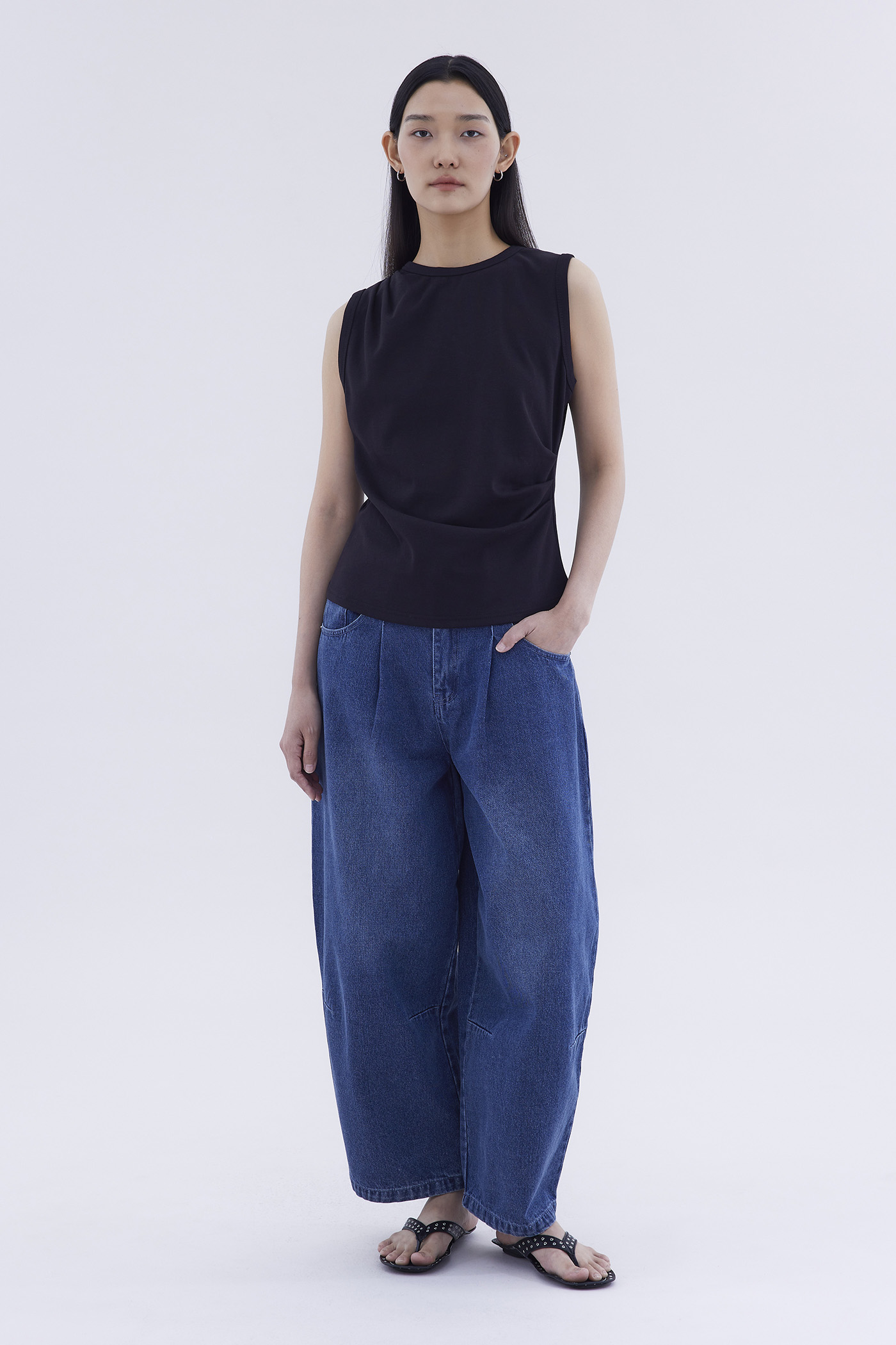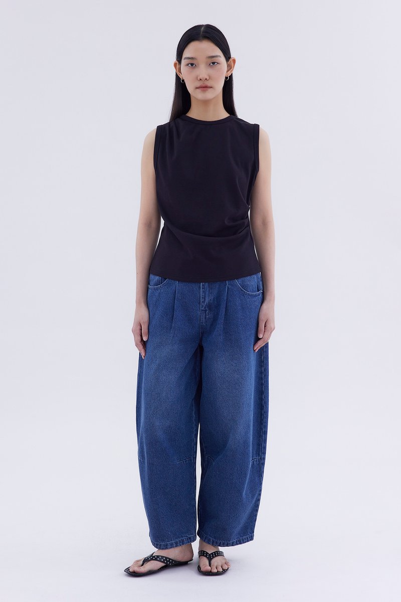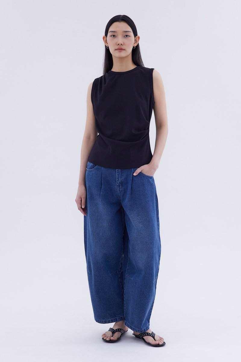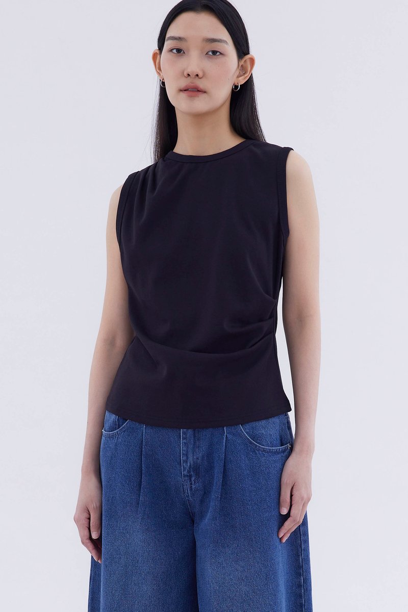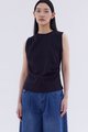 Elevated essentials. Made from soft and stretchy fabric, this sleeveless tee features a round neckline and draped front. Worn in a relaxed fit.