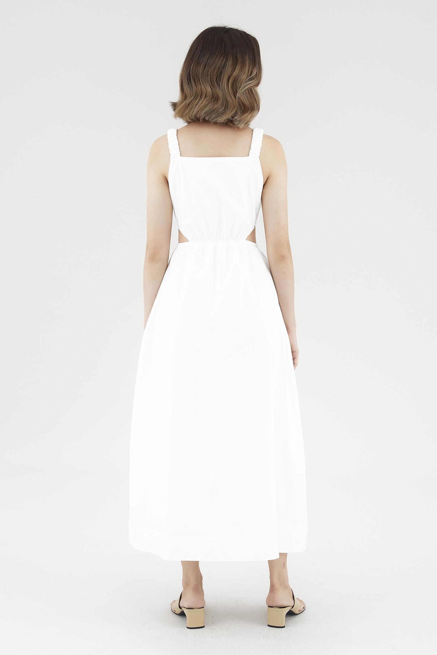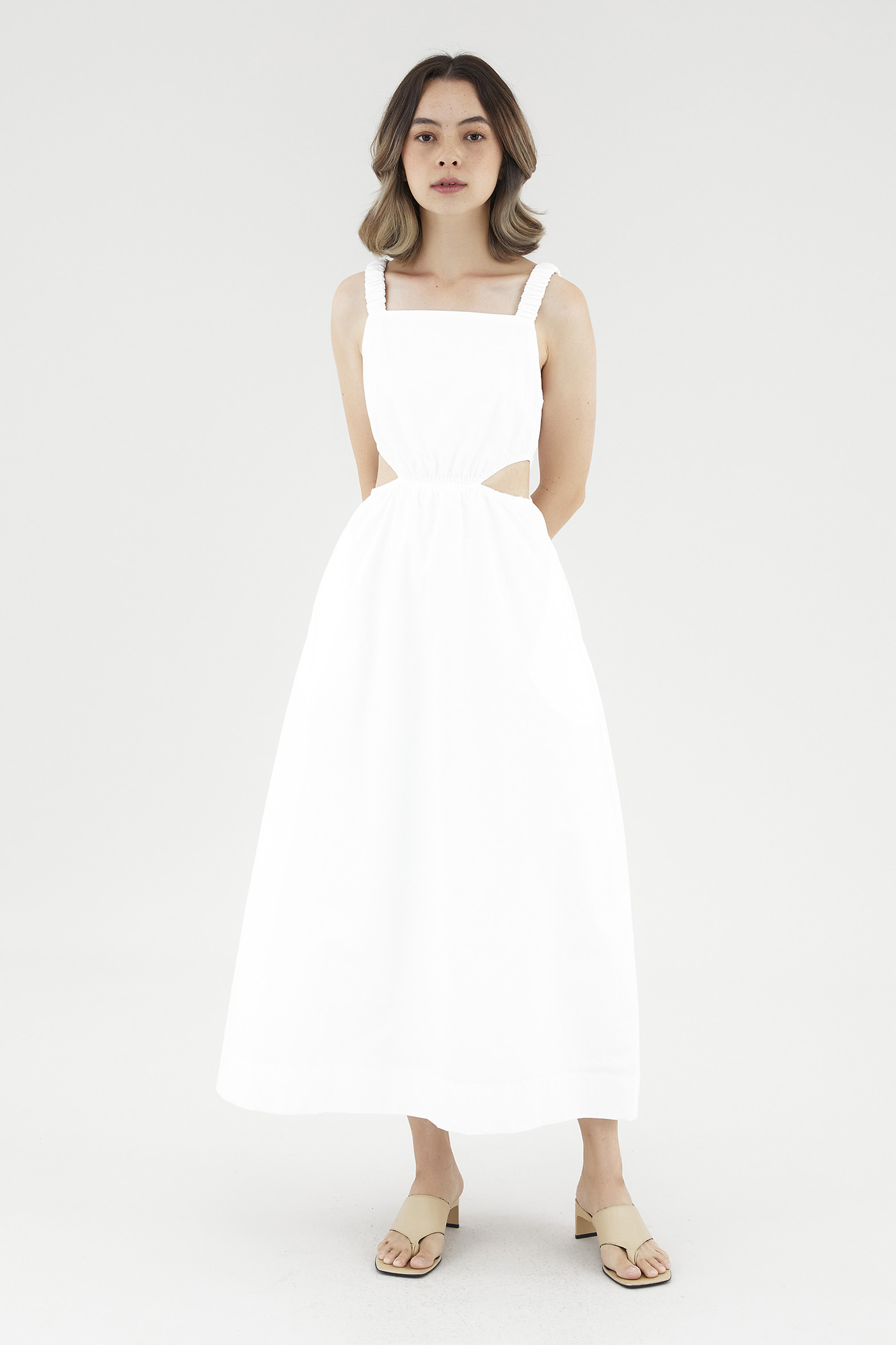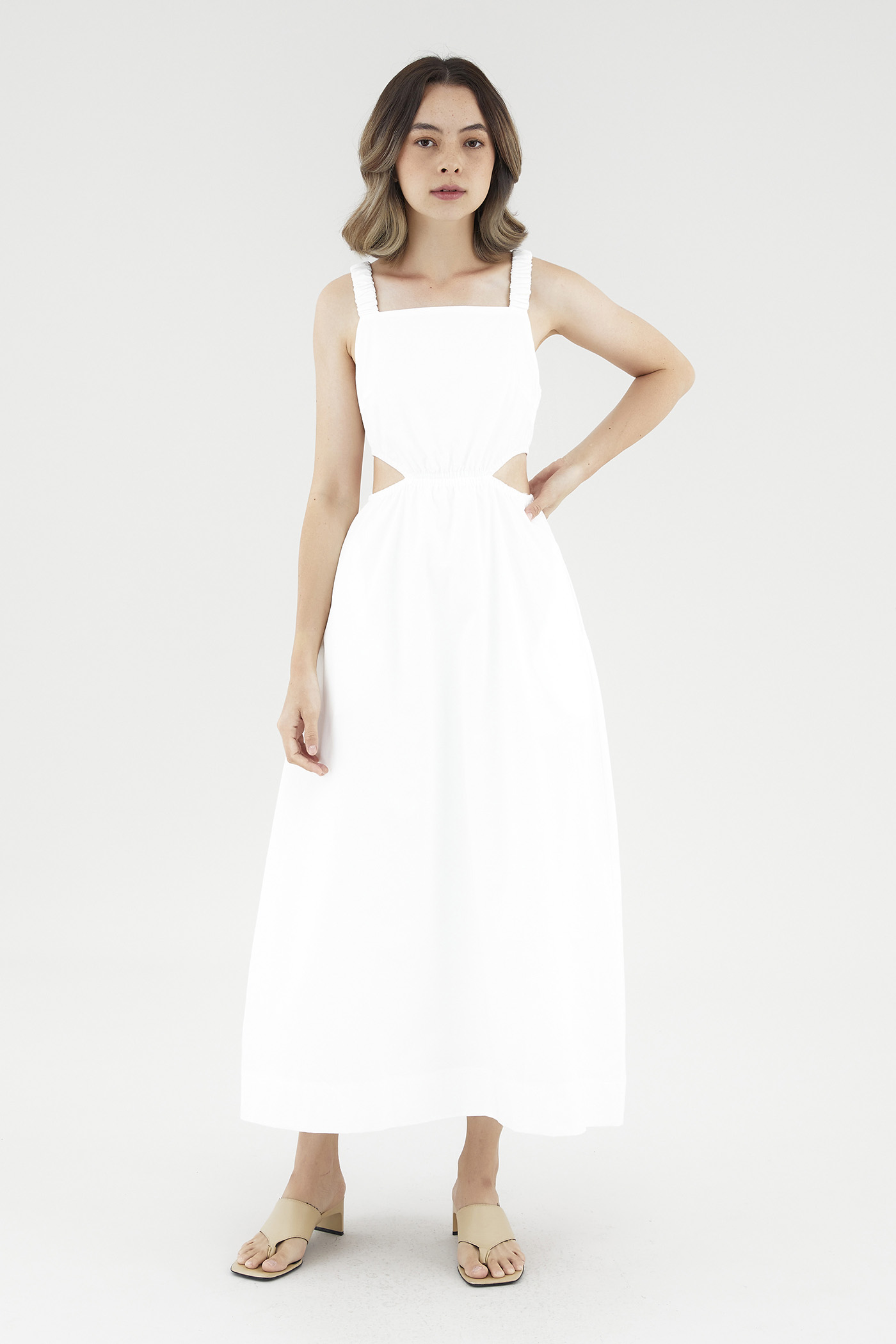 <p><span style="font-weight: 400;">Fabric Composition: 100% Cotton</span></p> <p><span style="font-weight: 400;">Lining: Full</span></p> <p><span style="font-weight: 400;">Sheerness: Opaque</span></p> <p><span style="font-weight: 400;">Pockets: Two pockets on the side</span></p> <p><span style="font-weight: 400;">Peek-a-boo. Cut from crisp and non-stretch cotton, this sleeveless dress features a square neckline, ruched, elasticated shoulder straps and an elasticated waist with side cut-outs. Fits slim in a maxi length. </span></p> <p><span style="font-weight: 400;">Care Instructions: Do not soak / Do not bleach / Handwash or Machine wash on gentle mode / Do not machine dry / Iron using low heat</span></p>