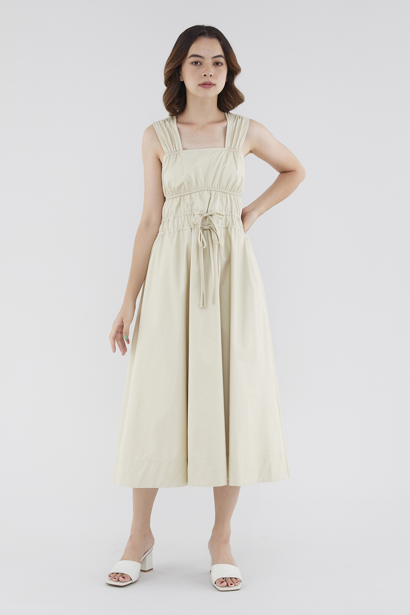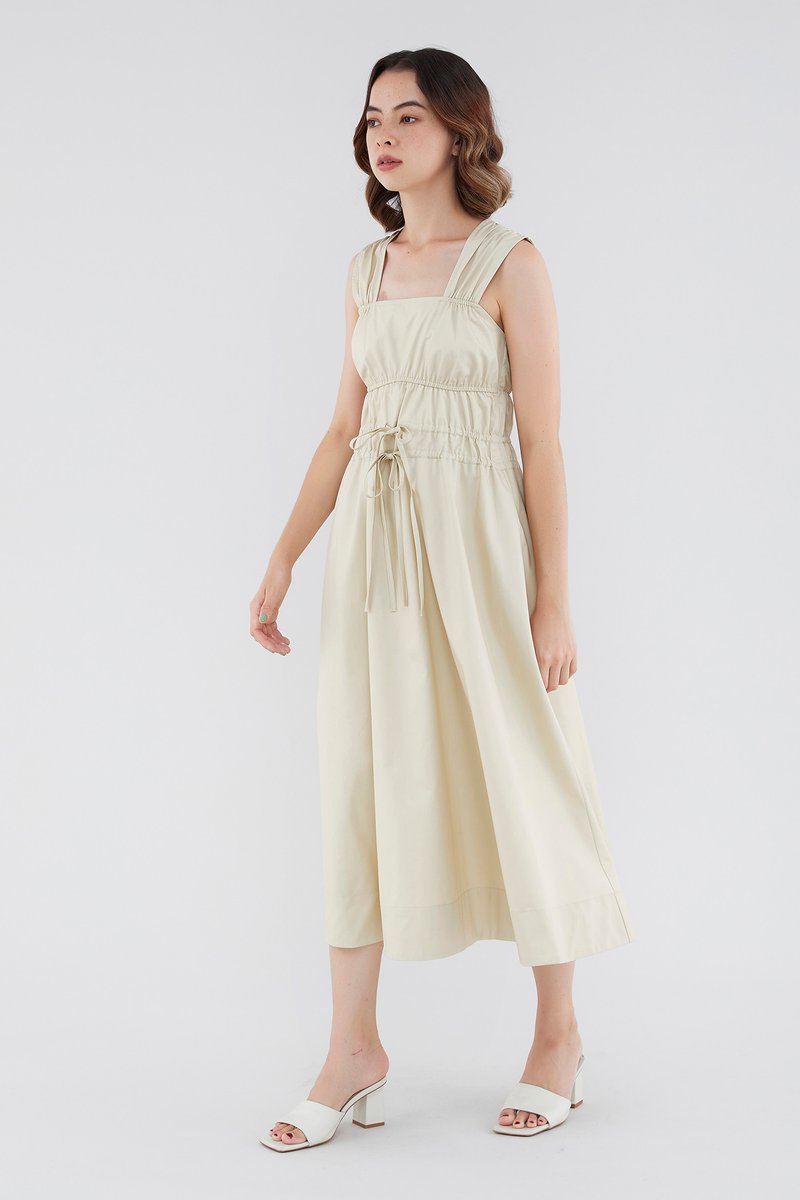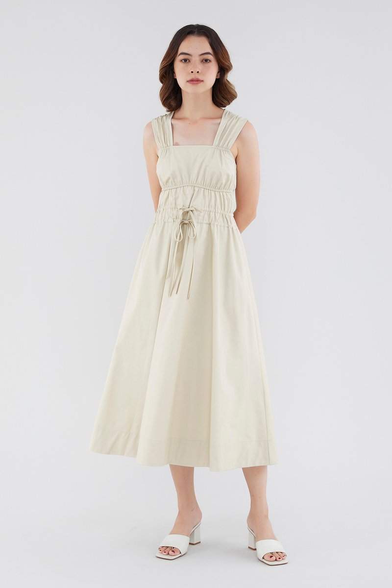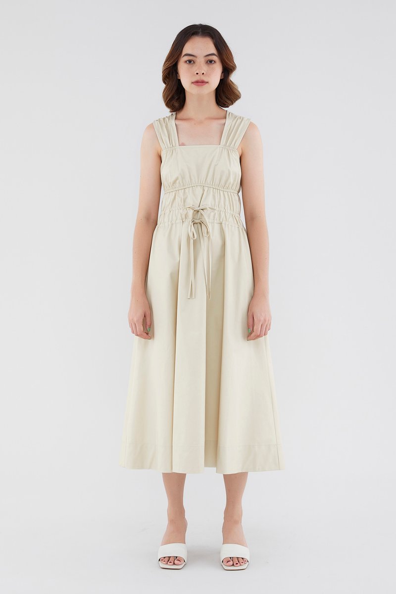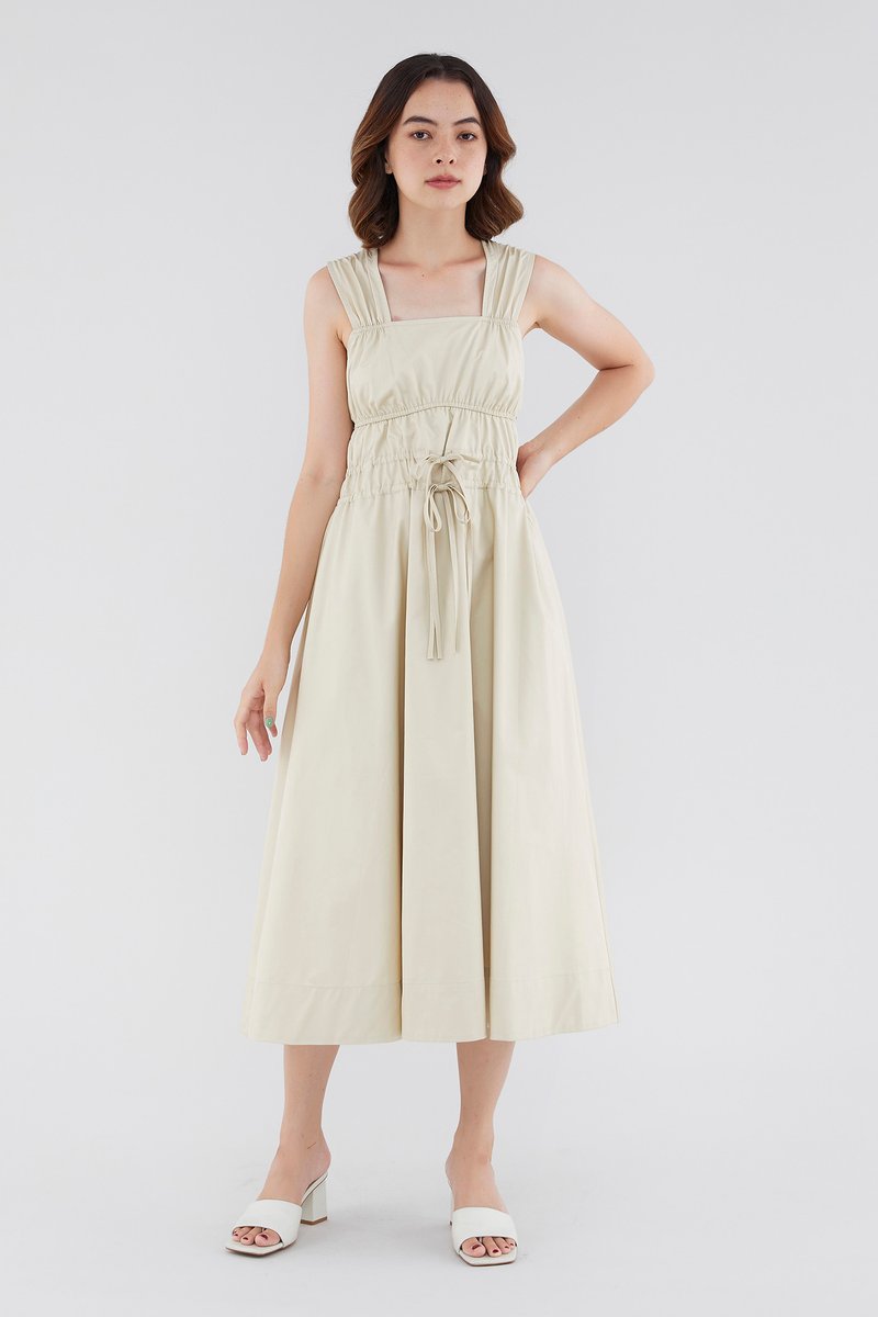 <p><span style="font-weight: 400;">Fabric Composition: 100% Cotton </span></p> <p><span style="font-weight: 400;">Lining: Full</span></p> <p><span style="font-weight: 400;">Sheerness: Opaque </span></p> <p><span style="font-weight: 400;">Pockets: None</span></p> <p><span style="font-weight: 400;">Double the details. Cut from crisp and non-stretch fabric, this sleeveless midi dress features a square neckline, wide shoulder straps, an elasticated band beneath the bust, a ruched bodice and double, adjustable tie-straps at its waist. Worn in a relaxed fit.</span></p> <p><span style="font-weight: 400;">Care Instructions: Do not soak / Do not bleach / Handwash or Machine wash on gentle mode / Do not machine dry / Iron using low heat</span></p>