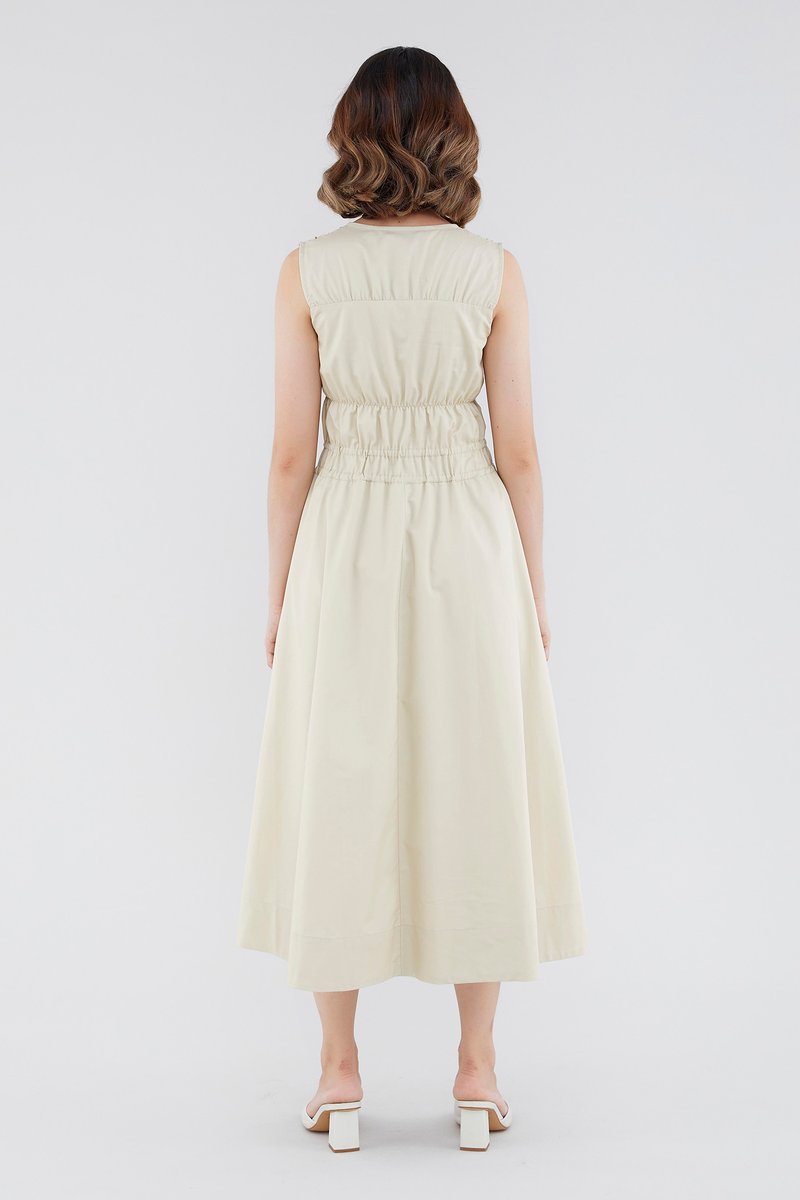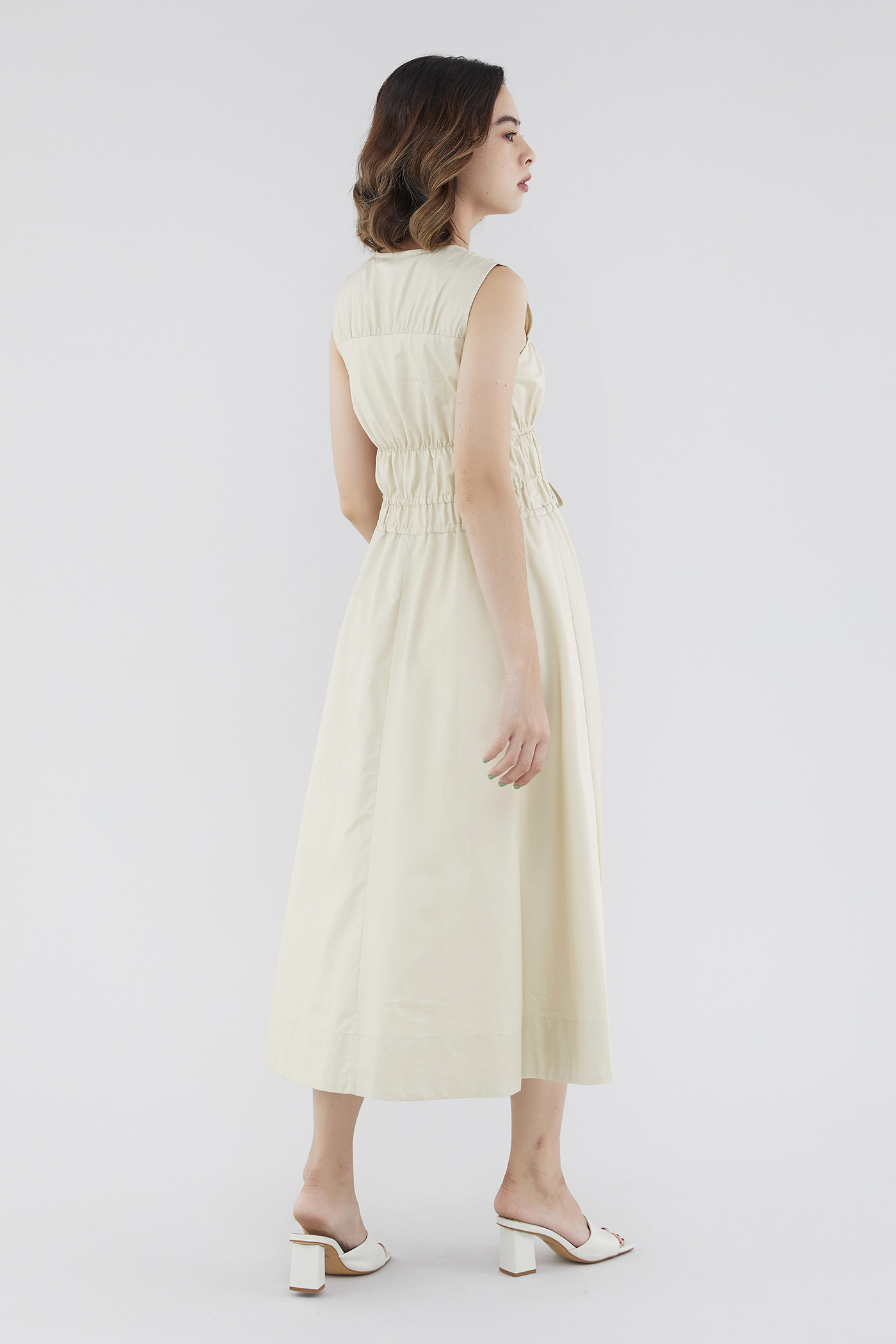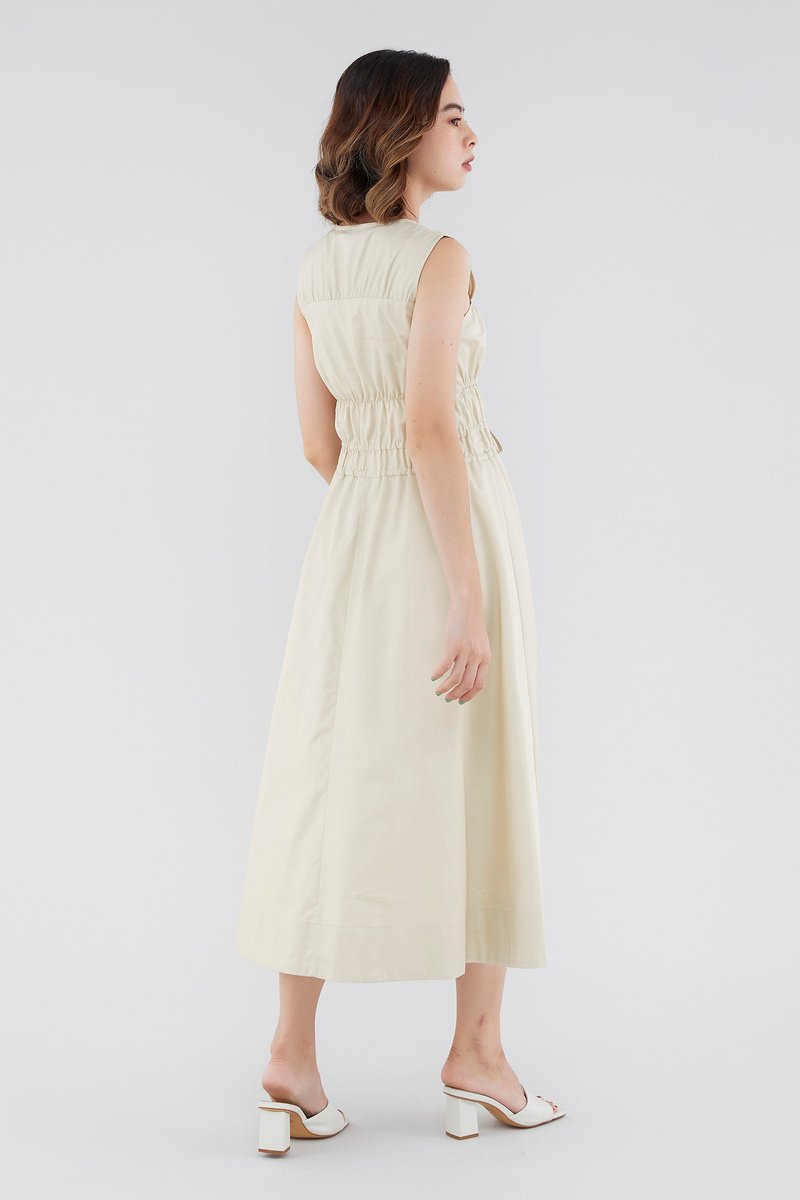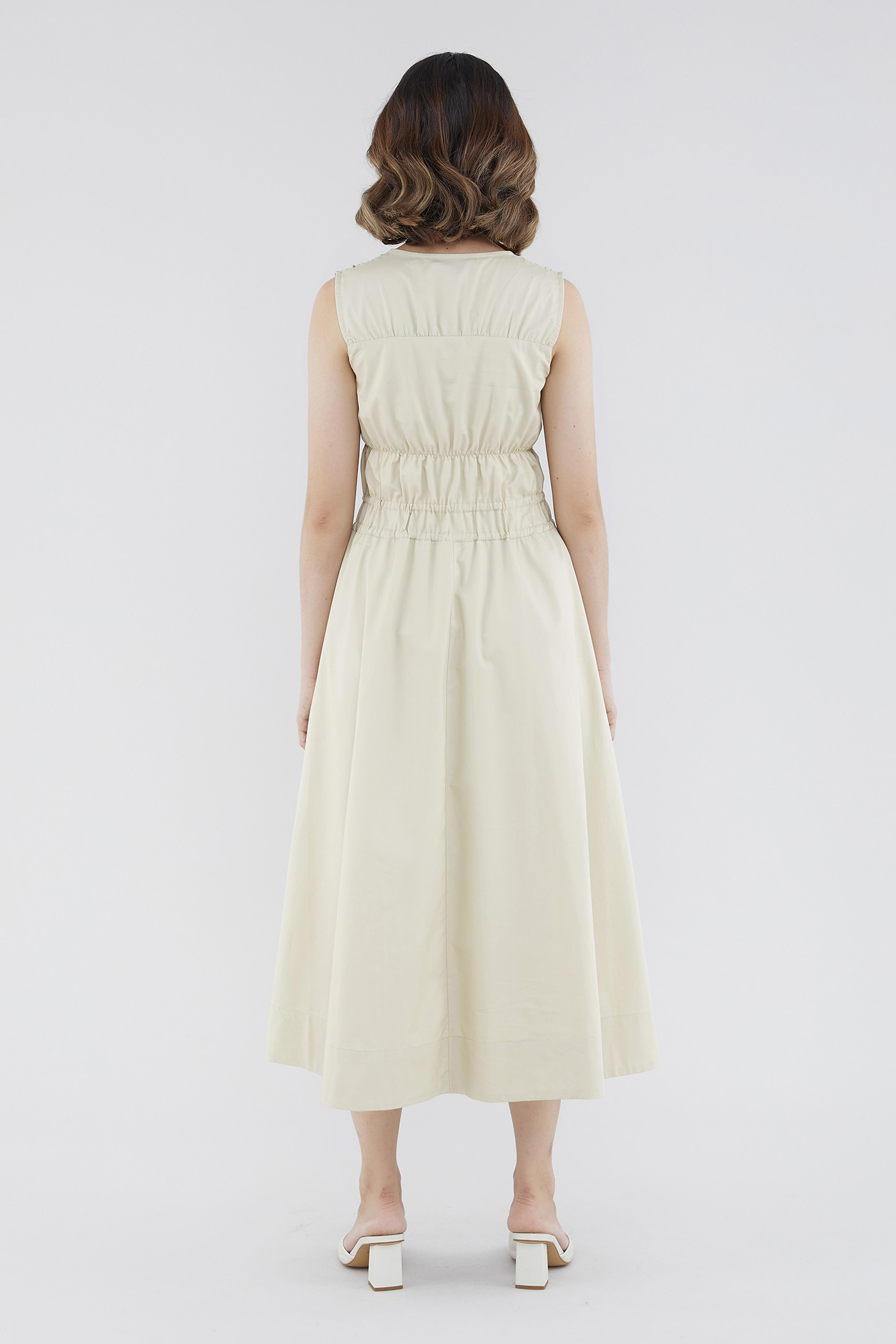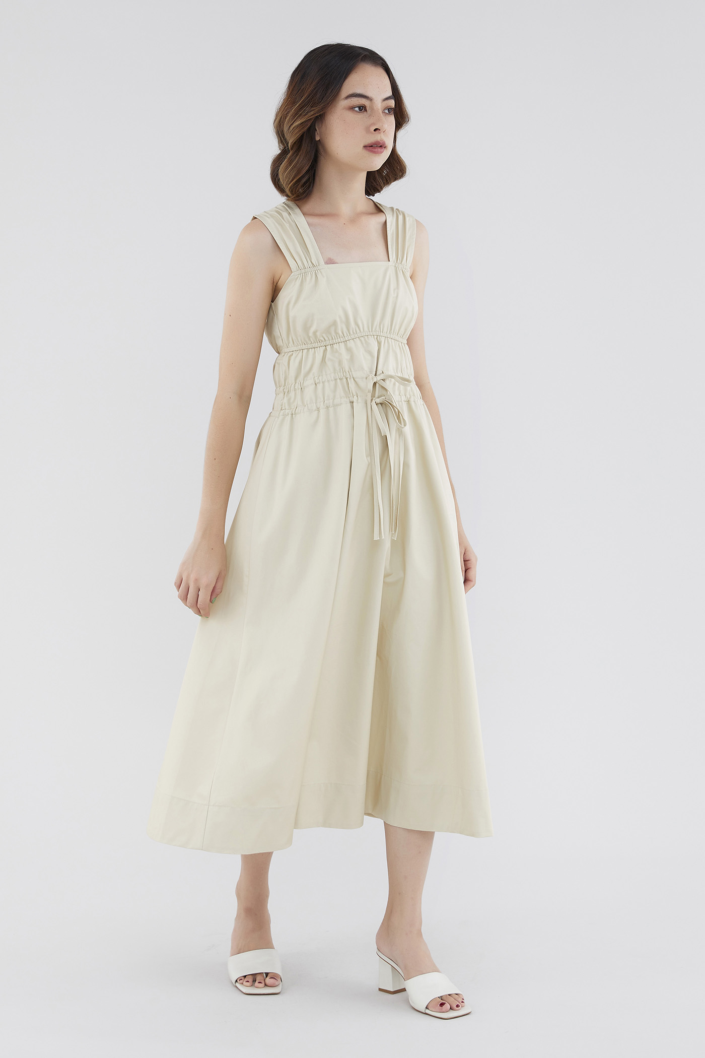 <p><span style="font-weight: 400;">Fabric Composition: 100% Cotton </span></p> <p><span style="font-weight: 400;">Lining: Full</span></p> <p><span style="font-weight: 400;">Sheerness: Opaque </span></p> <p><span style="font-weight: 400;">Pockets: None</span></p> <p><span style="font-weight: 400;">Double the details. Cut from crisp and non-stretch fabric, this sleeveless midi dress features a square neckline, wide shoulder straps, an elasticated band beneath the bust, a ruched bodice and double, adjustable tie-straps at its waist. Worn in a relaxed fit.</span></p> <p><span style="font-weight: 400;">Care Instructions: Do not soak / Do not bleach / Handwash or Machine wash on gentle mode / Do not machine dry / Iron using low heat</span></p>