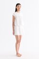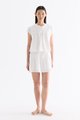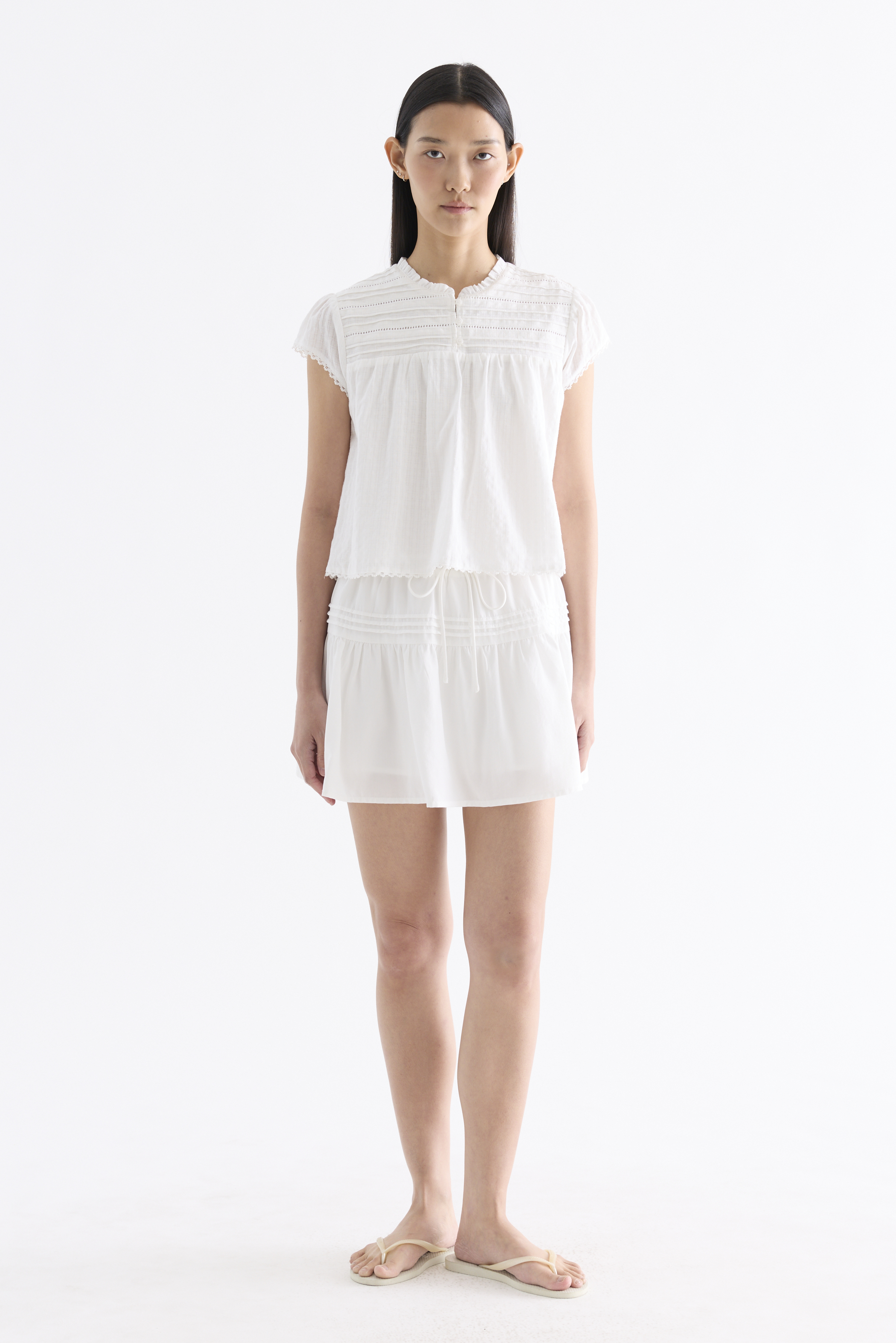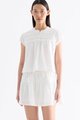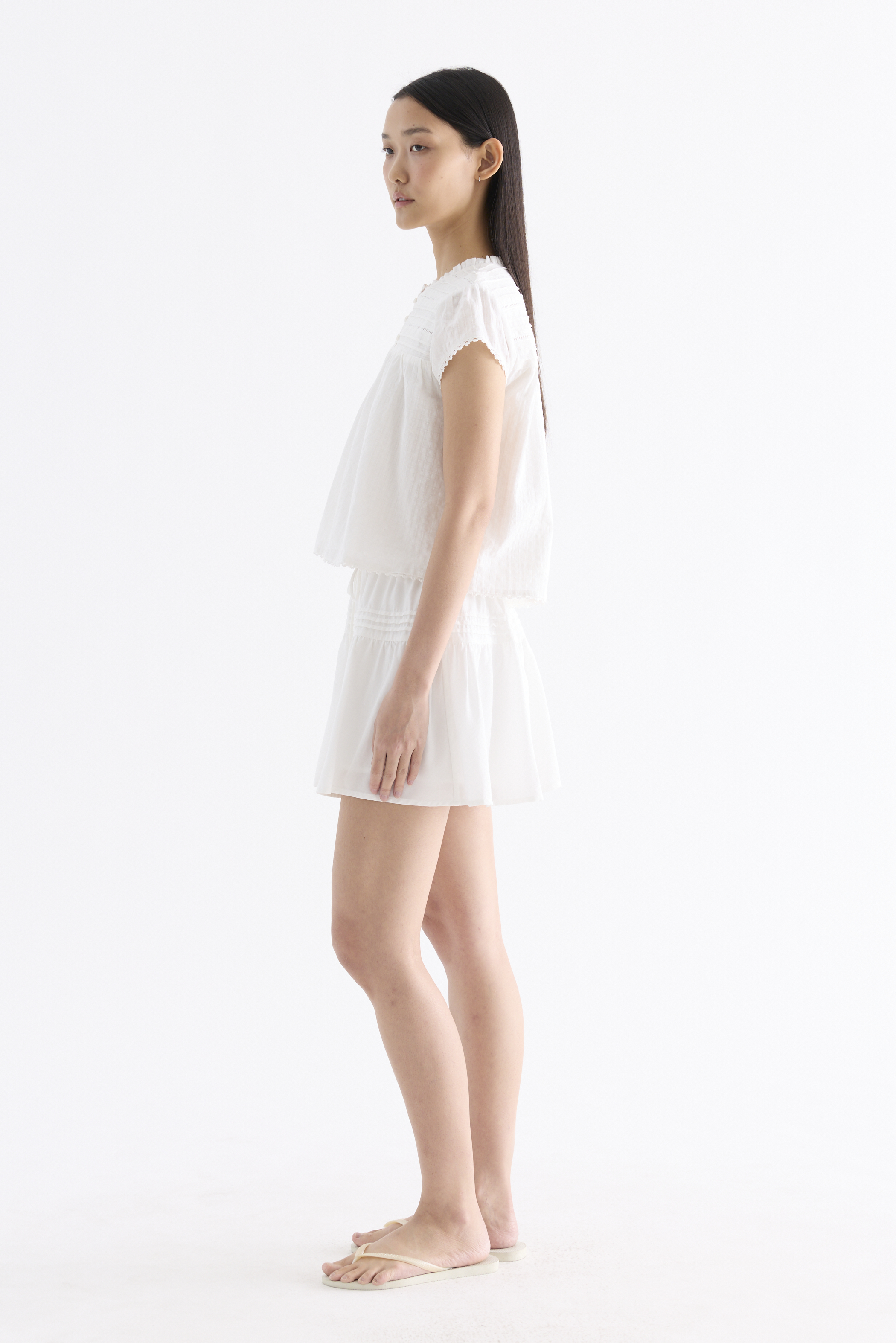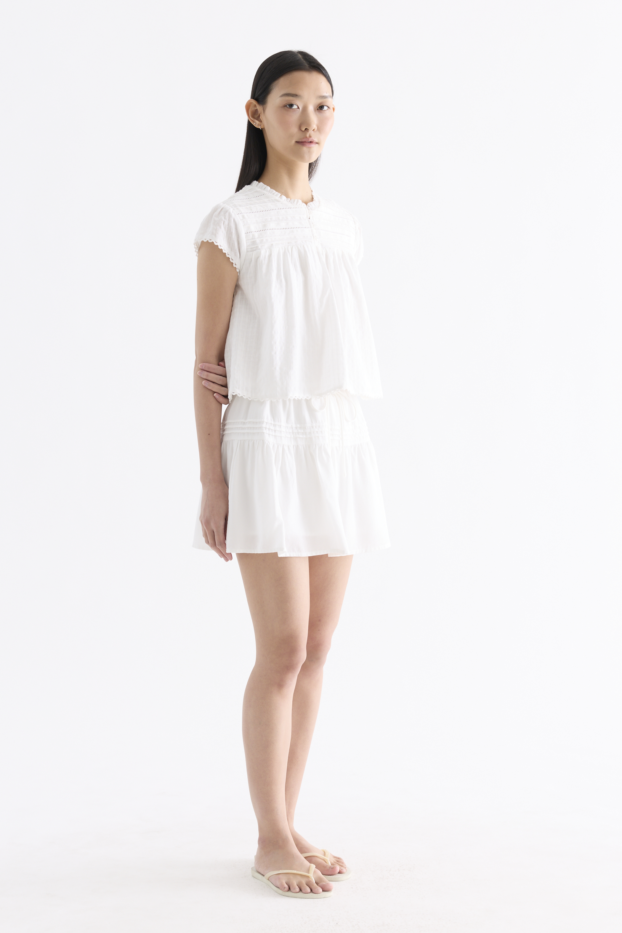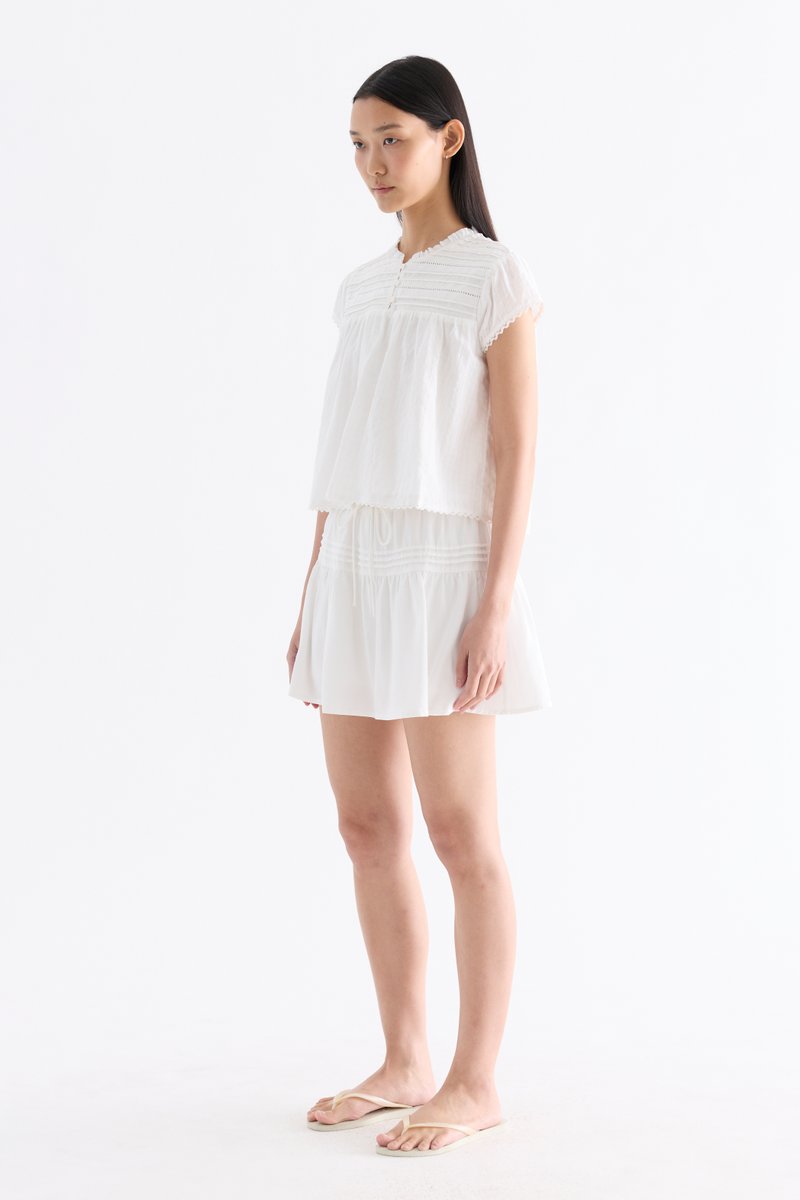 Summer’s best. Cut from airy and softly structured seersucker cotton, this top features a round frill-trimmed neckline, lace-trimmed cap sleeves, upper pleats with lace accents, front loop buttons and a lace-trimmed hemline.