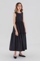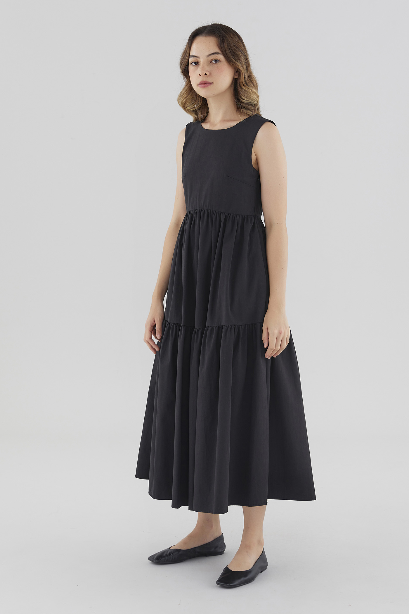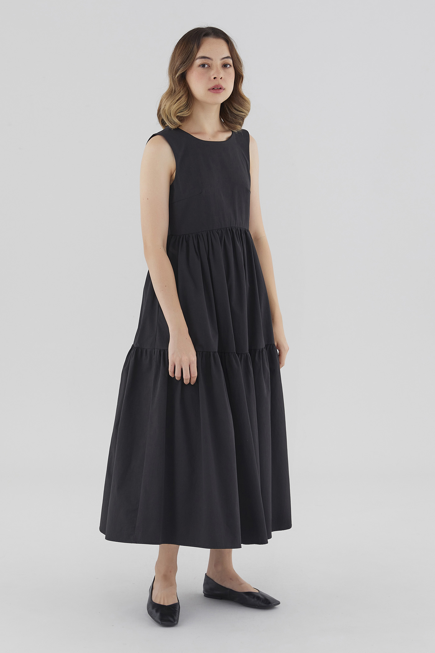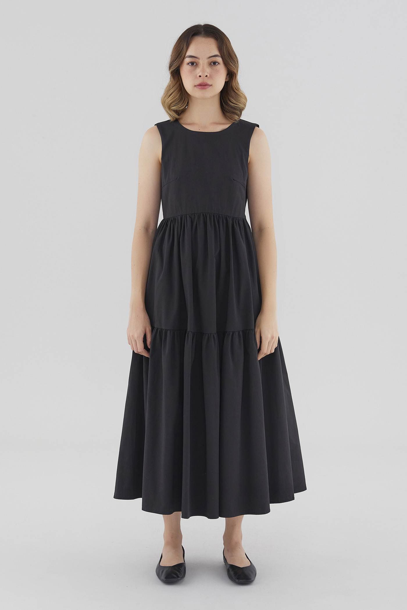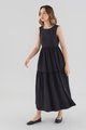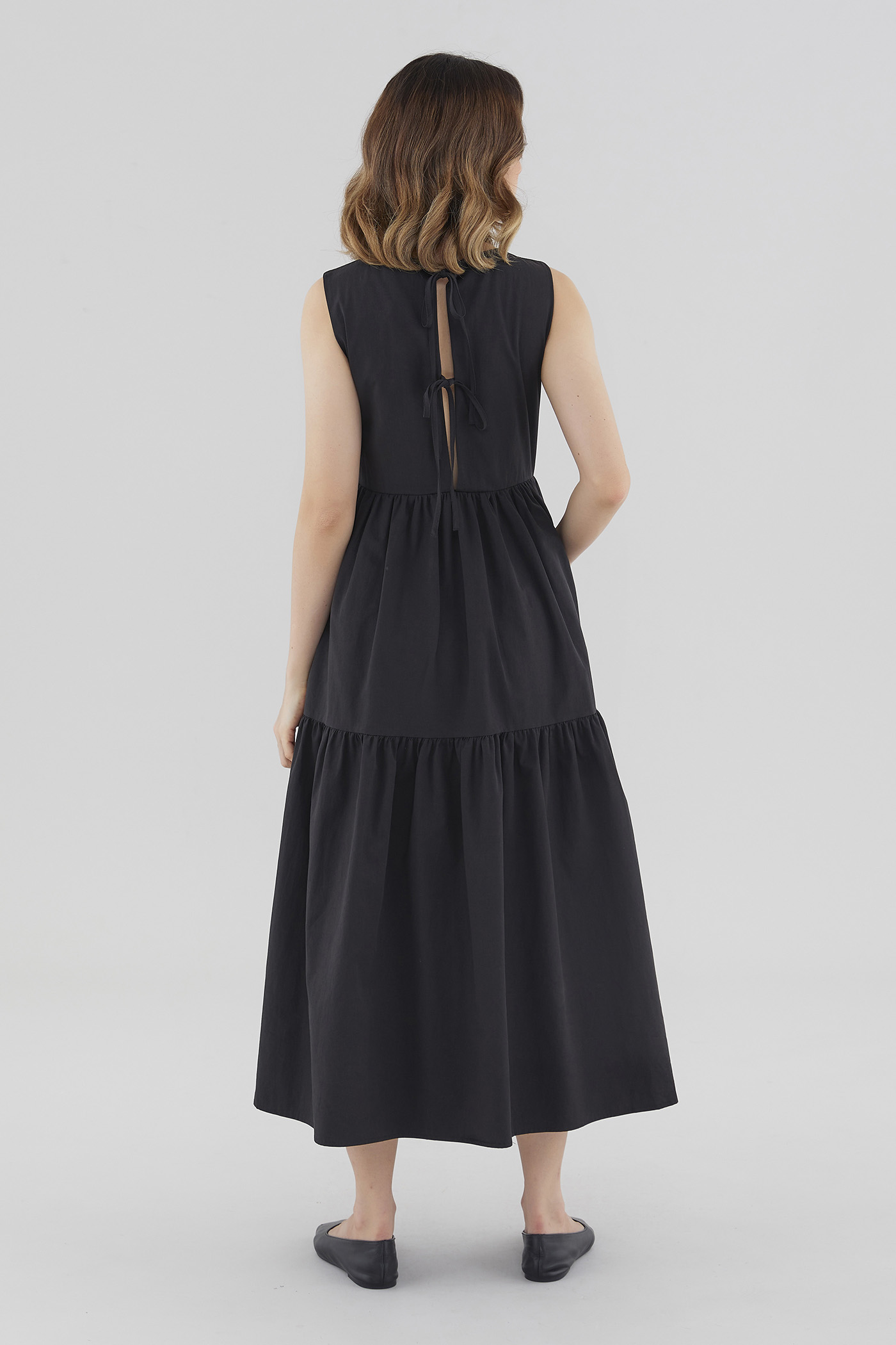 Statement details. Cut from smooth cotton with a structured drape, this sleeveless maxi dress features a round neckline, wide non-adjustable straps, a tiered skirt and a back slit with double tie-straps. Fits relaxed with a side zip closure.