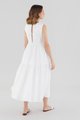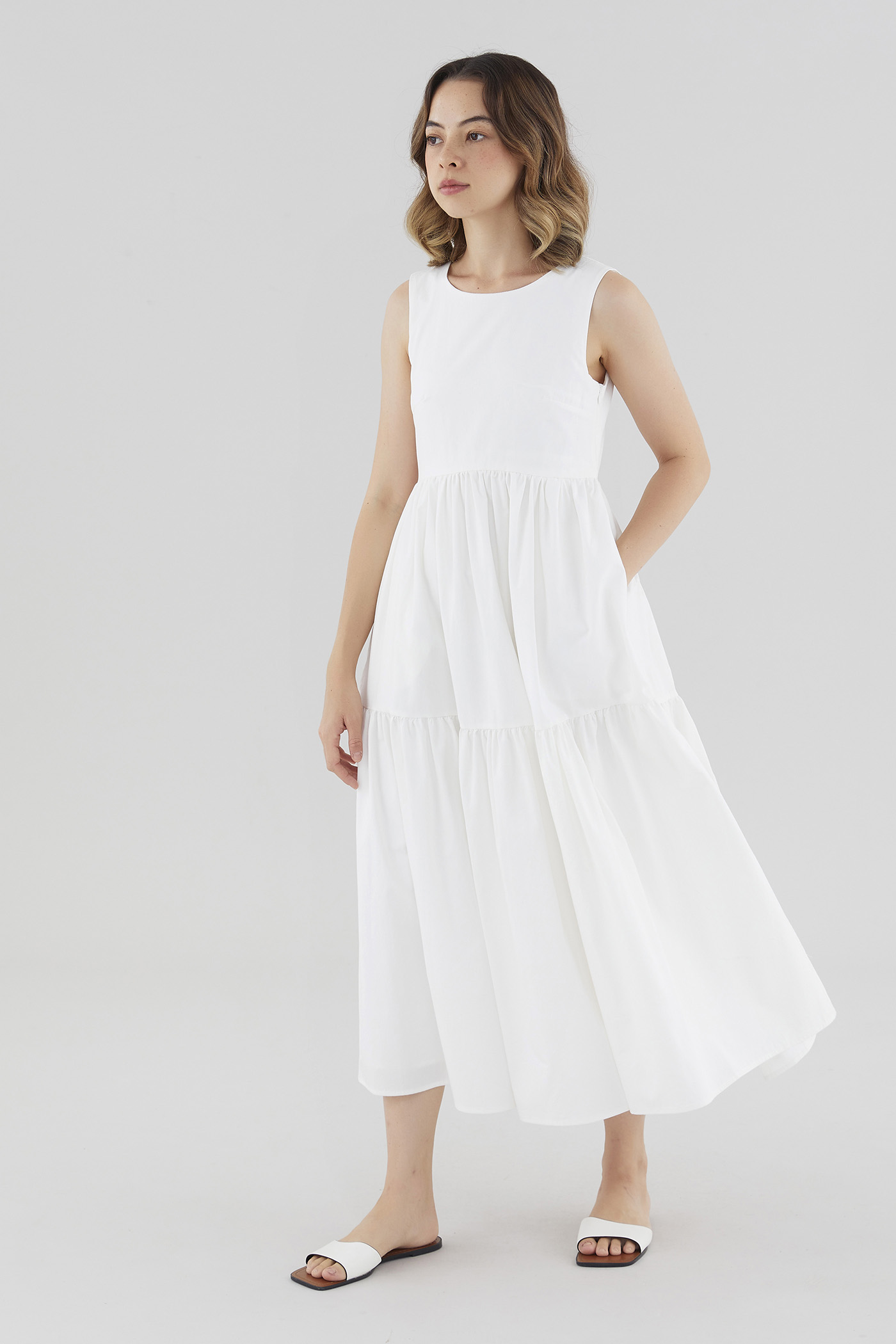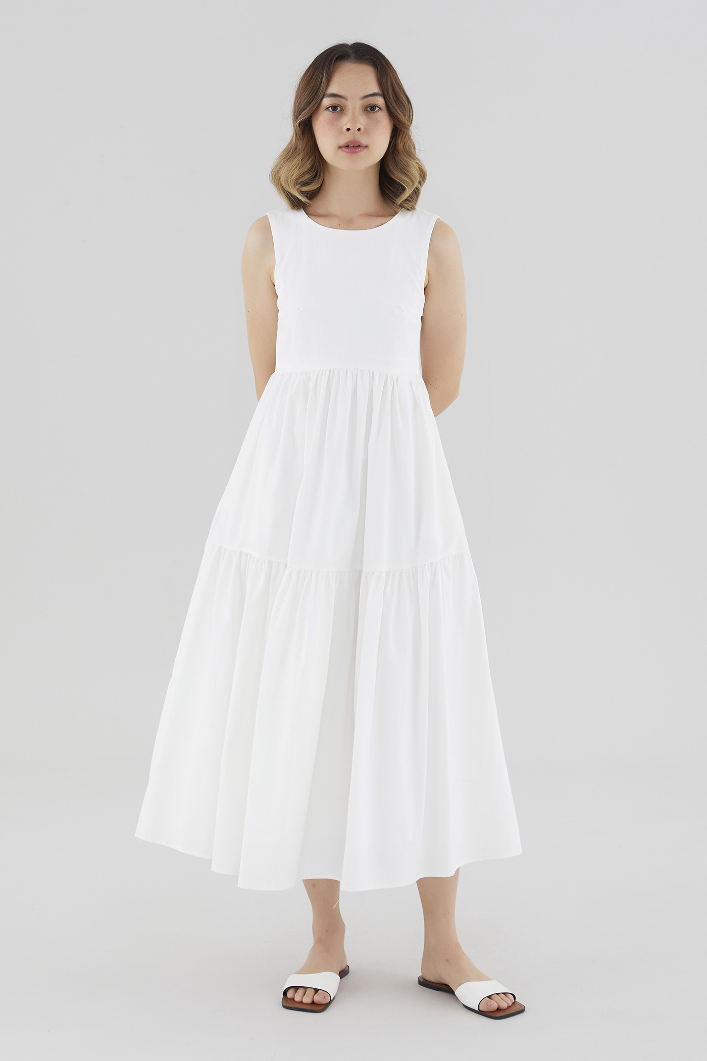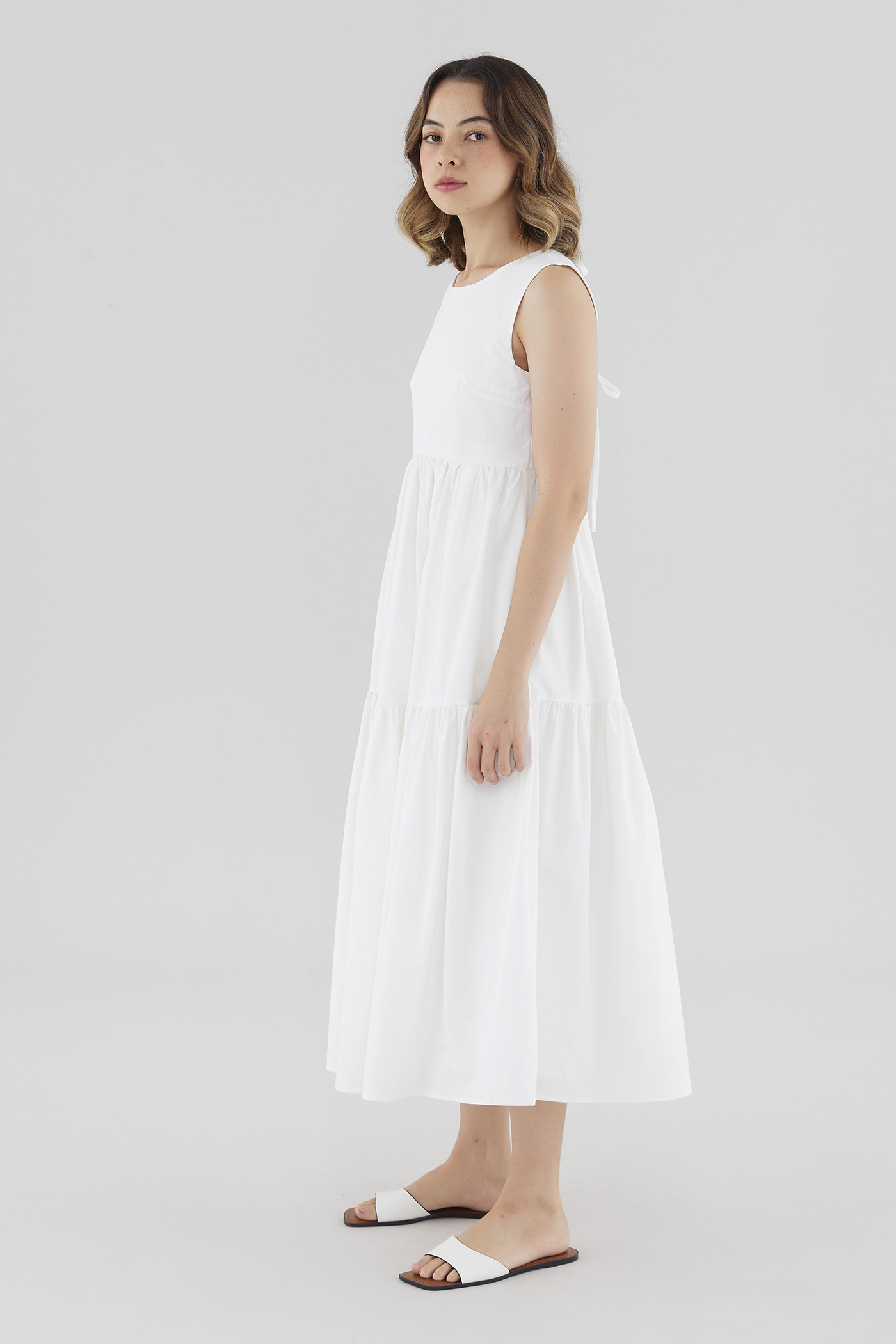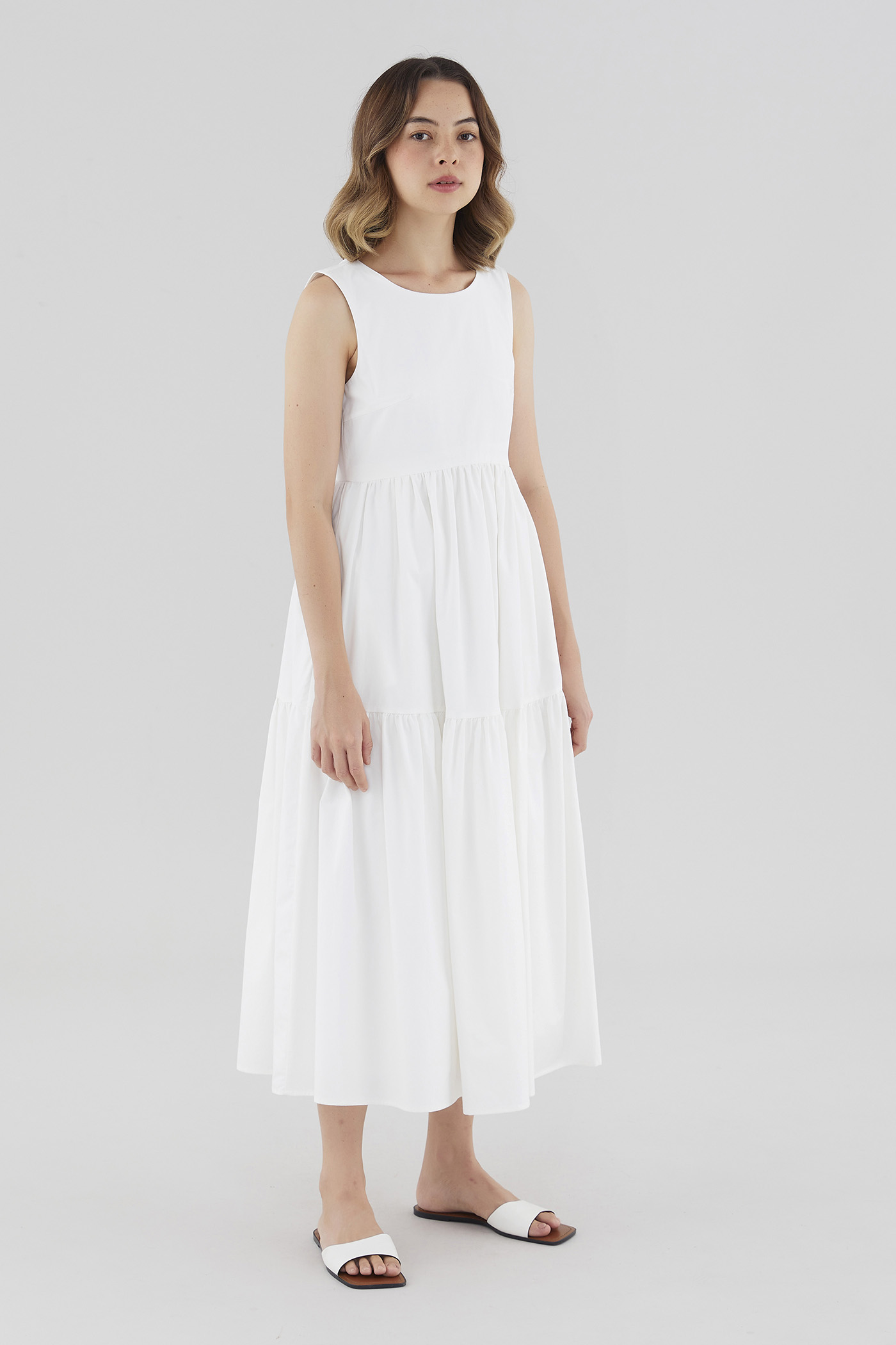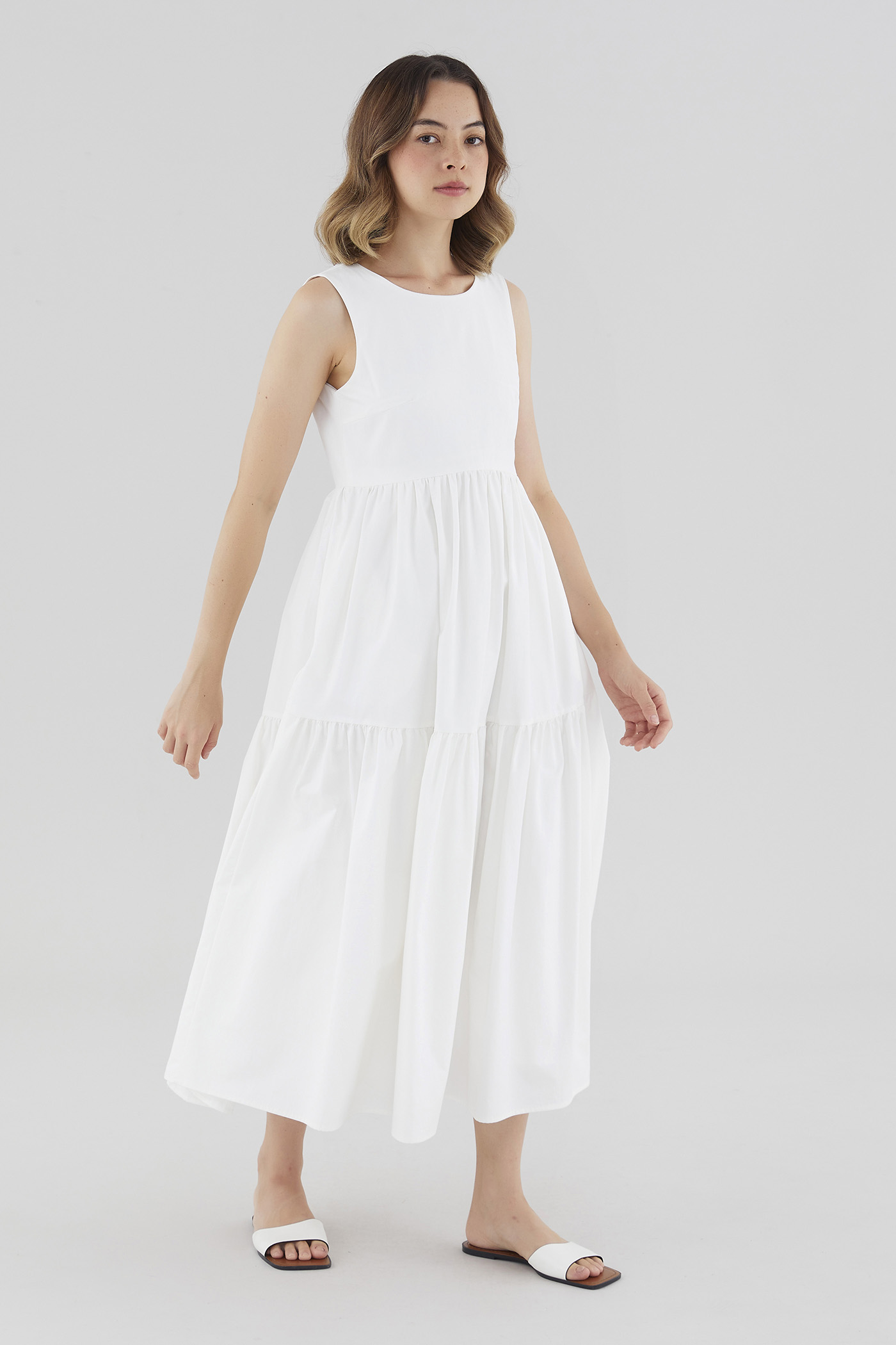Statement details. Cut from smooth cotton with a structured drape, this sleeveless maxi dress features a round neckline, wide non-adjustable straps, a tiered skirt and a back slit with double tie-straps. Fits relaxed with a side zip closure.