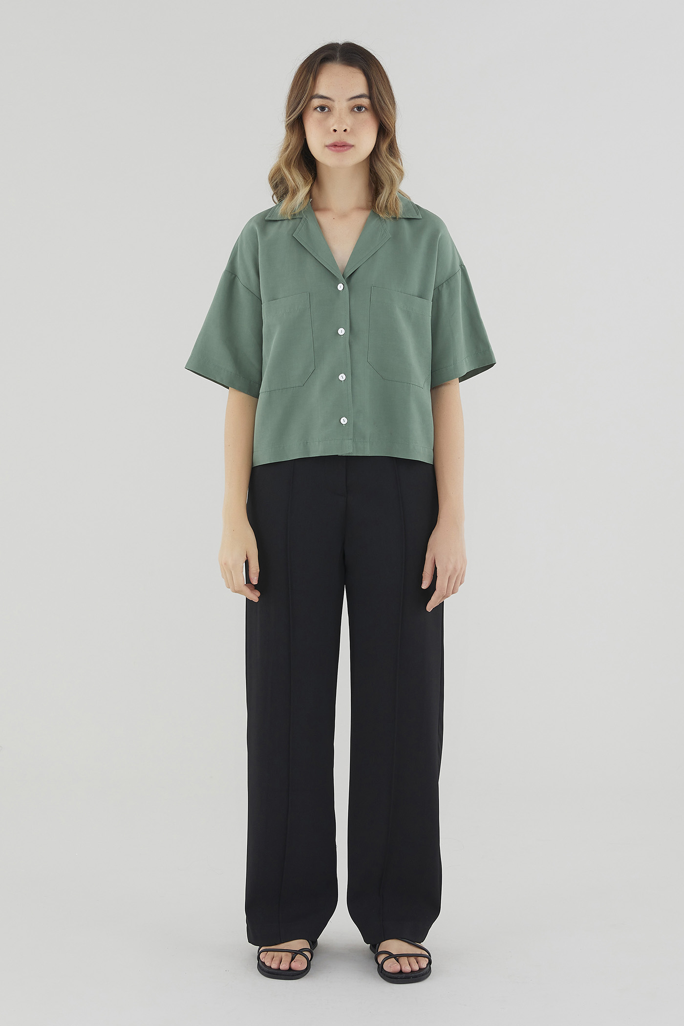 A staple top and layering essential in one. Cut from soft and non-stretch fabric, this shirt features short sleeves, a collared V-neckline and a front button-down closure. Worn in a relaxed fit.