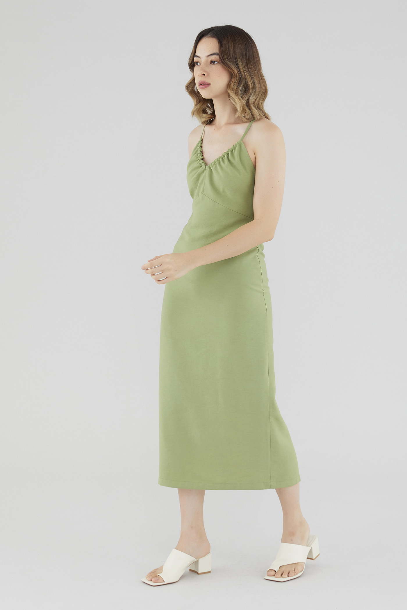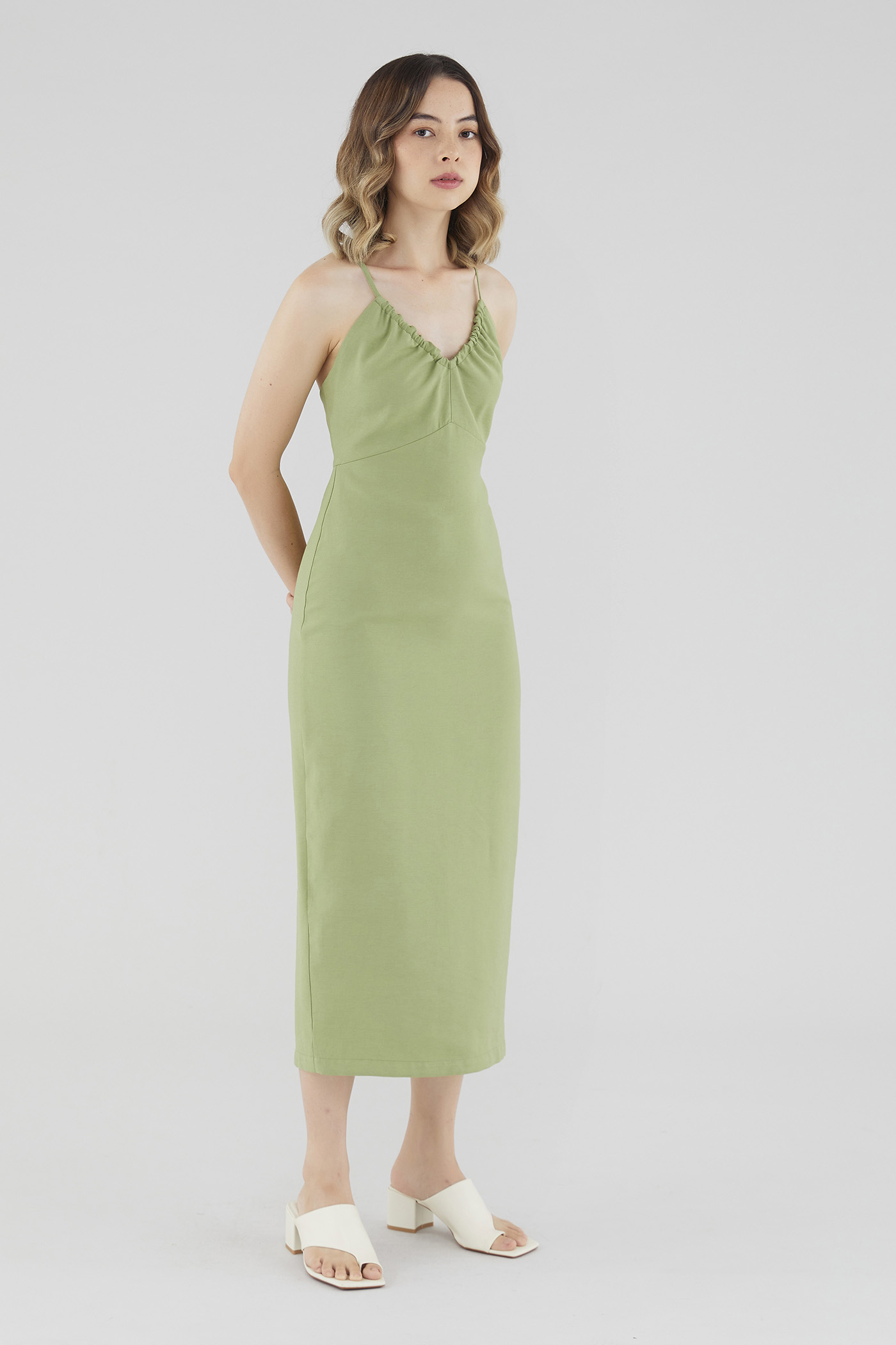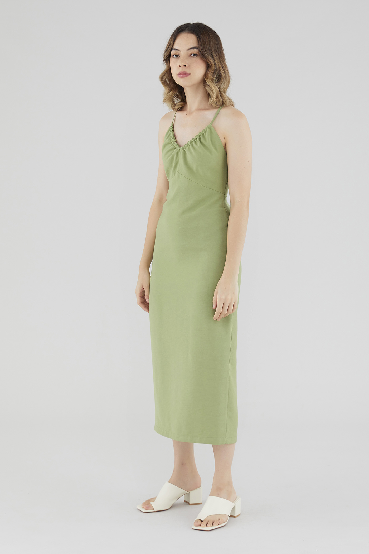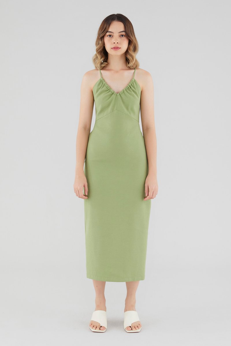 Keep it sleek. Cut from smooth fabric with a structured drape, this sleeveless midi dress features a ruched, V-shaped drawstring neckline, slim back-tie shoulder straps, a back skirt slit and a back zip. Worn in a slim fit.