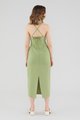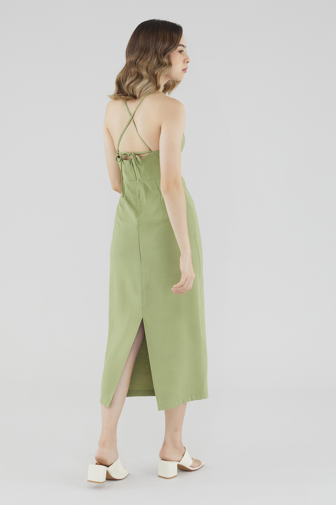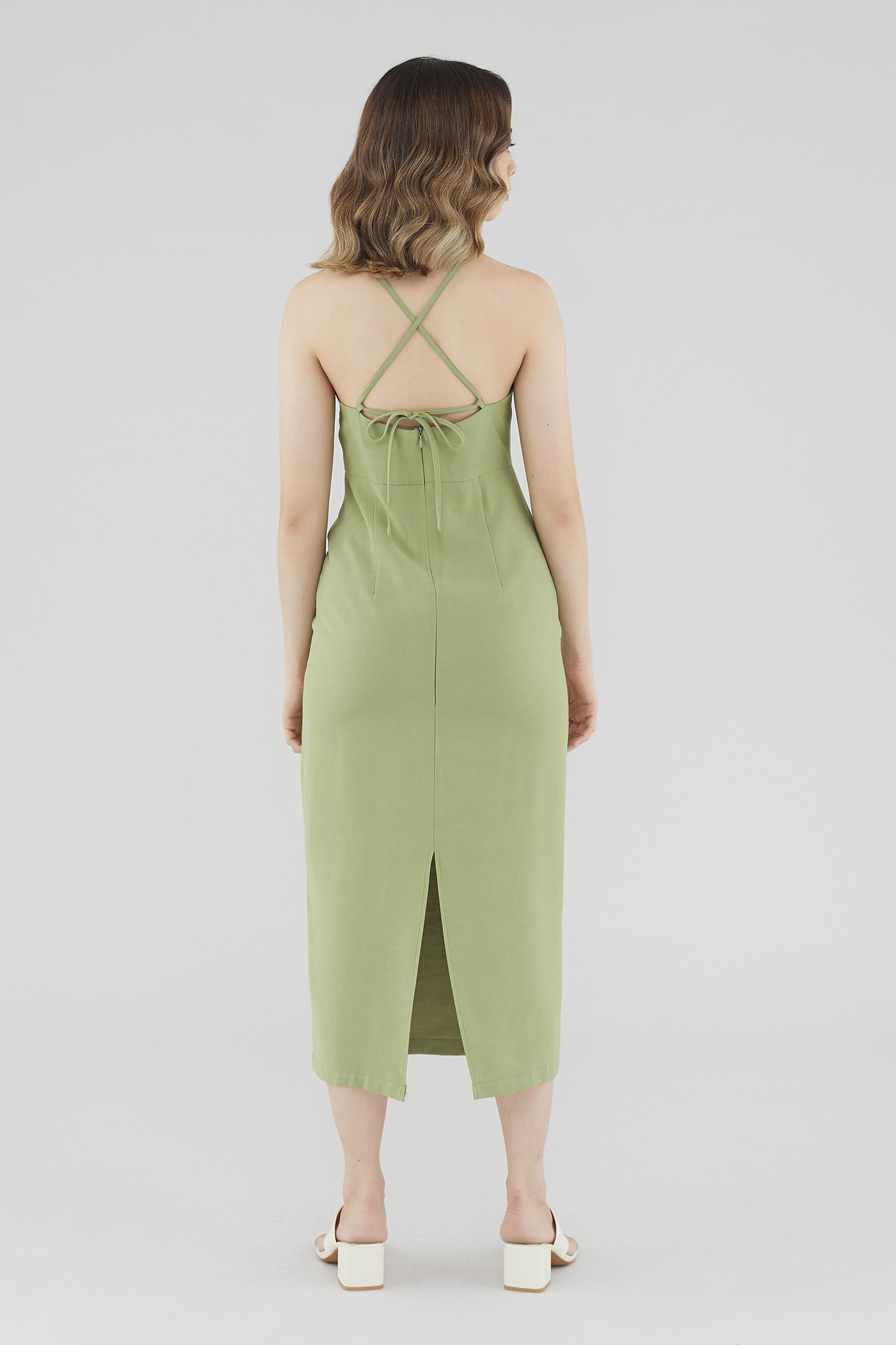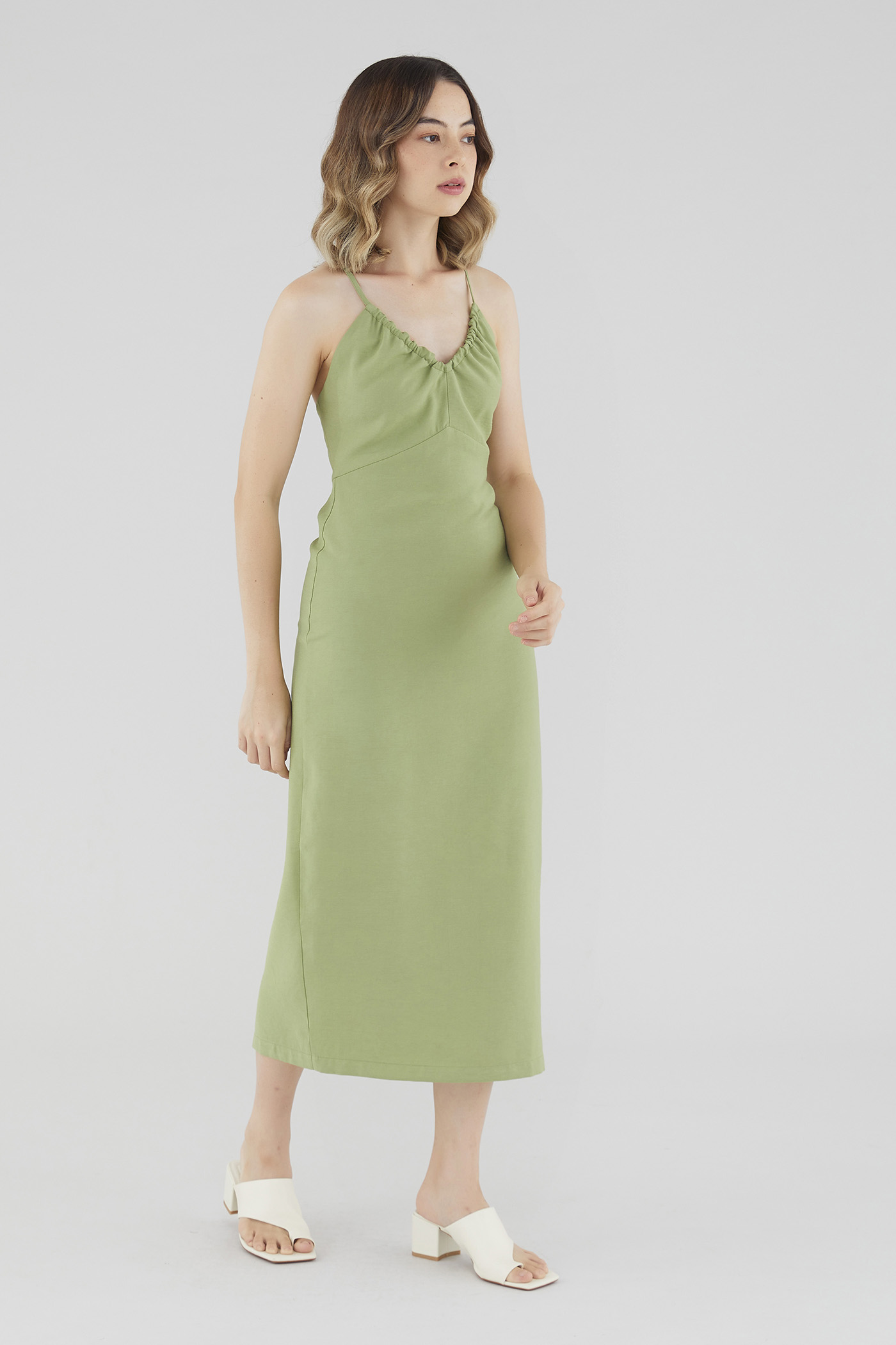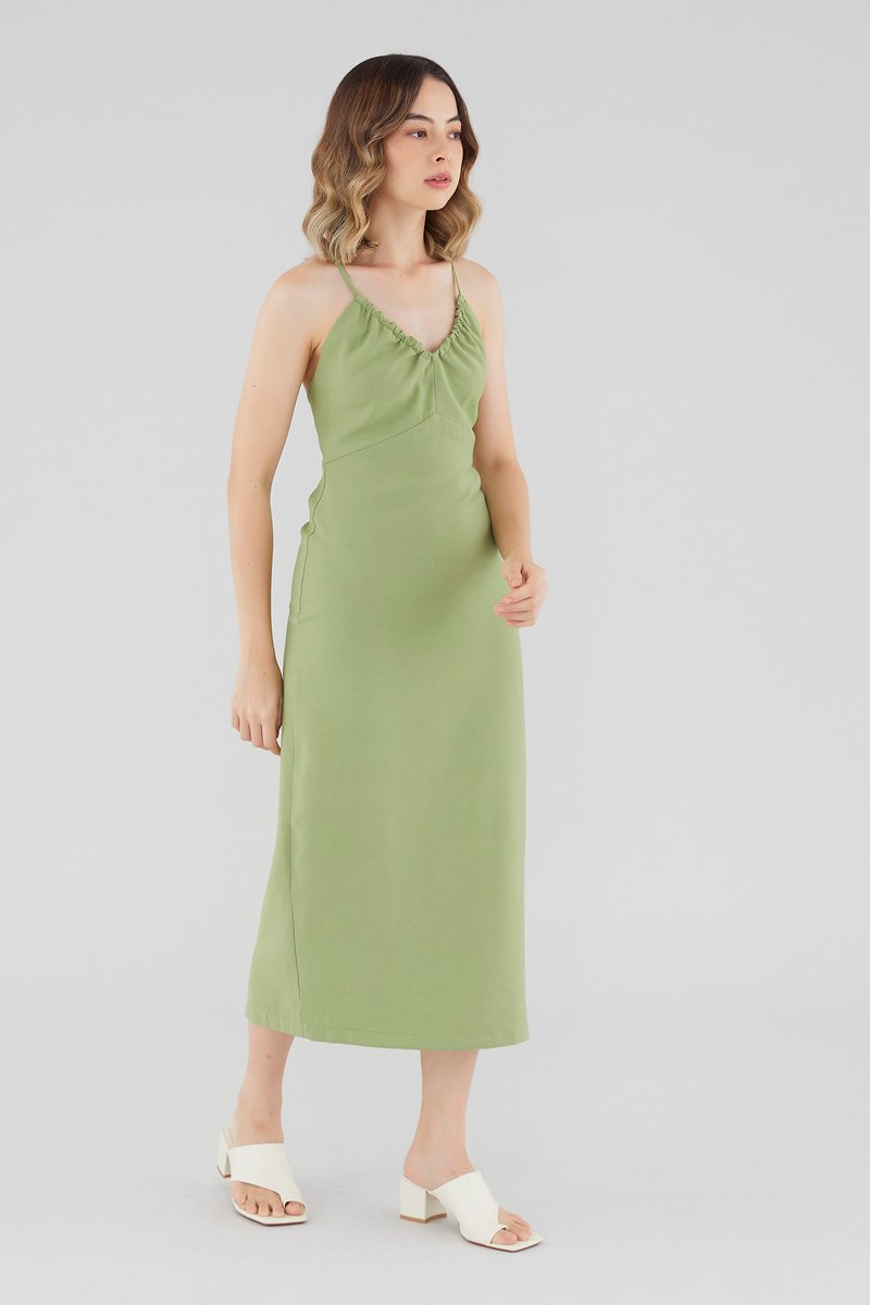 Keep it sleek. Cut from smooth fabric with a structured drape, this sleeveless midi dress features a ruched, V-shaped drawstring neckline, slim back-tie shoulder straps, a back skirt slit and a back zip. Worn in a slim fit.