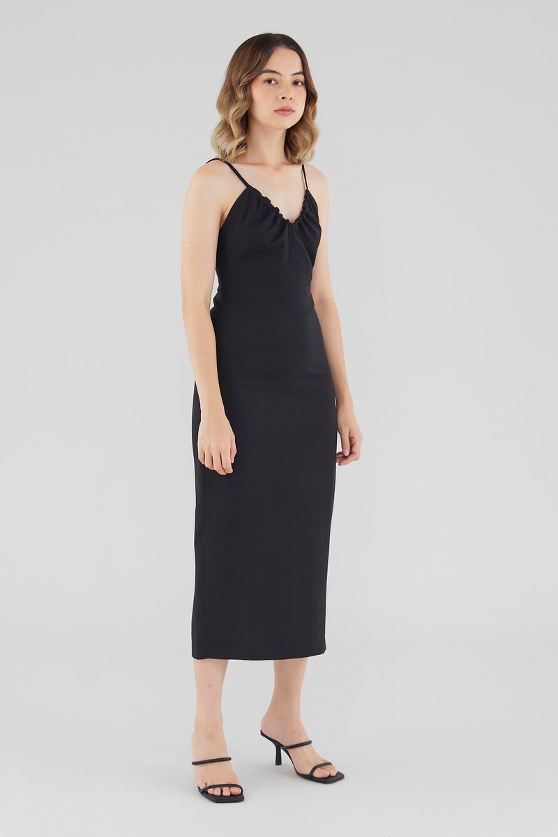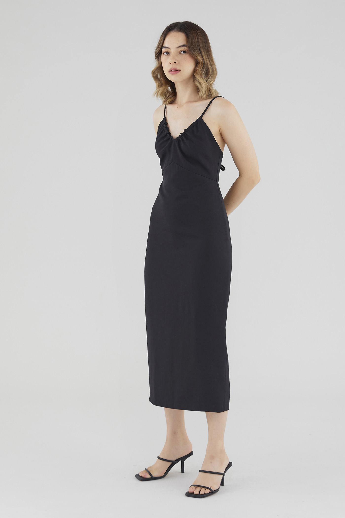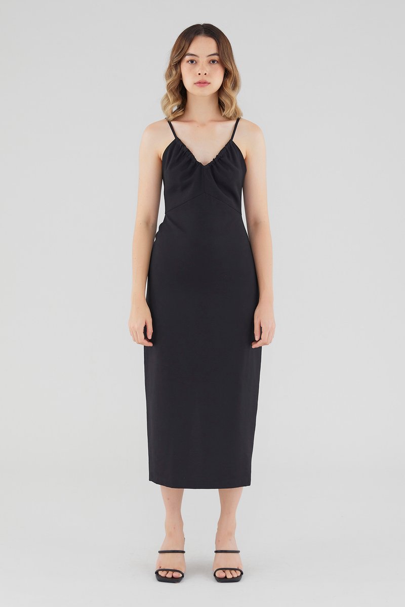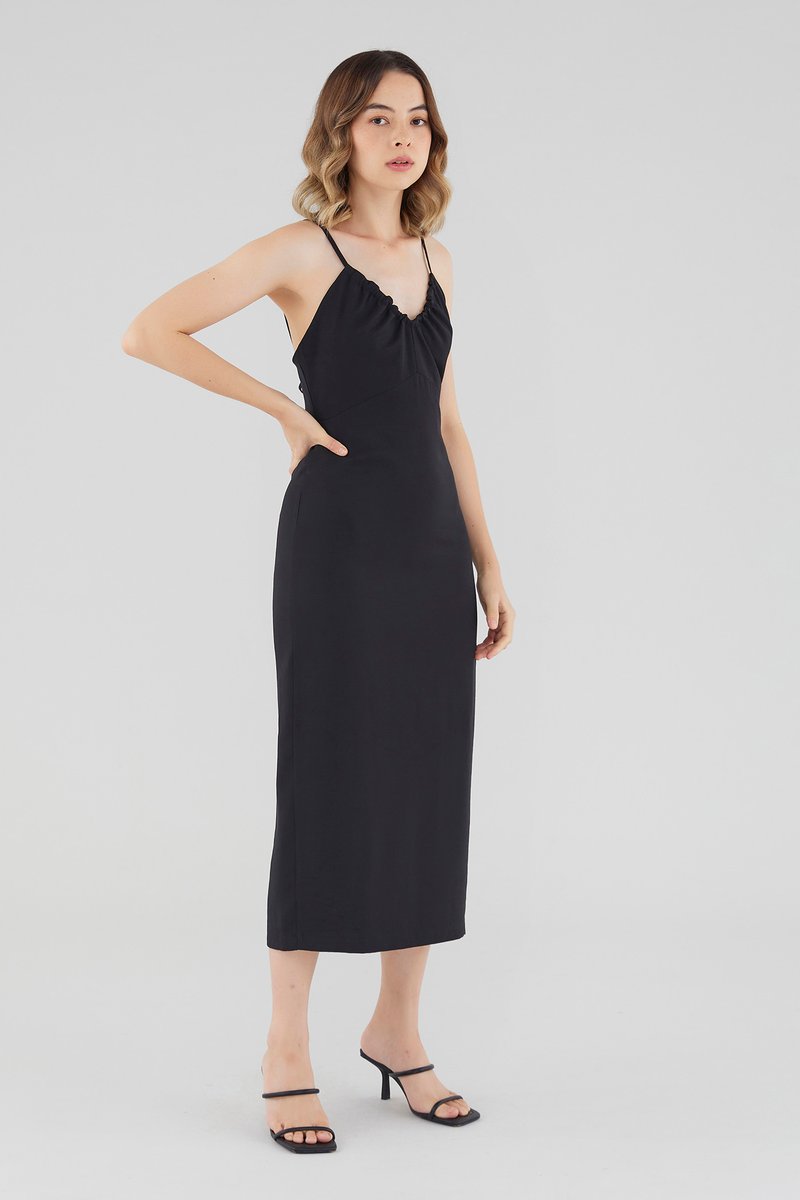 Keep it sleek. Cut from smooth fabric with a structured drape, this sleeveless midi dress features a ruched, V-shaped drawstring neckline, slim back-tie shoulder straps, a back skirt slit and a back zip. Worn in a slim fit.