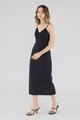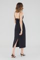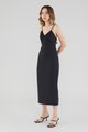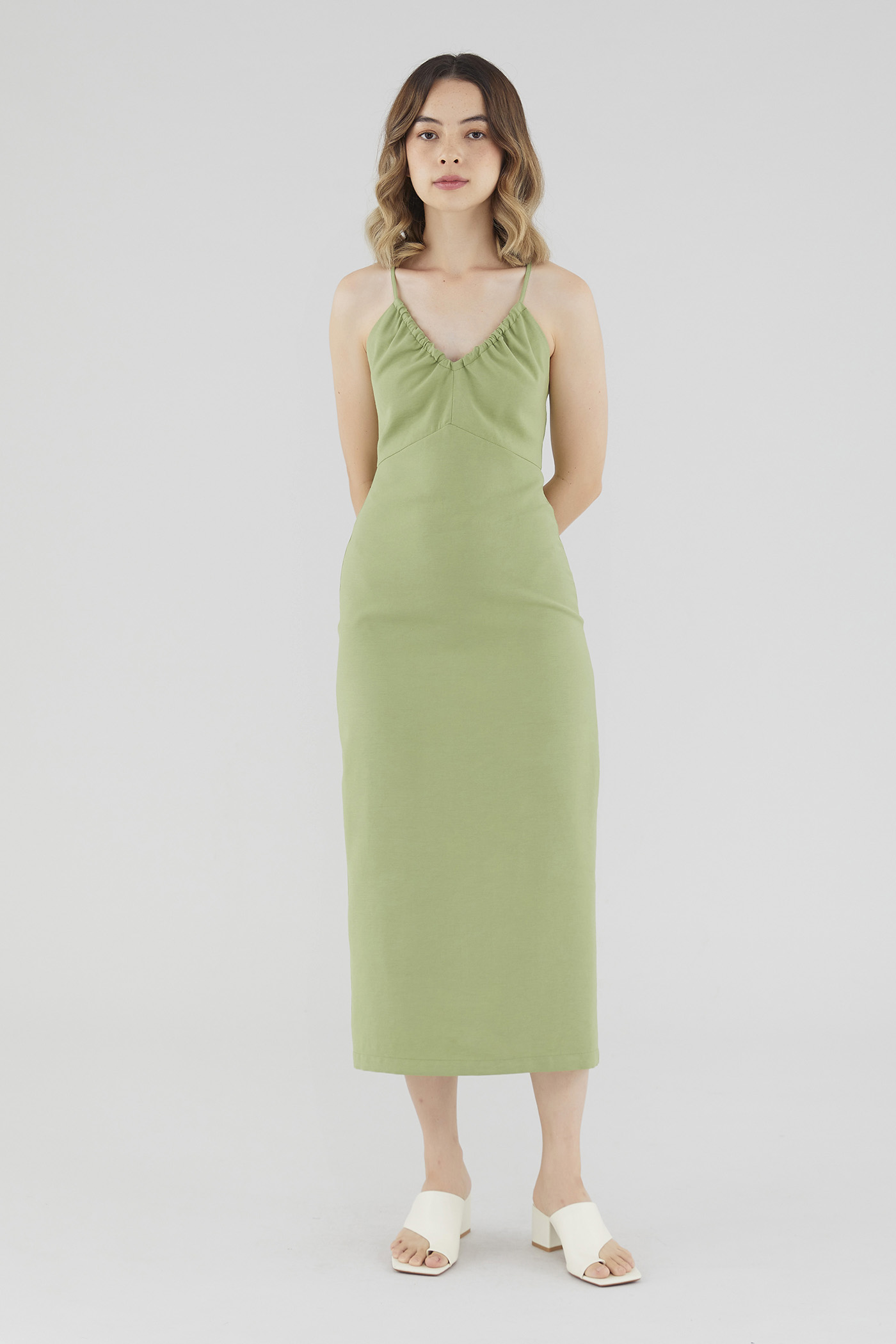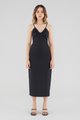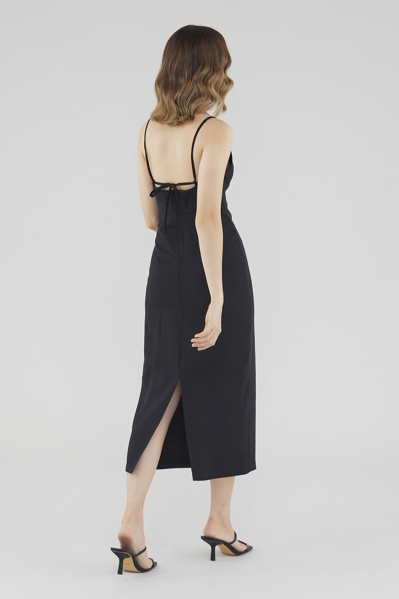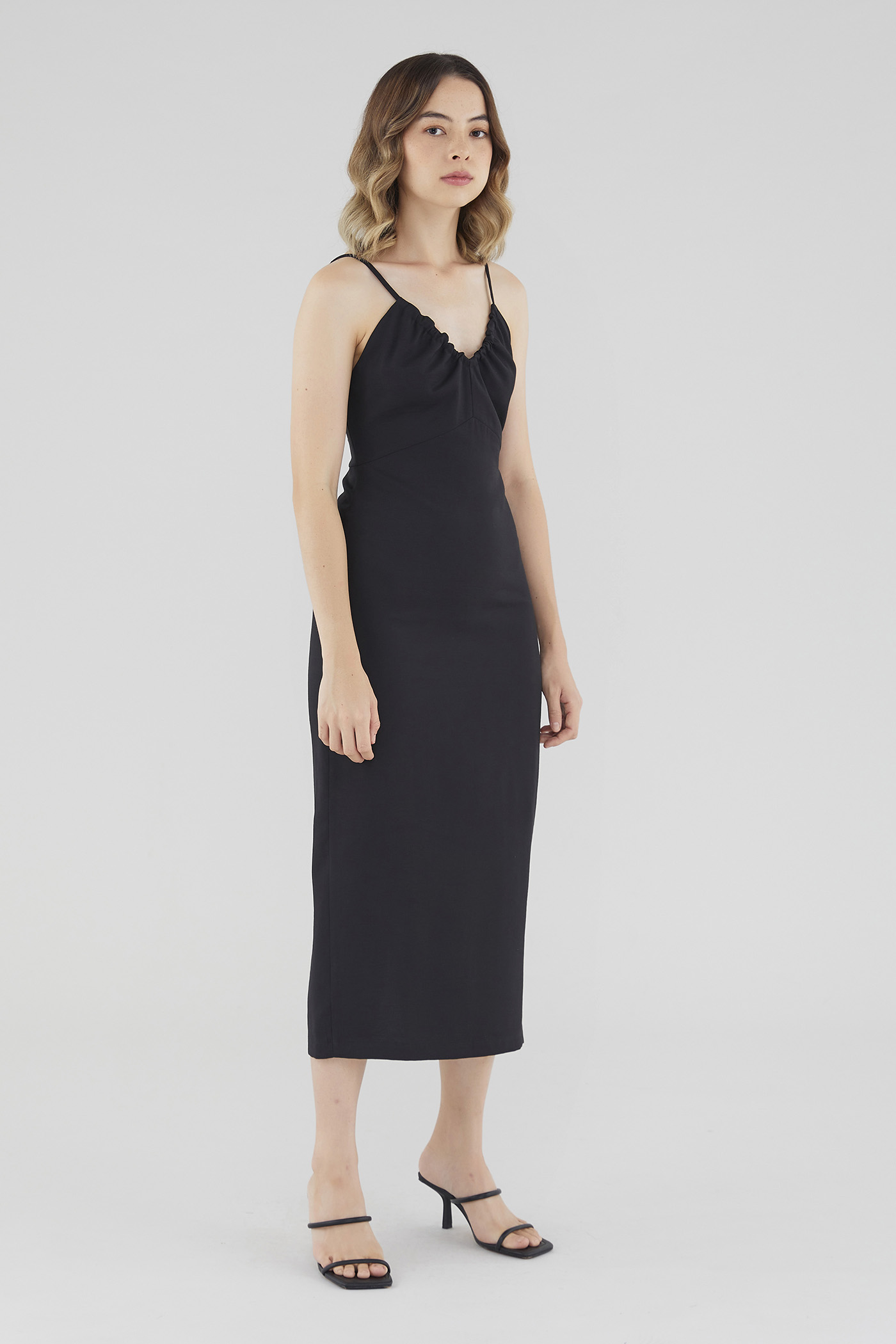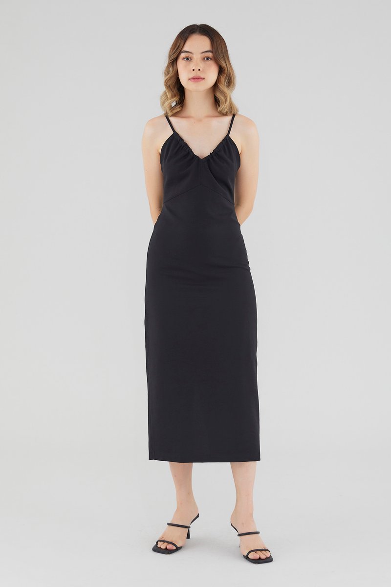 Keep it sleek. Cut from smooth fabric with a structured drape, this sleeveless midi dress features a ruched, V-shaped drawstring neckline, slim back-tie shoulder straps, a back skirt slit and a back zip. Worn in a slim fit.