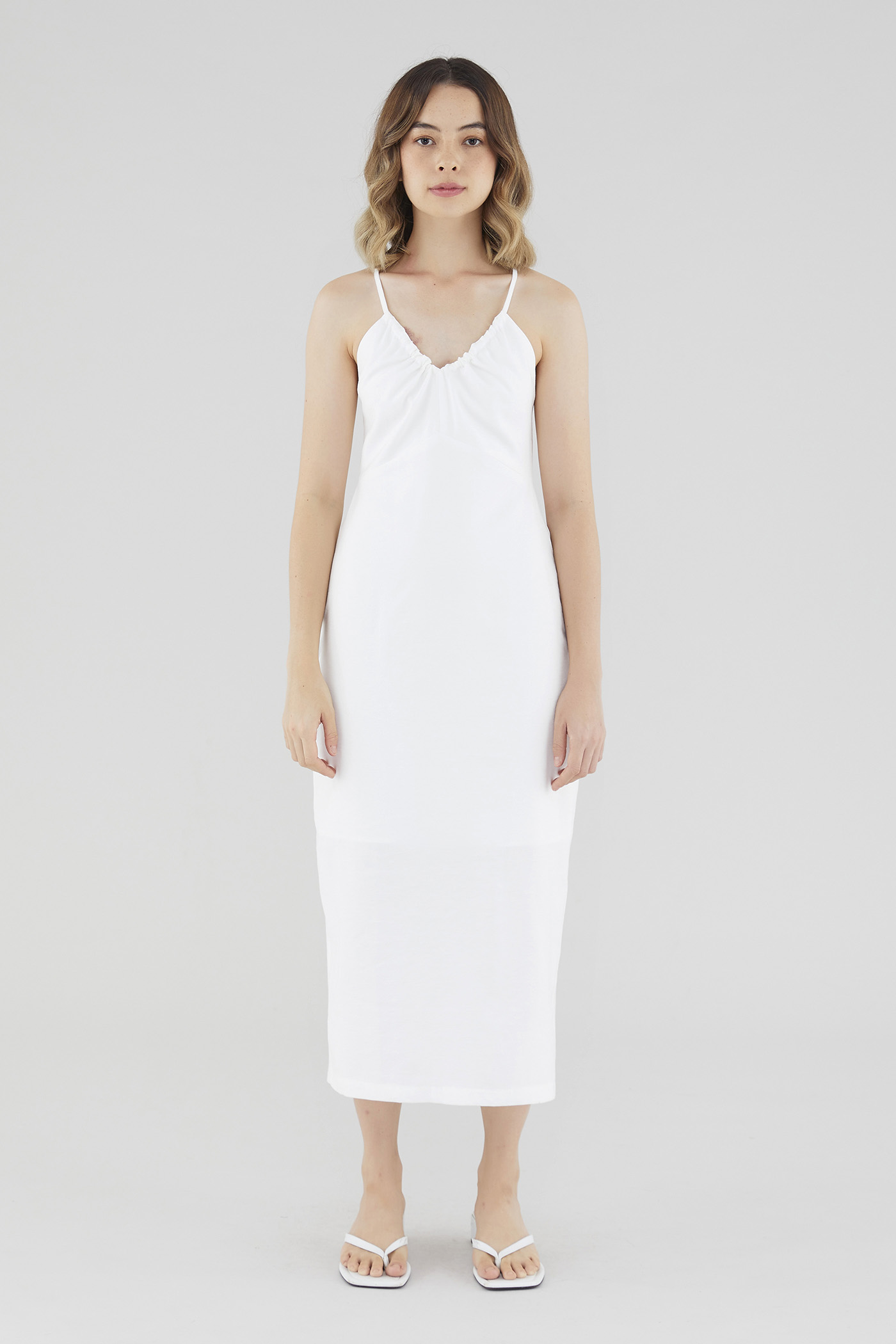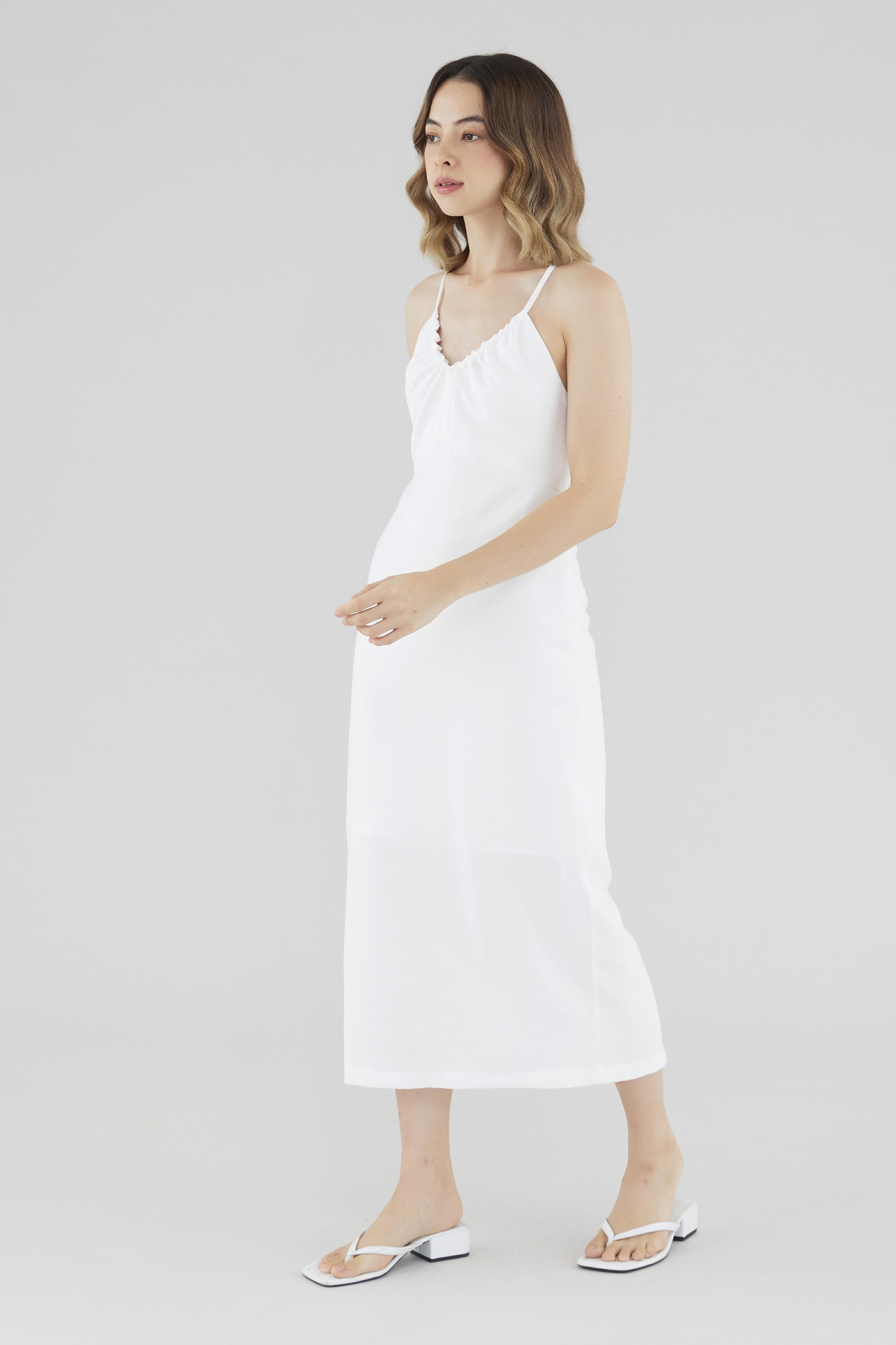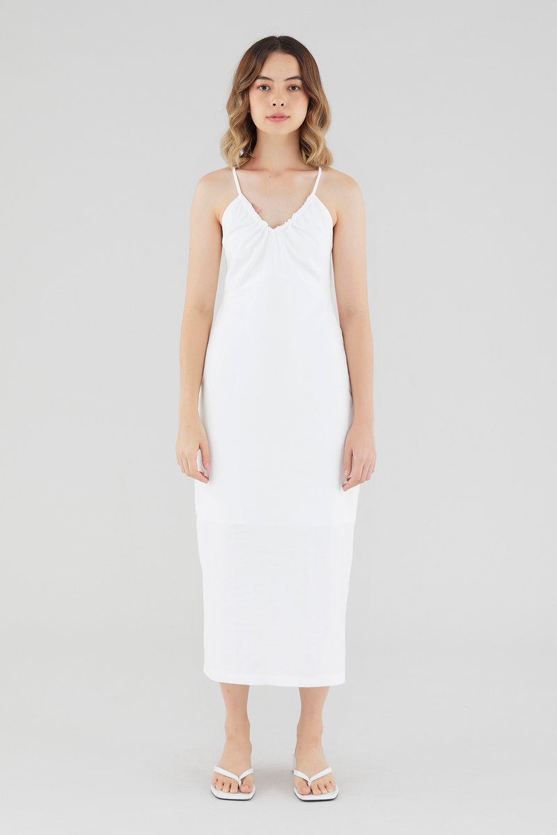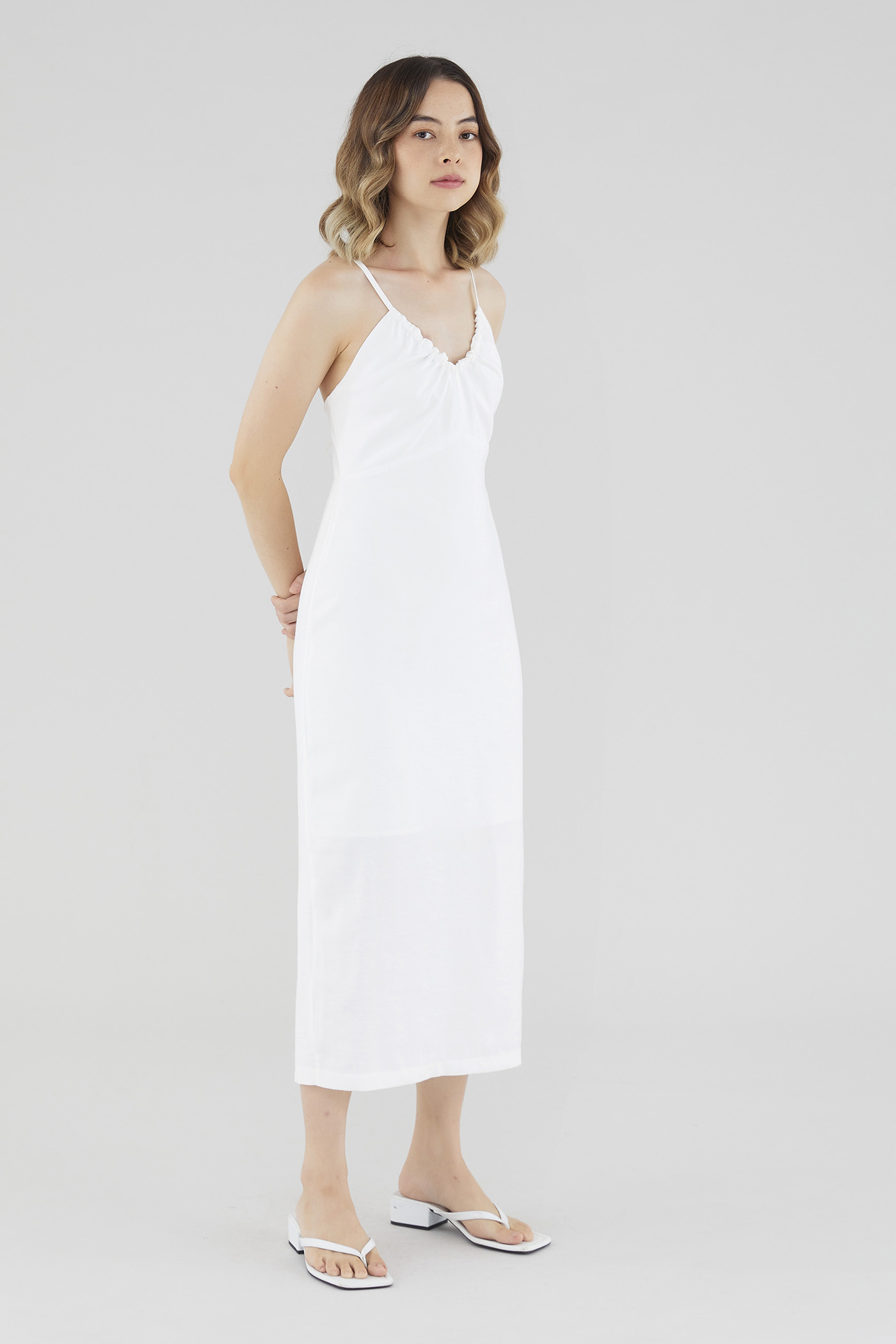 Keep it sleek. Cut from smooth fabric with a structured drape, this sleeveless midi dress features a ruched, V-shaped drawstring neckline, slim back-tie shoulder straps, a back skirt slit and a back zip. Worn in a slim fit.