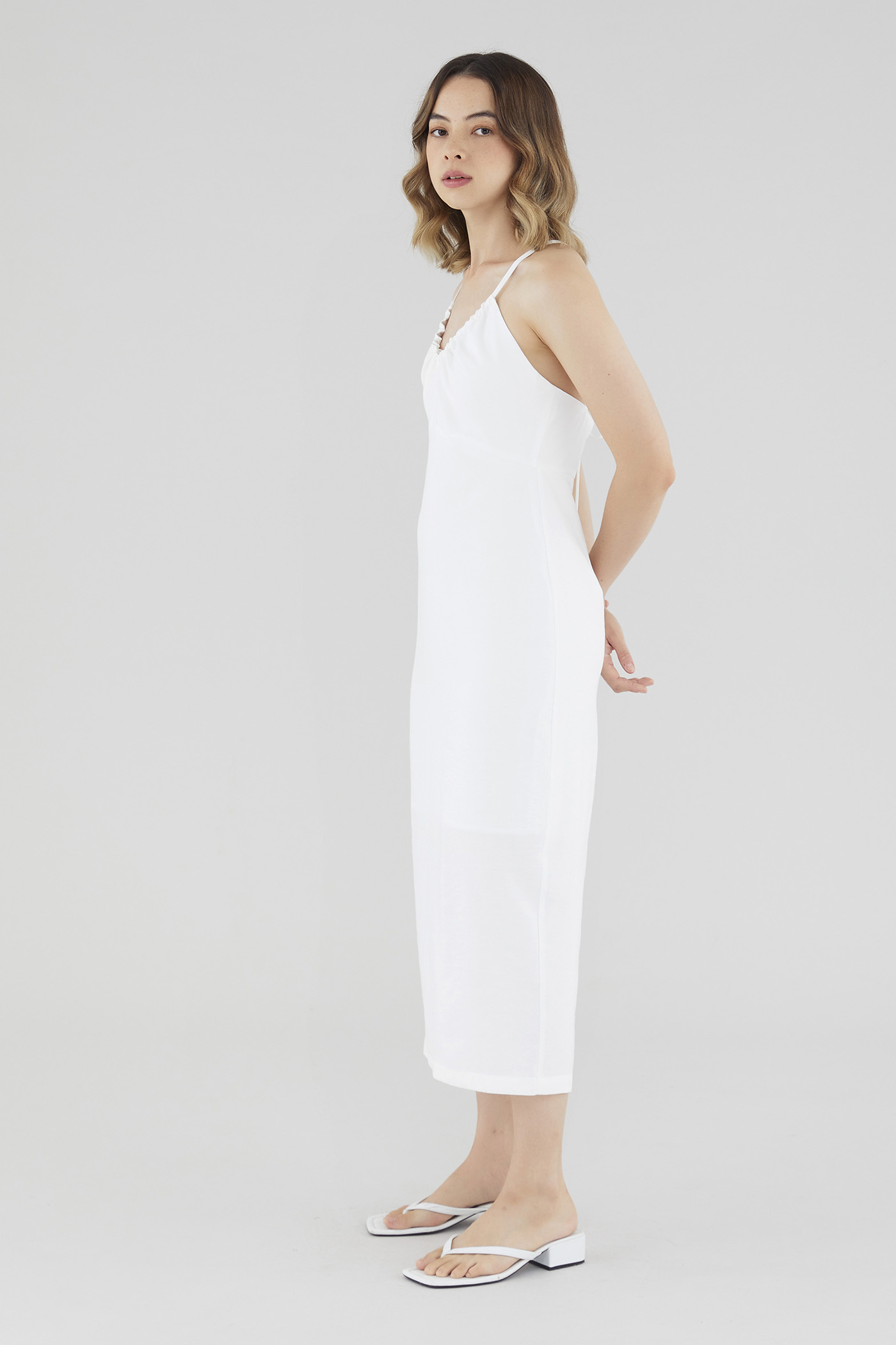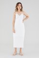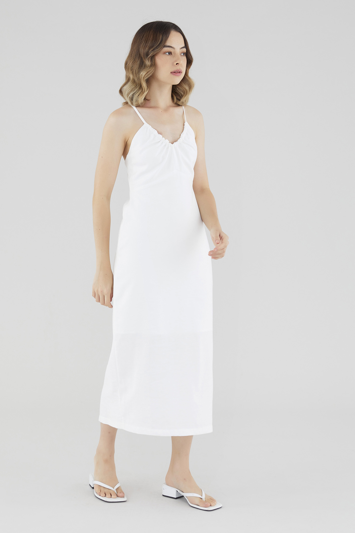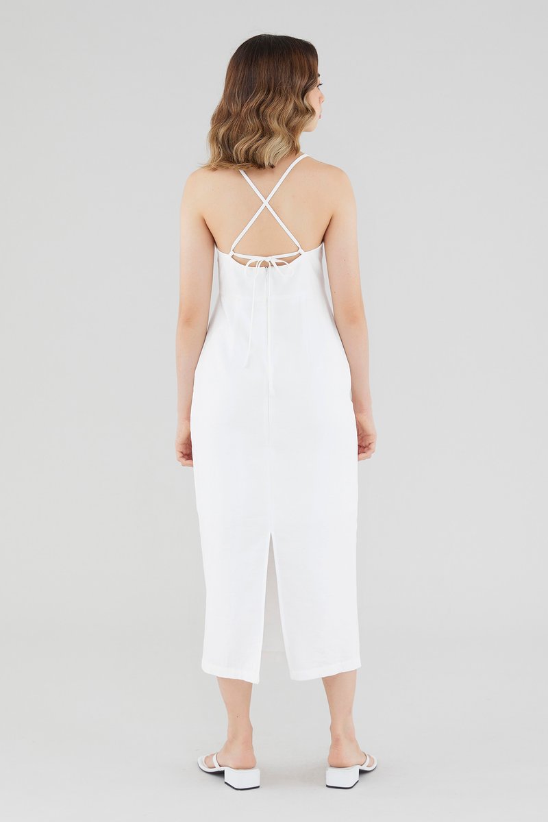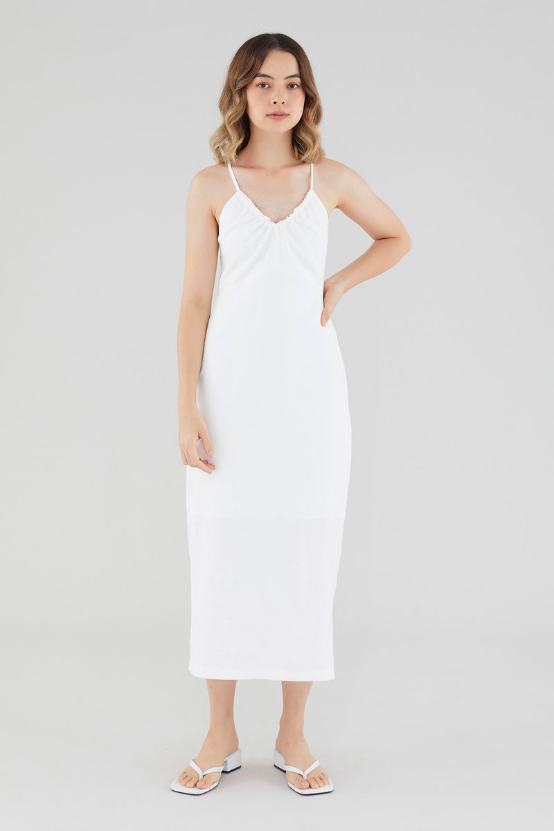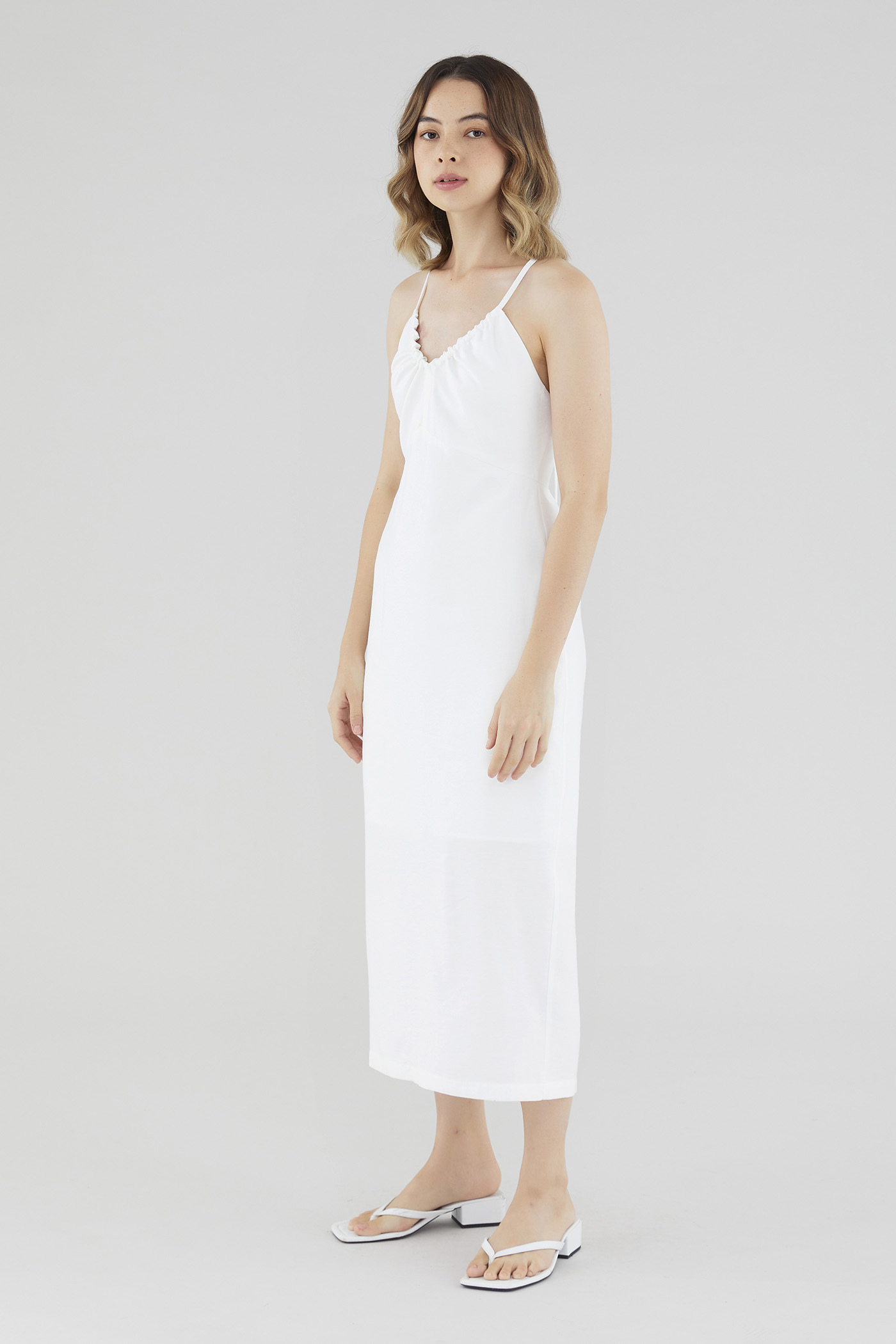 Keep it sleek. Cut from smooth fabric with a structured drape, this sleeveless midi dress features a ruched, V-shaped drawstring neckline, slim back-tie shoulder straps, a back skirt slit and a back zip. Worn in a slim fit.