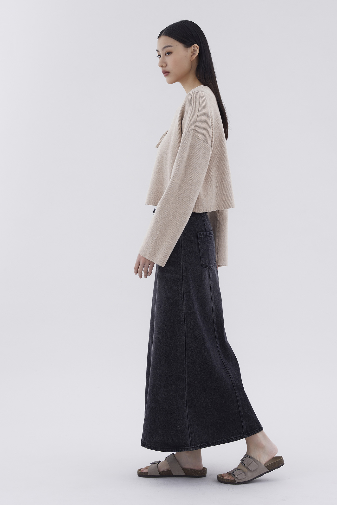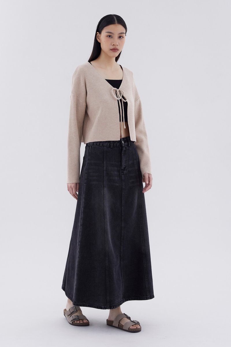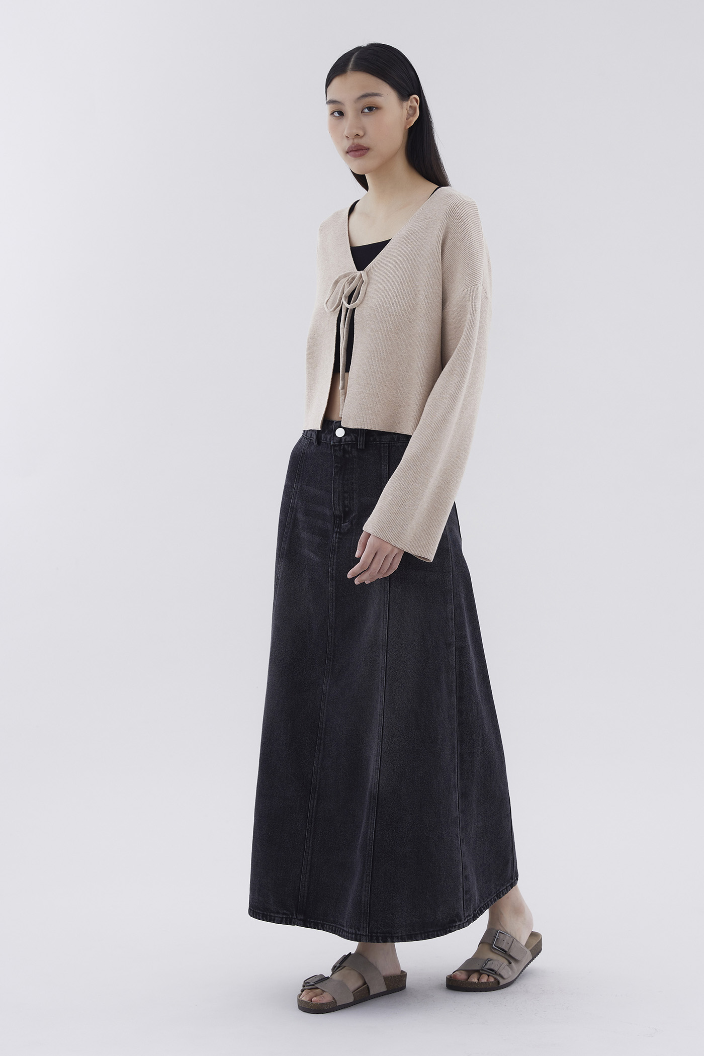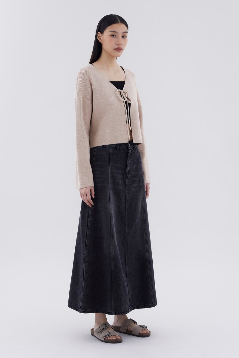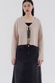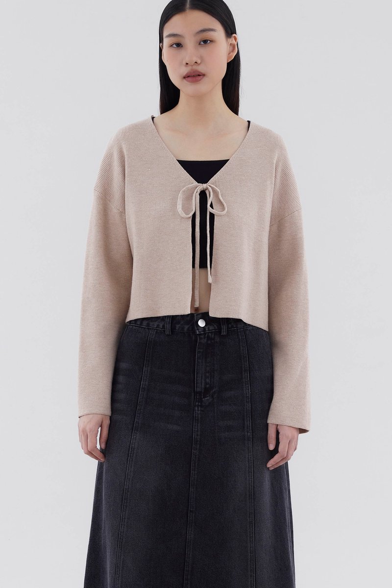 In case of a slight chill. Made from cosy and stretchy knit, this cardigan features an open front, a round neckline with tie-straps and long, relaxed sleeves. Worn in a cropped length.