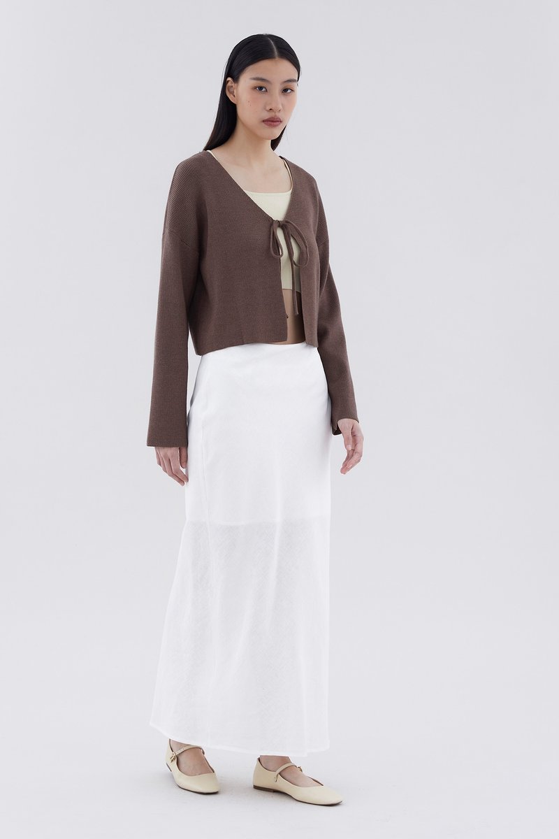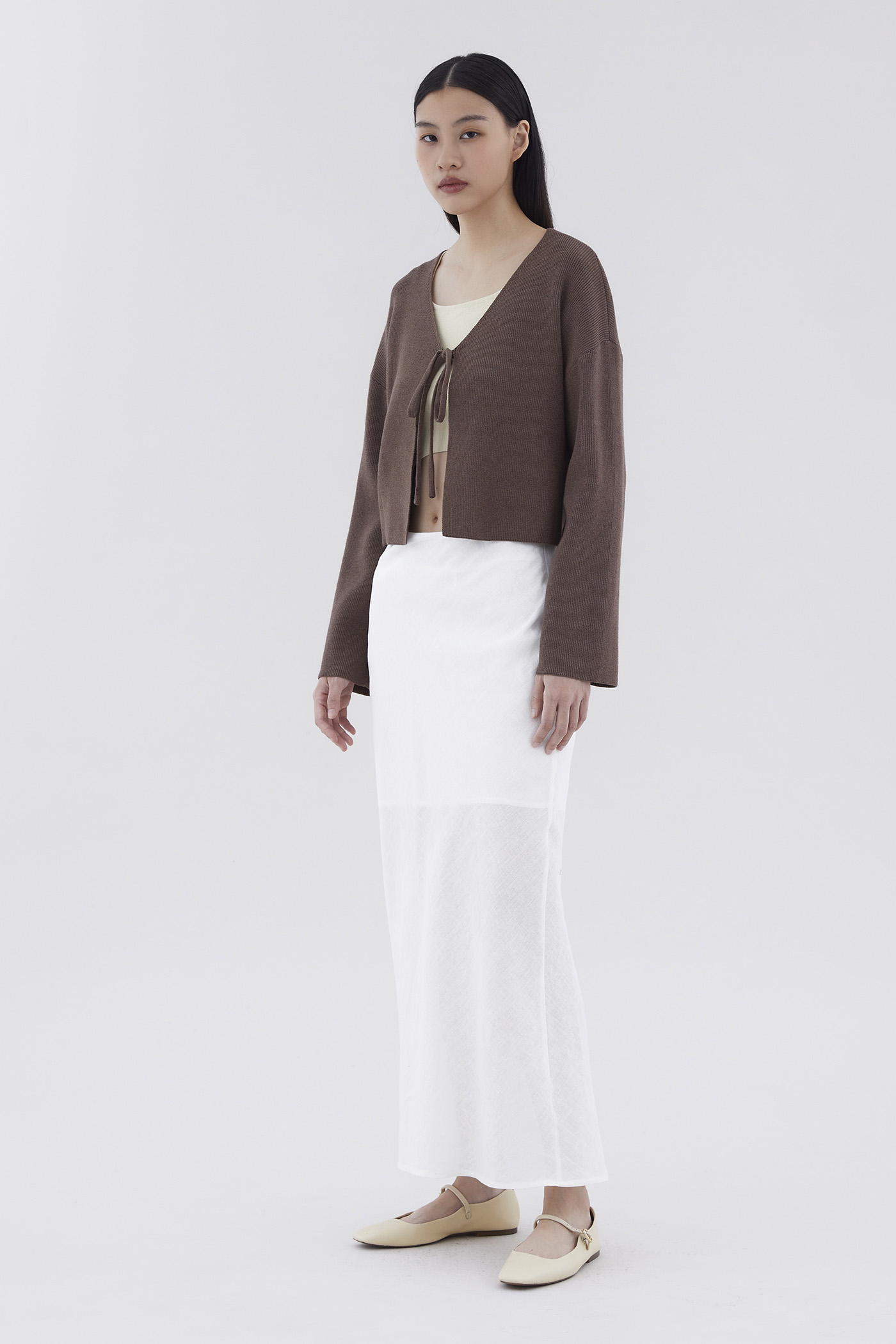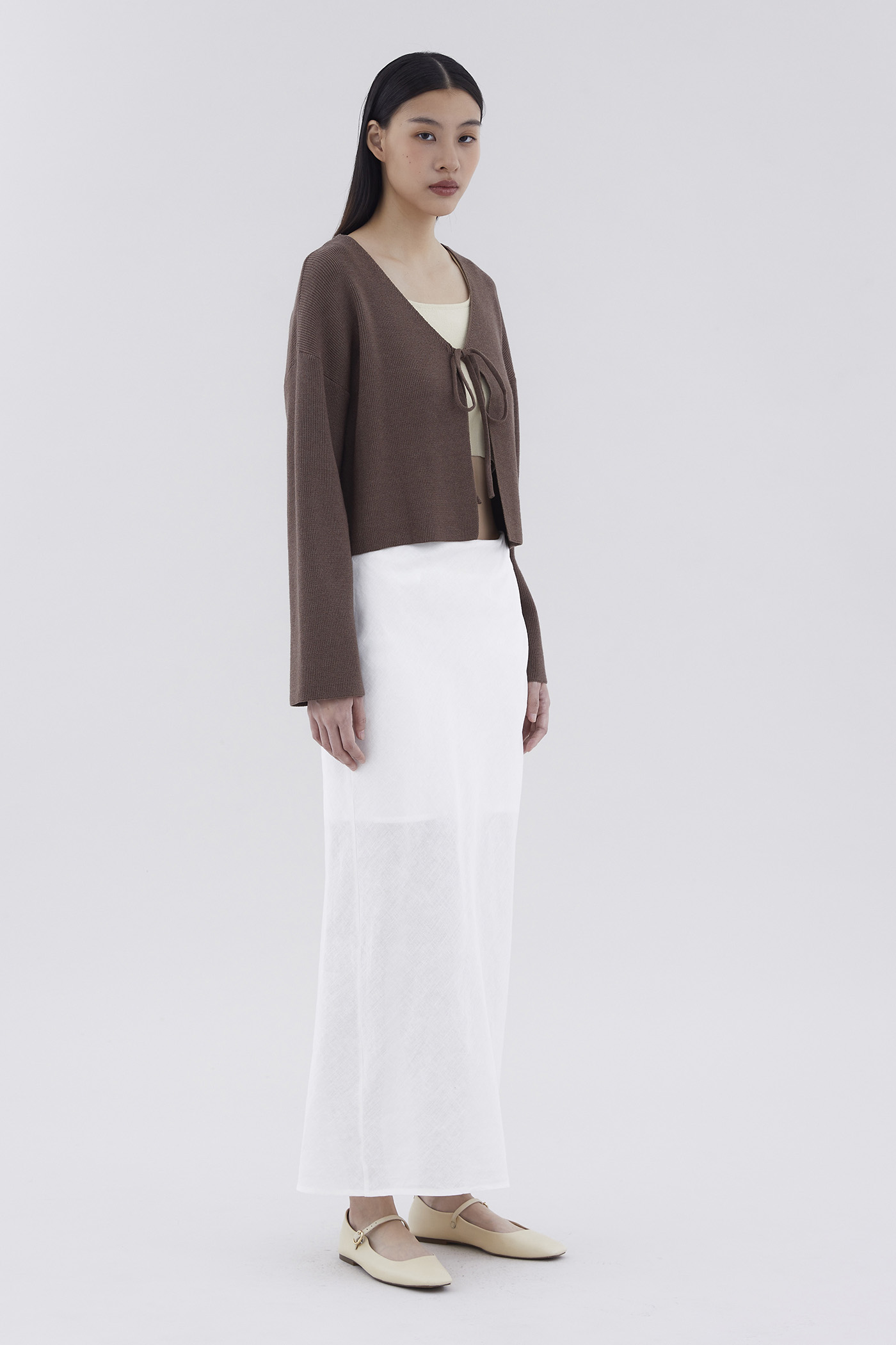 In case of a slight chill. Made from cosy and stretchy knit, this cardigan features an open front, a round neckline with tie-straps and long, relaxed sleeves. Worn in a cropped length.