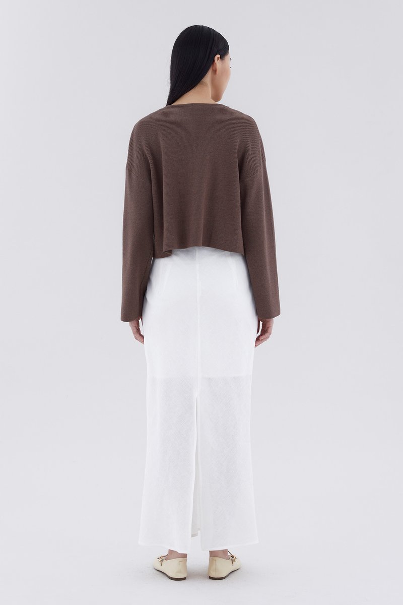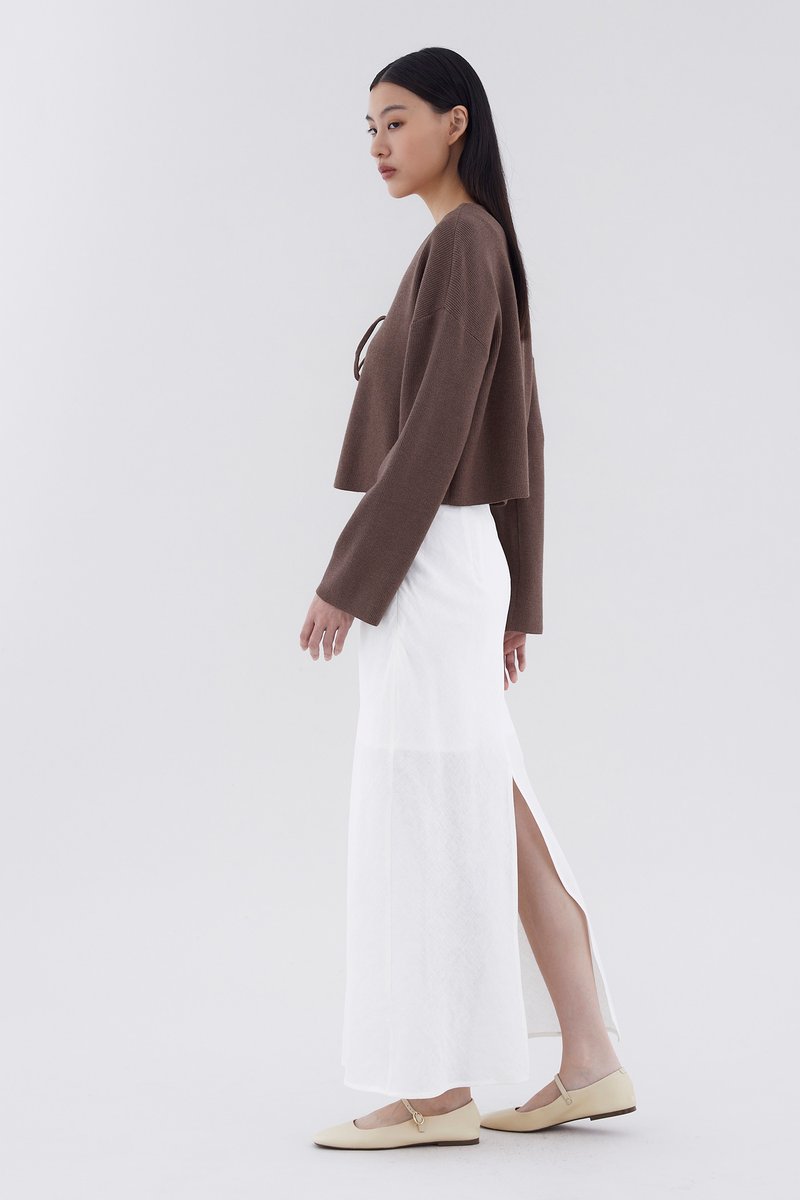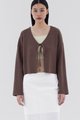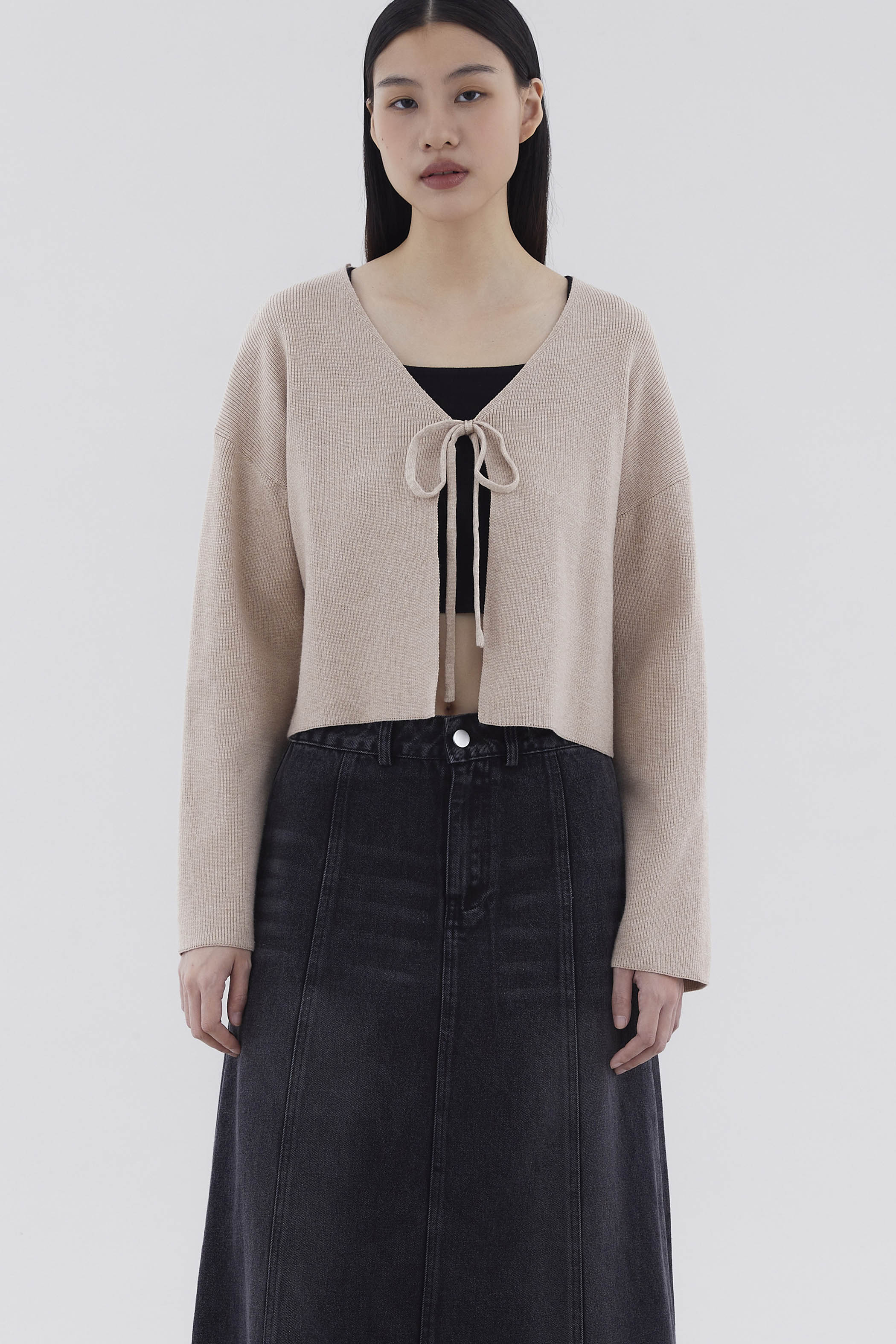 In case of a slight chill. Made from cosy and stretchy knit, this cardigan features an open front, a round neckline with tie-straps and long, relaxed sleeves. Worn in a cropped length.